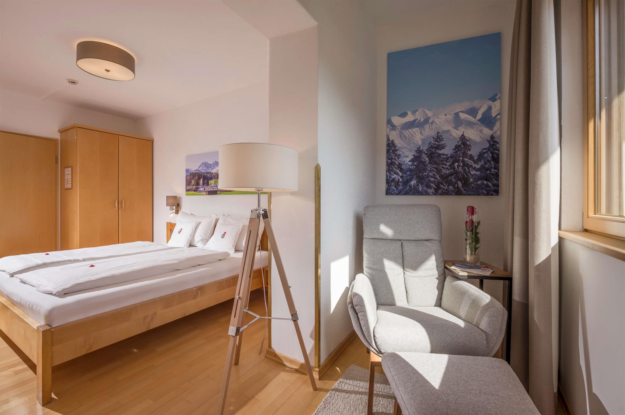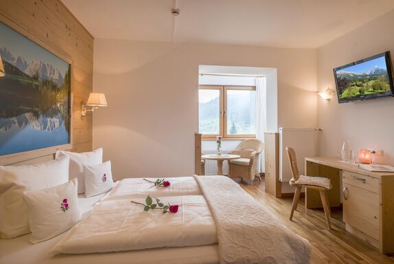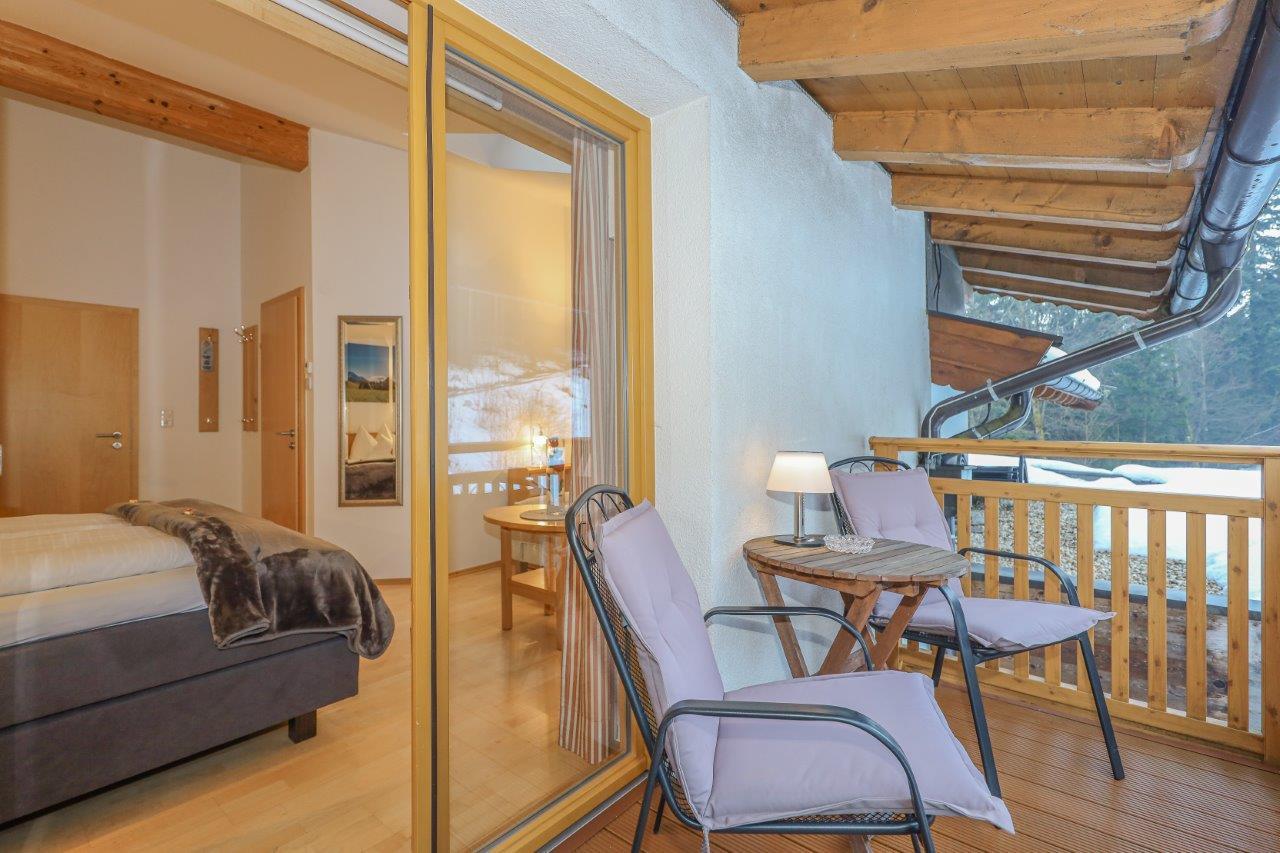• Zimmer mit Loggia haben eine gemütliche Sitzecke mit herrlichem Bergblick, Zimmer Waldseite haben einen Balkon