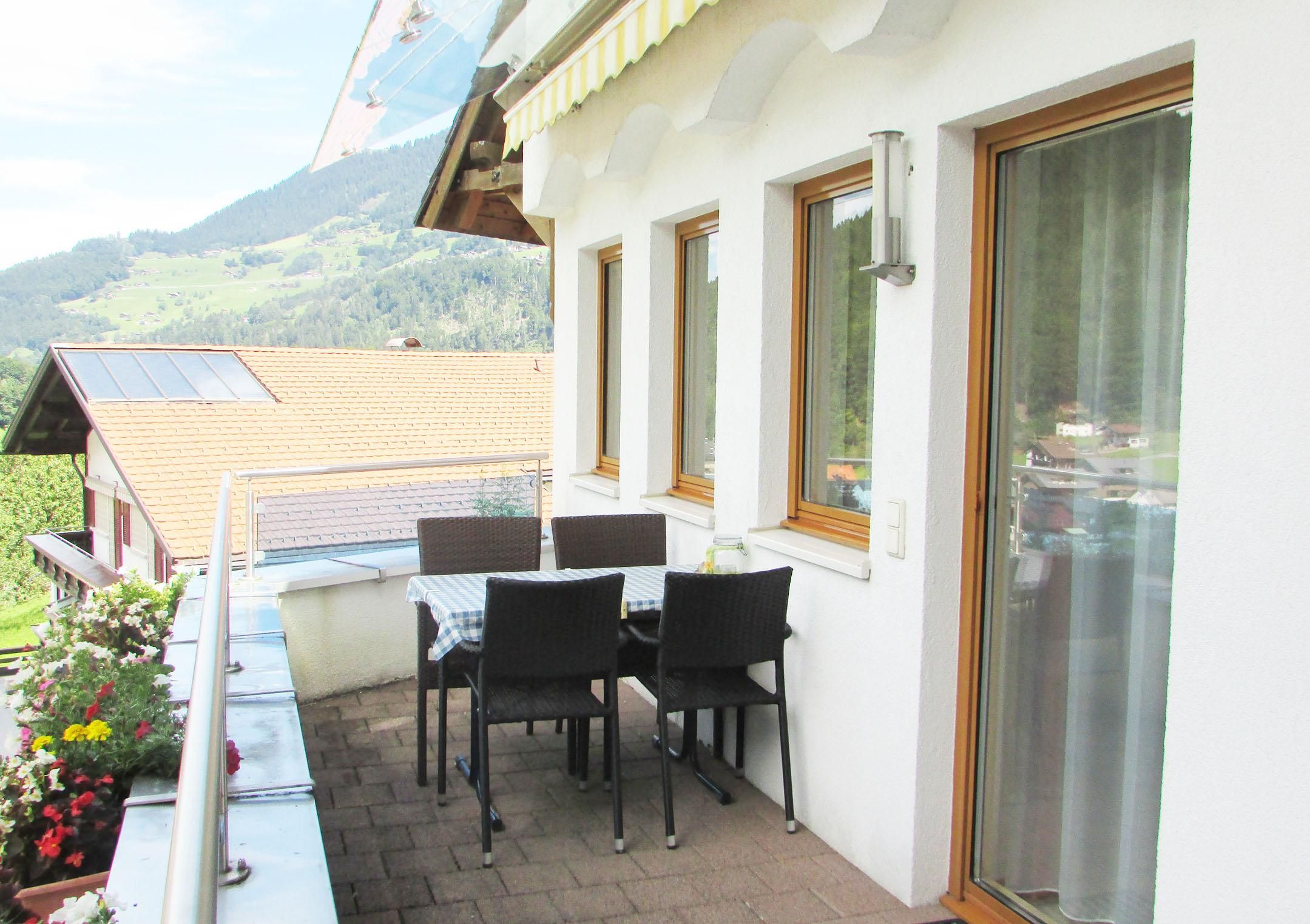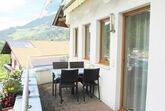 Terrasse mit Sitzgelegenheit und Bergblick, direkter Zugang zum Garten.