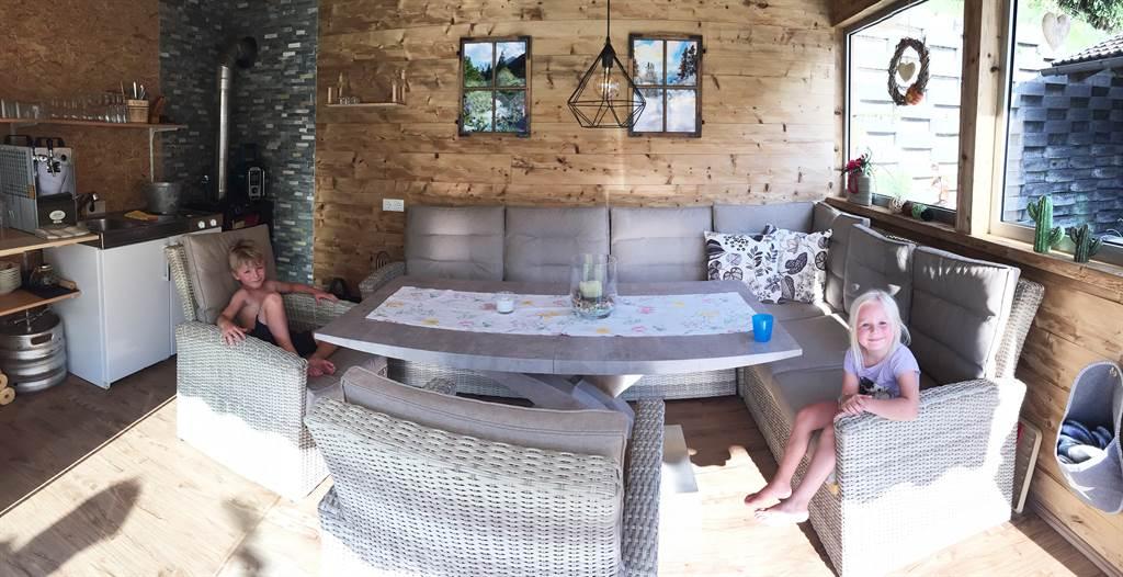 überdachtem Pavillon mit Sitzgruppe, Liegestühle und Sonnenschirm, Kinderspielplatz