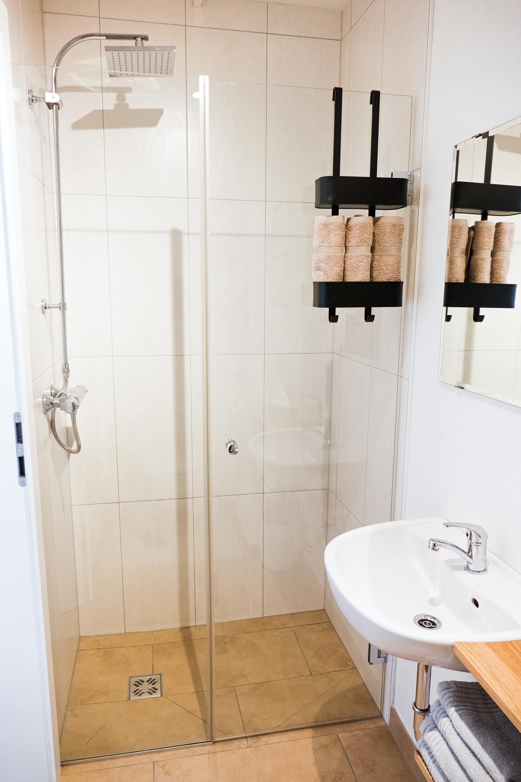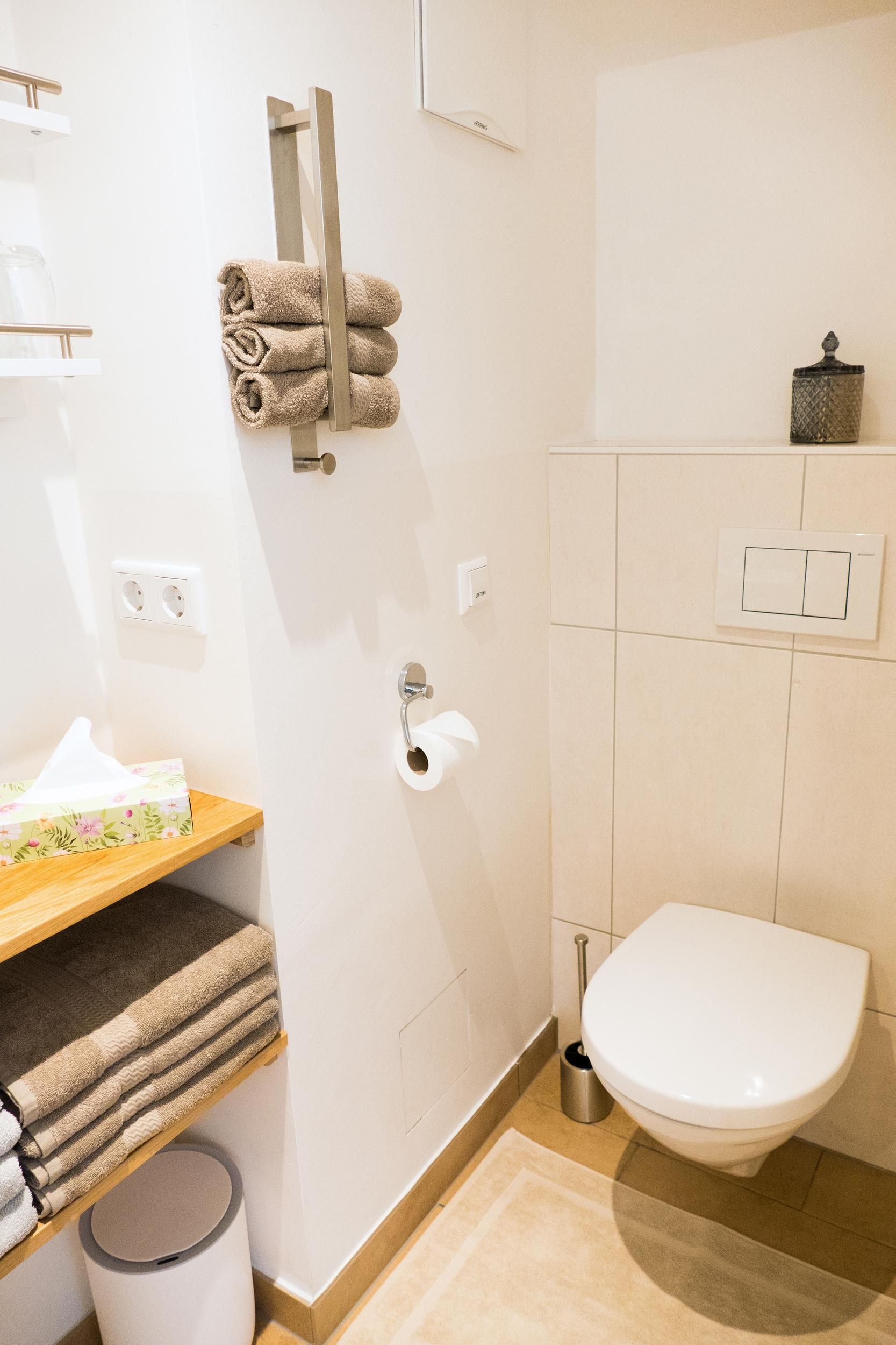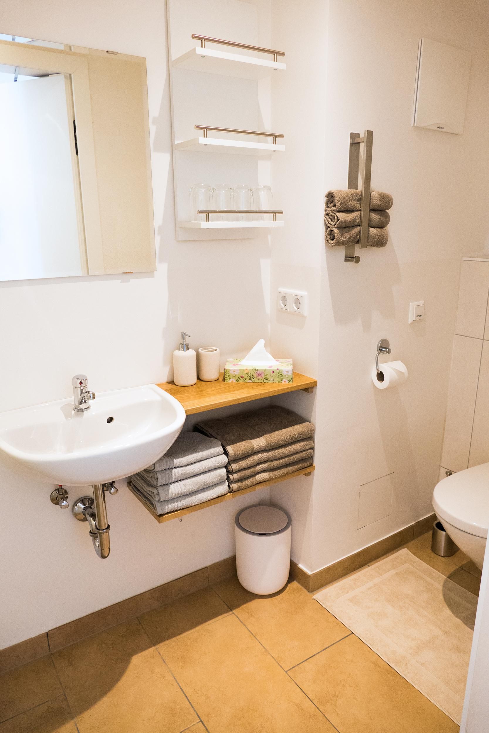 Das kleine aber funktionelle Badezimmer hat einen Handtuchtrockner. Ein separater Spiegel mit Fönstation befindet sich ebenfalls im Appartement.