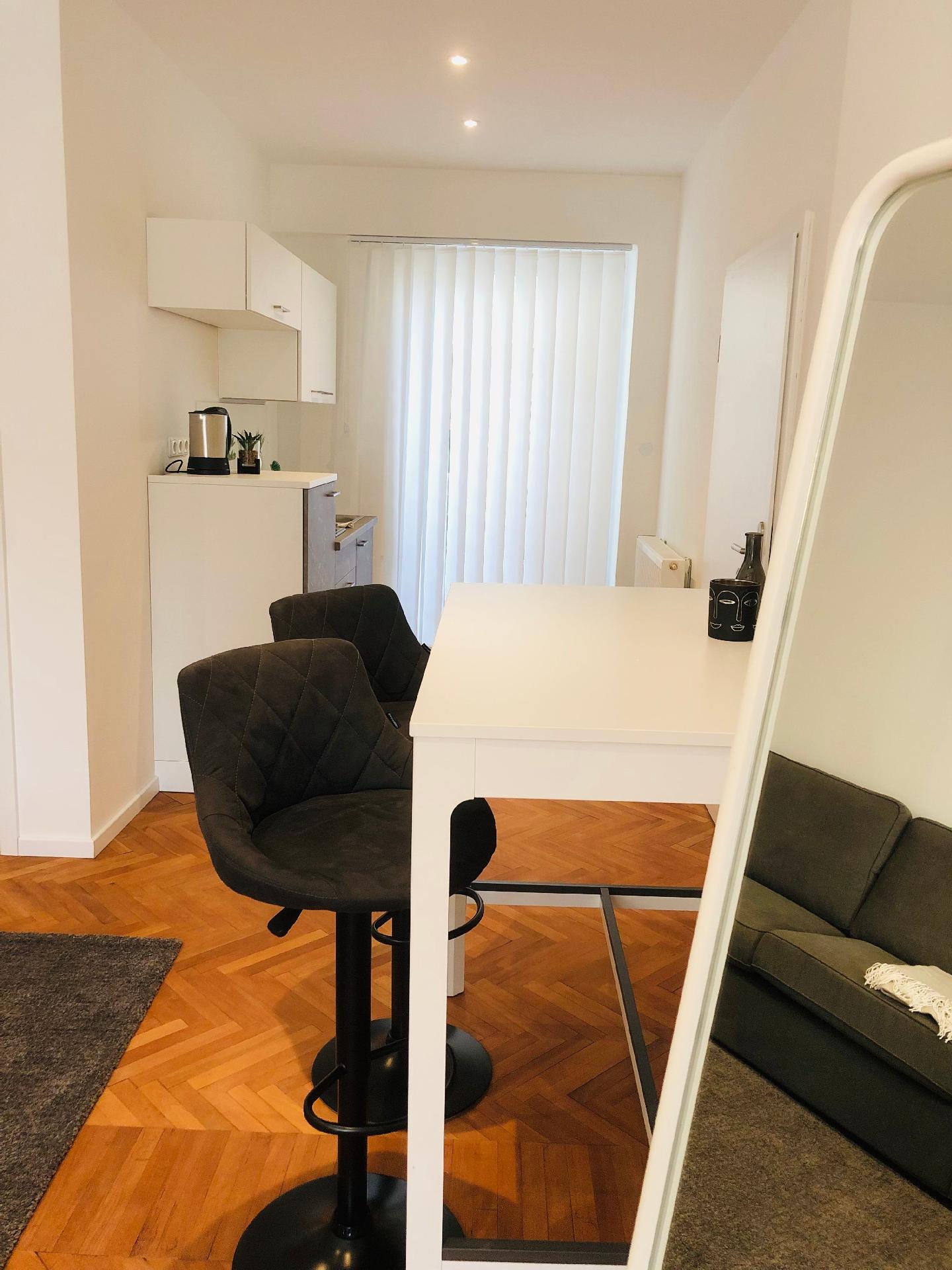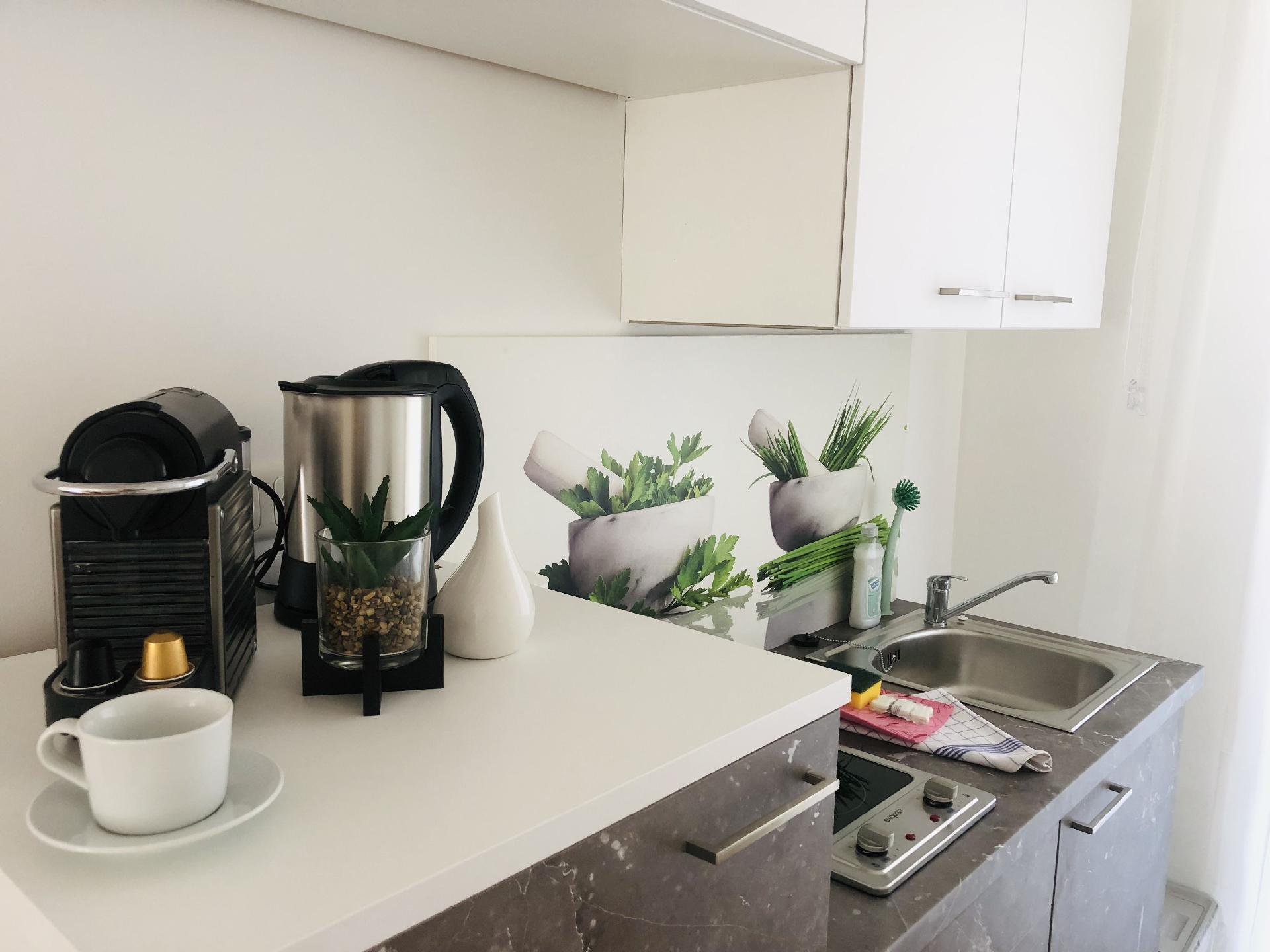 In der Innenausstattung des Apartments spiegelt sich Funktionalität und Bequemlichkeit wider. Die gut ausgerüstete Küche verfügt über eine praktische Kapsel-Kaffeemaschine und Espressokanne, ideal für den morgendlichen Kaffeegenuss, sowie über eine Spülmaschine und einen Wasserkocher, um den Aufenthalt so angenehm wie möglich zu gestalten. Die Bereitstellung kostenfreien W-LANs und eines Fernsehers sorgt für unterhaltsame und vernetzte Momente innerhalb der gemütlichen vier Wände.