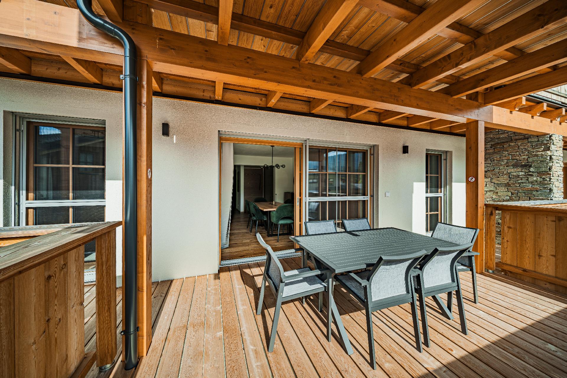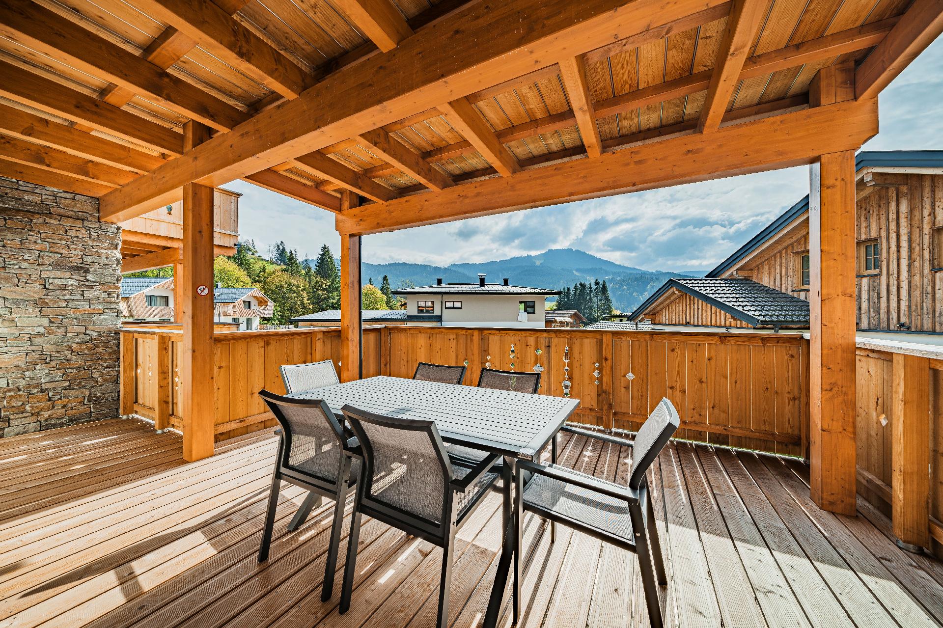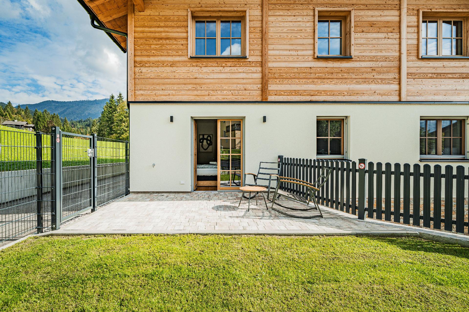 Der Außenbereich lädt mit einer ansprechenden Terrasse dazu ein, die frische Bergluft zu genießen und gemeinsame Stunden unter freiem Himmel zu verbringen. Ob bei einem Frühstück mit Blick auf die malerische Landschaft oder bei einem entspannenden Drink am Abend – die Terrasse bietet den idealen Rahmen, um die natürliche Schönheit der Umgebung aufzusaugen.