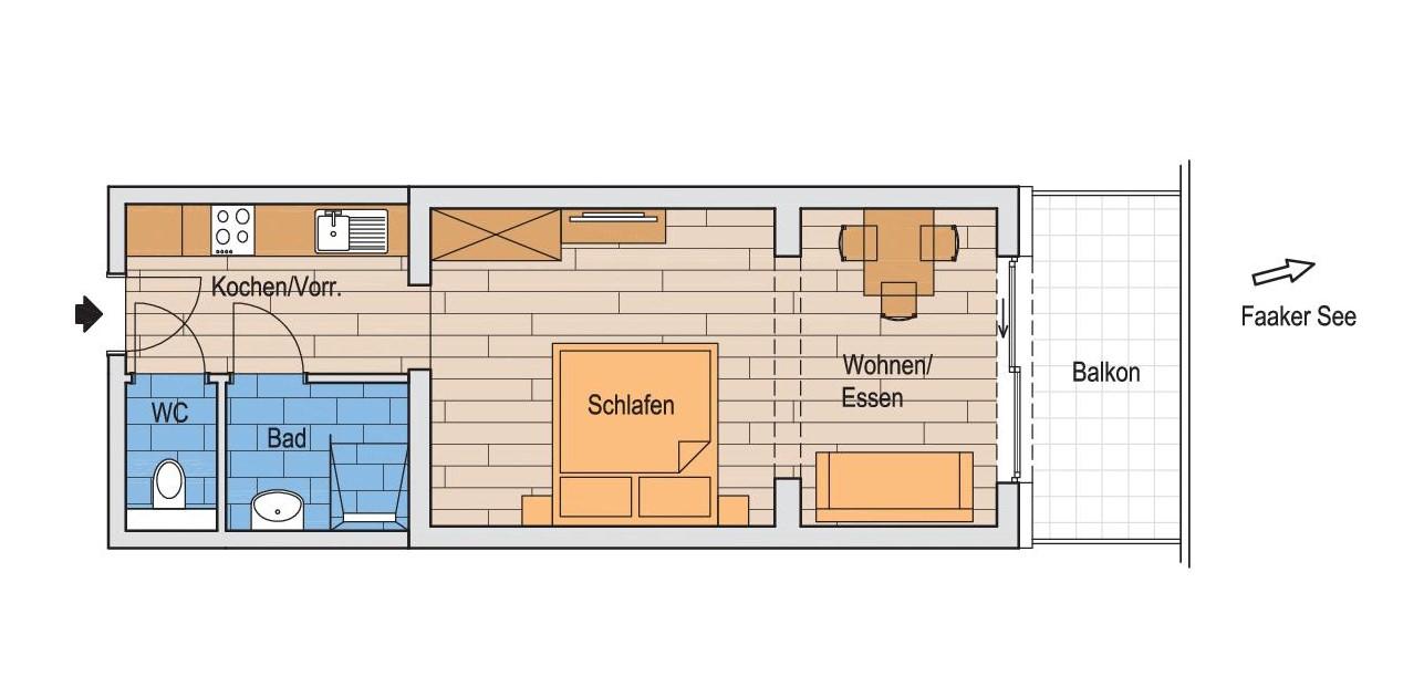 2 Schlafräume, 1 Wohnraum, Kochnische - komplett eingerichtet, Dusche WC, Sat-TV, gratis WLAN und Balkon. Bade- und Handtücher, Bett und Tischwäsche sind vorhanden. Eigener Badestrand!