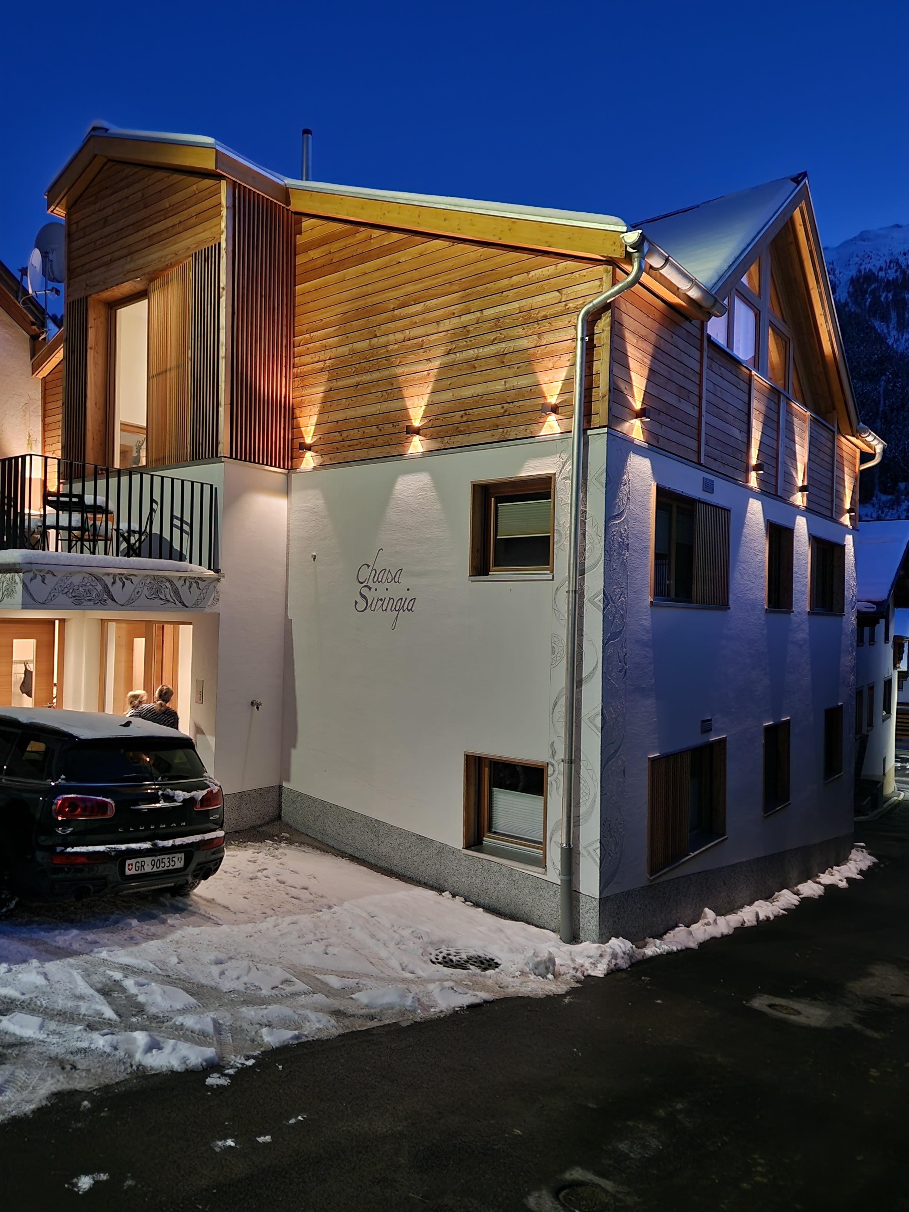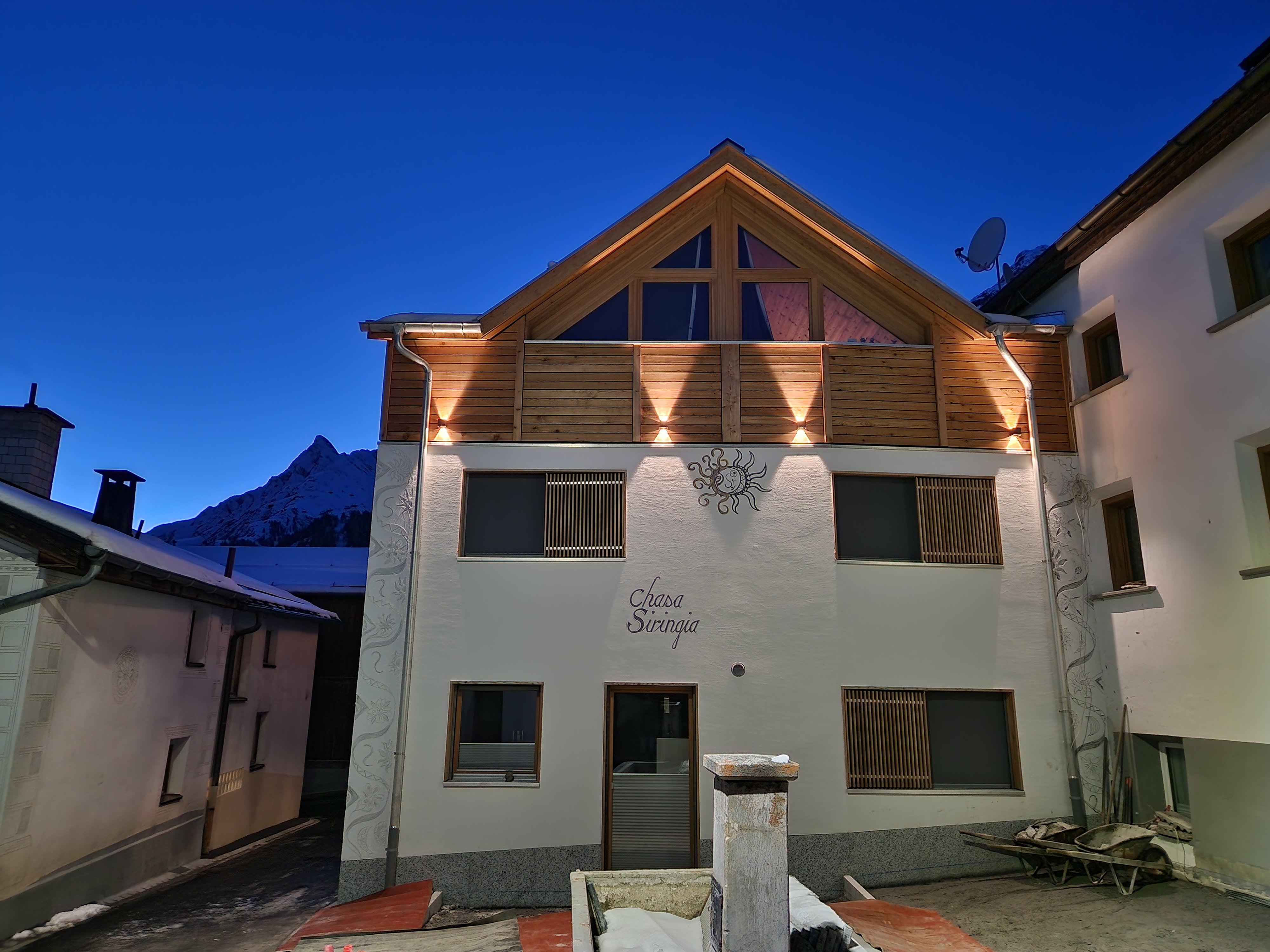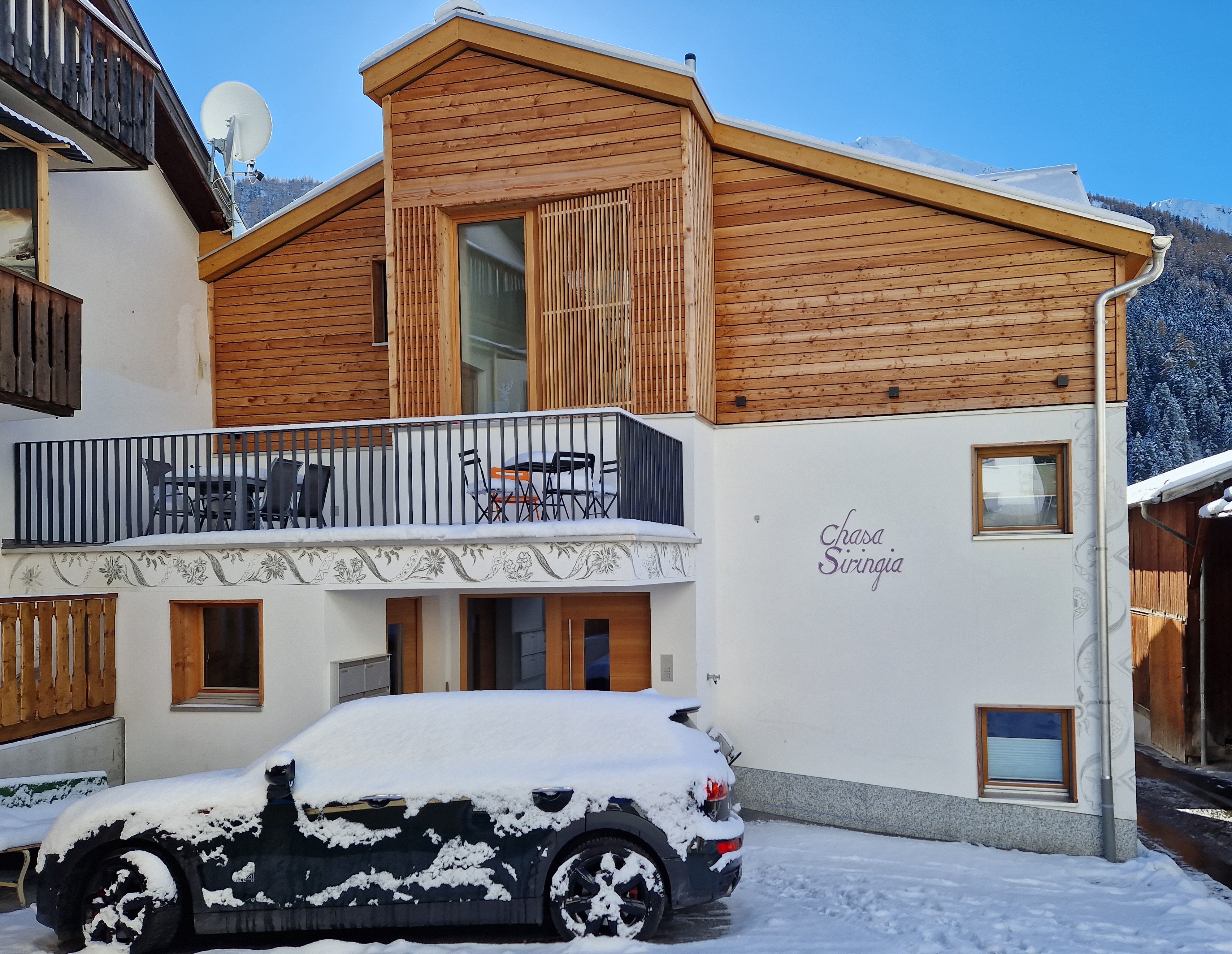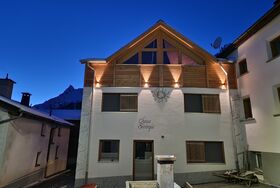 Unser Ferienhaus steht mitten im idyllischen Dorf Laret beim Dorfbrunnen.