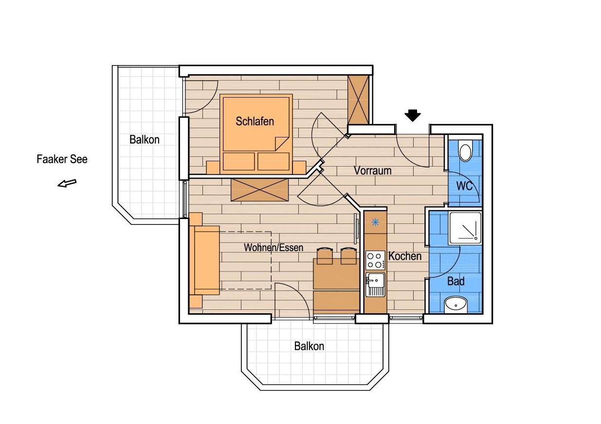 2 Schlafräume, 1 Wohnraum, Kochnische - komplett eingerichtet, Dusche WC, Sat-TV, gratis WLAN und Balkon. Bade- und Handtücher, Bett und Tischwäsche sind vorhanden. Eigener Badestrand!