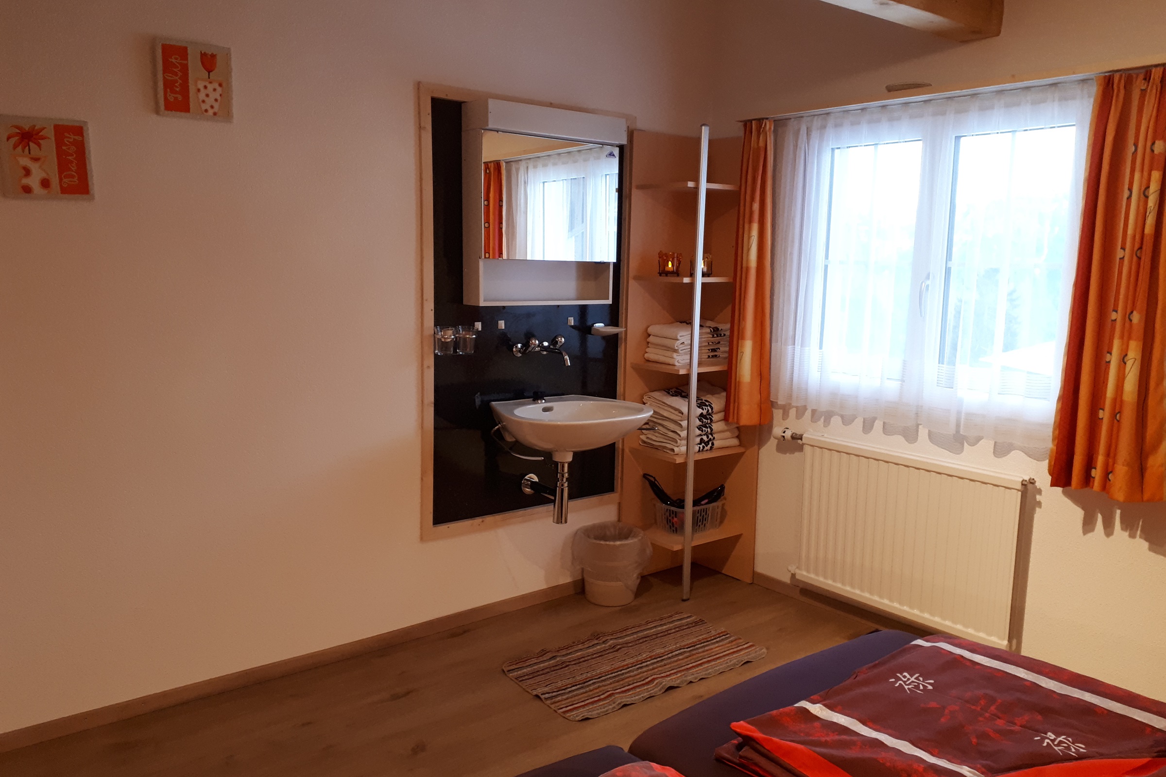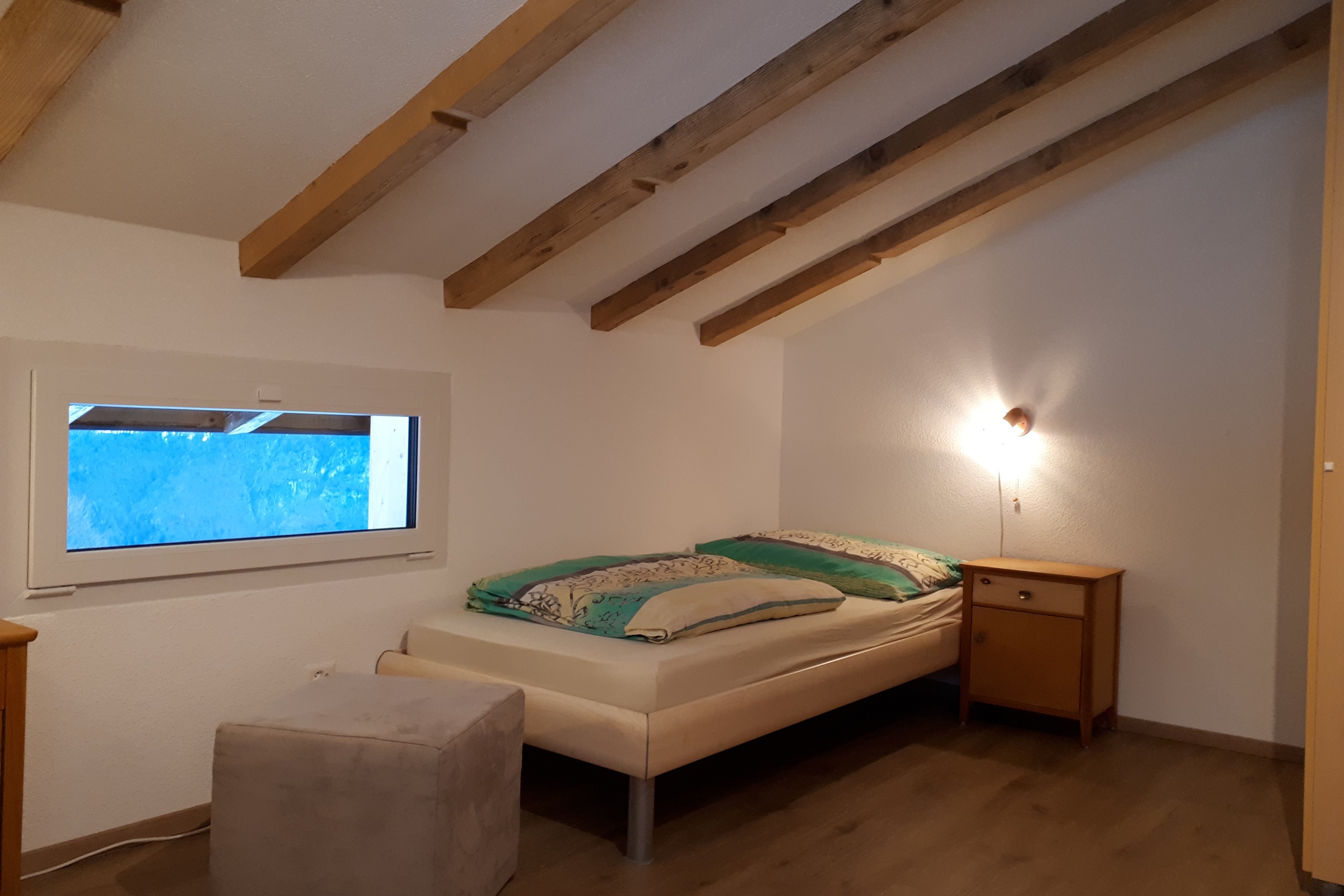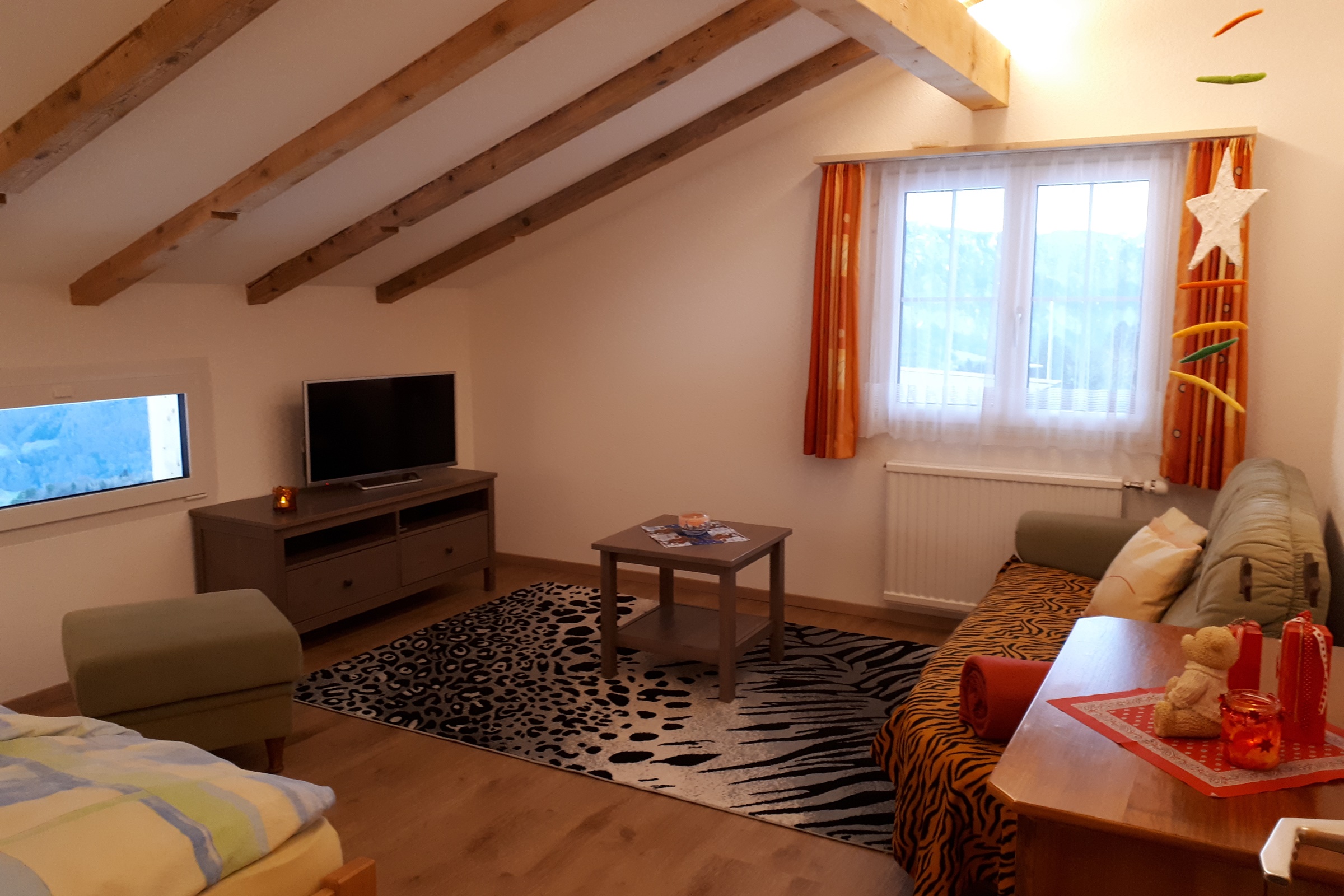 Die Ferienwohnung im Obergeschoss ist gemütlich und mit viel Holz eingerichtet. Die Wände in Wohn- und Schlafzimmer sind getäfert. WLAN ist kostenlos vorhanden.