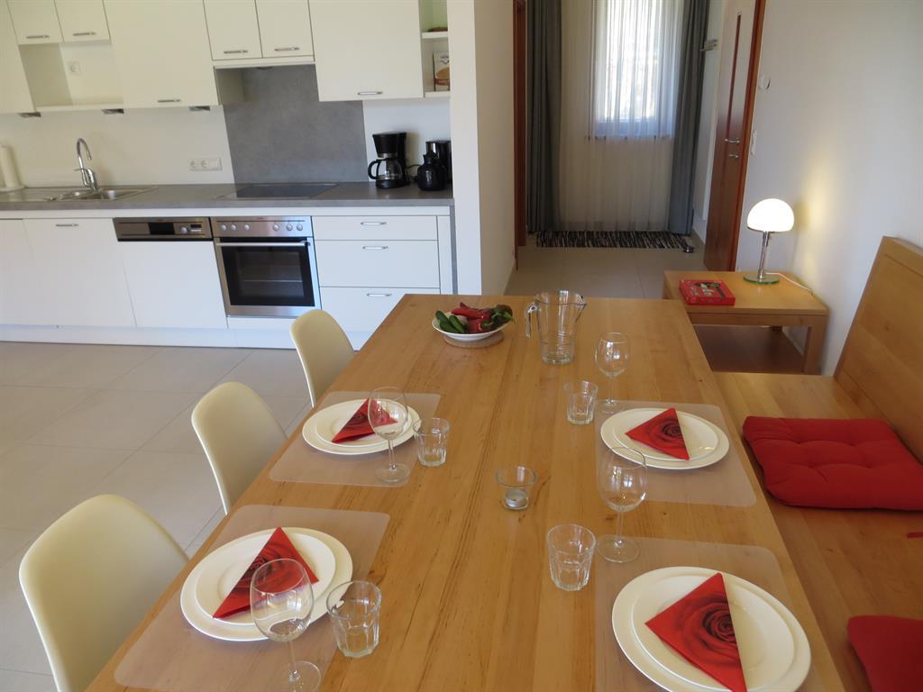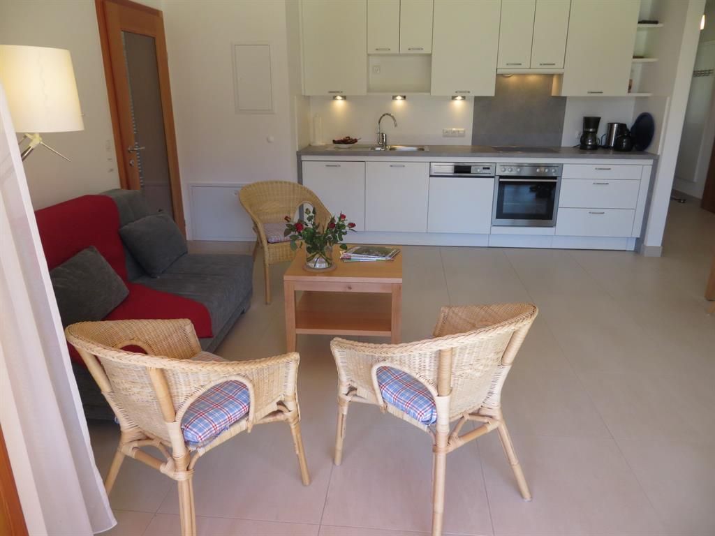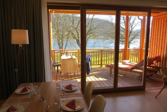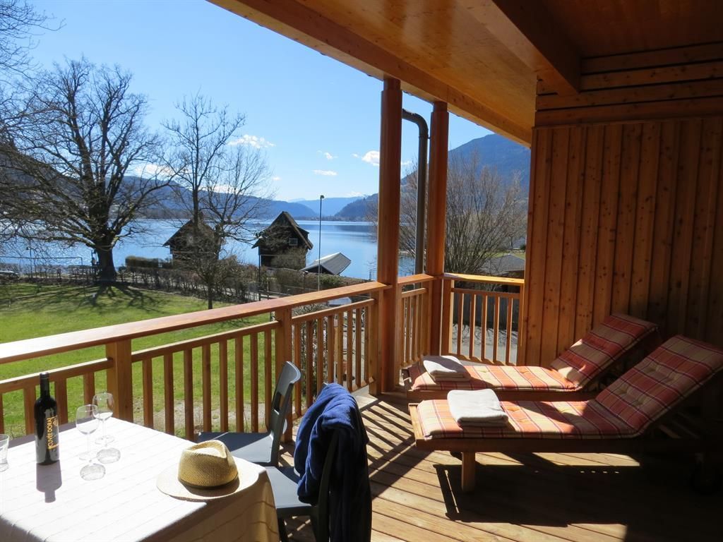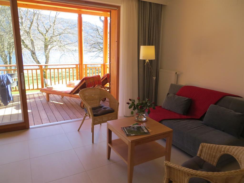Großer überdachter Wohnbalkon mit Tisch und Liegen, Südlage, direkt am See und Strandbad. Externer Sonnenschutz, 2 Schlafzimmer, großer Wohnraum mit Küche, Geschirrspüler, Backofen, Ceranfeld, Wasserkocher, Kaffeemaschine, gemütlicher Esstisch, geräumiges Badezimmer mit zwei Waschbecken und Föhn, Betten 4 bis 6 Personen.
