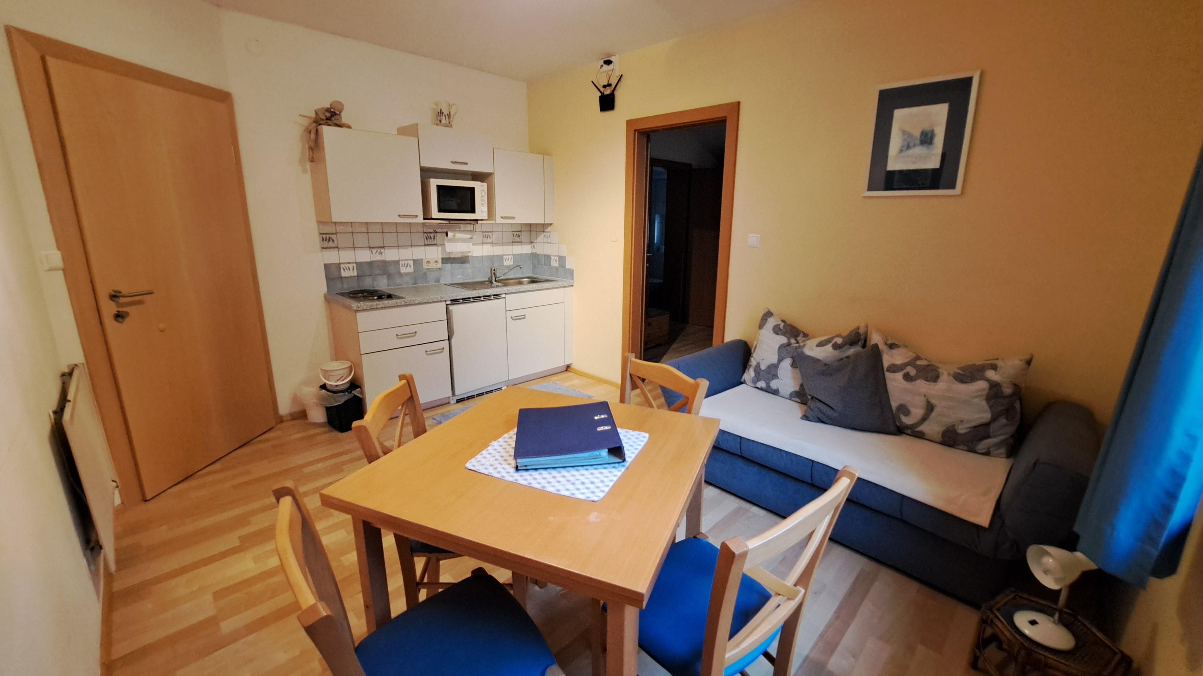 Das Apartment Mohnblüte ist im Erdgeschoss gelegen und besteht aus einer Wohnküche und einem offenen Schlafzimmer, sowie Dusche/WC. Der Küchenblock verfügt neben einem Herd mit Backrohr, Kühlschrank mit Tiefkühlfach auch über einen Geschirrspüler, Filter-Kaffeemaschine und Wasserkocher, sowie den notwendigen Utensilien. Dem Apartment ist eine sonnige Terrasse und eine kleine Wiese vorgelagert, die von den Gästen dieses Apartments genutzt werden. Das Apartment ist seeseitig gelegen und bietet einen schönen Blick auf die umliegenden Berge.