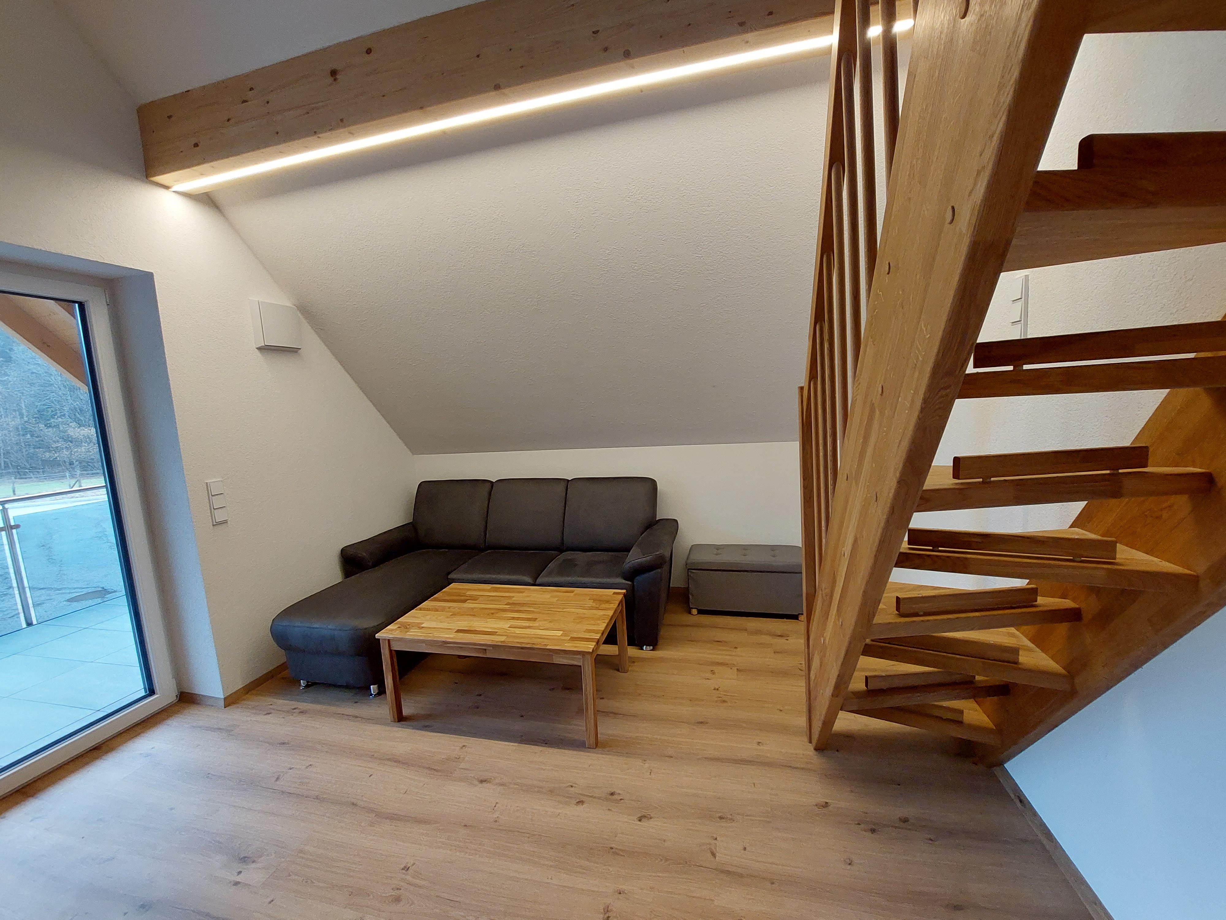 Das geräumige Wohlfühl-Apartment im ersten Stock ist auf 2 Etagen aufgeteilt und besteht aus Schlafzimmern, Wohn-Küche, einer Terrasse, einem Balkon, Bad und WC.