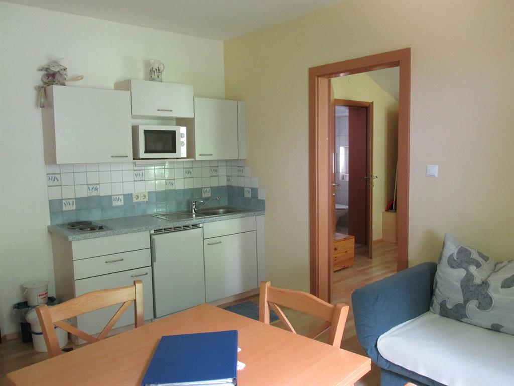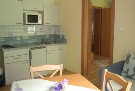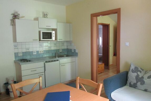 Das Apartment Lavendel ist im zweiten Stock gelegen, gartenseitig und sehr ruhig. Dieses Apartment bietet Ihnen neben Dusche/WC ein Schlafzimmer mit Doppelbett, eine Wohnküche mit Küchenblock (ausgestattet mit Kühlschrank, 2 Herdplatten, Mikrowelle Wasserkocher, Filter-Kaffeemaschine und den notwendigen Utensilien), und Esstisch. Dieses Apartment hat keinen Balkon.
