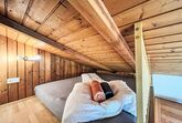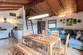 Häuschen am Waldrand, 1-Zimmer-Bungalow 55 m2. Objekt geeignet für 2 Erwachsene + 2 Kinder. Zweckmässig und gemütlich eingerichtet: Wohn-/Schlafzimmer mit 1 Doppeldiwanbett und Esstisch. Ausgang zum Garten, zur Terrasse. Abgeschrägte, offene kleine Galerie mit 1 Schlafmöglichkeit (1 x 180 cm, Länge 200 cm). Kleine Kochnische (2 Kochplatten, Backofen, Toaster, Wasserkocher, elektrische Kaffeemaschine). Dusche/WC. E-Heizung. Parkettboden. Terrasse. Terrassenmöbel, Gartengrill. Sehr schöne Panoramasicht auf den See. Zur Verfügung: Babybett bis 2 Jahre. Internet (WLAN, gratis). Bitte beachten: Nichtraucher-Haus. Maximal 2 Haustiere/Hunde erlaubt. Anstelle eines abgeschlossenen Schlafzimmers befinden sich manche Schlafplätze in einem offenen Bereich (Galerie, Nische etc.).