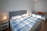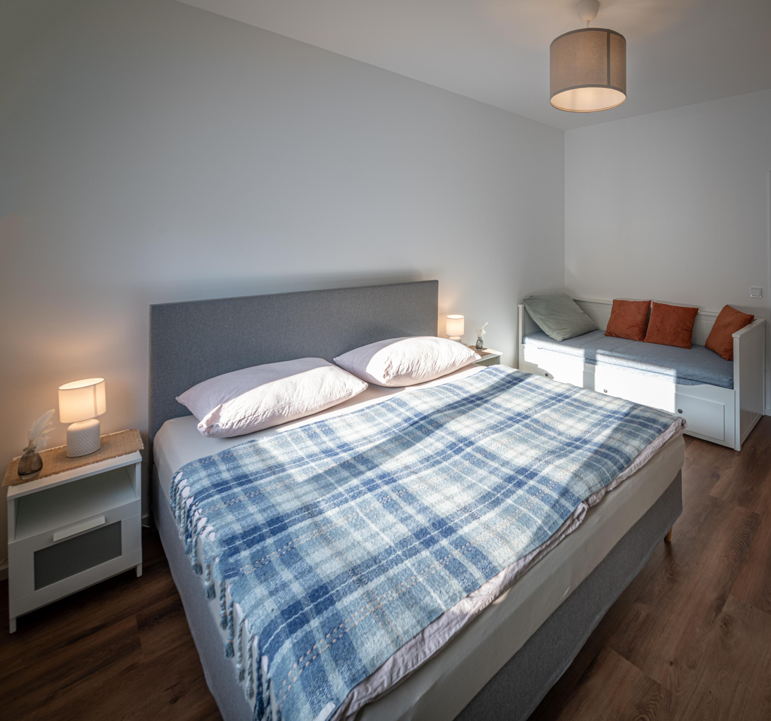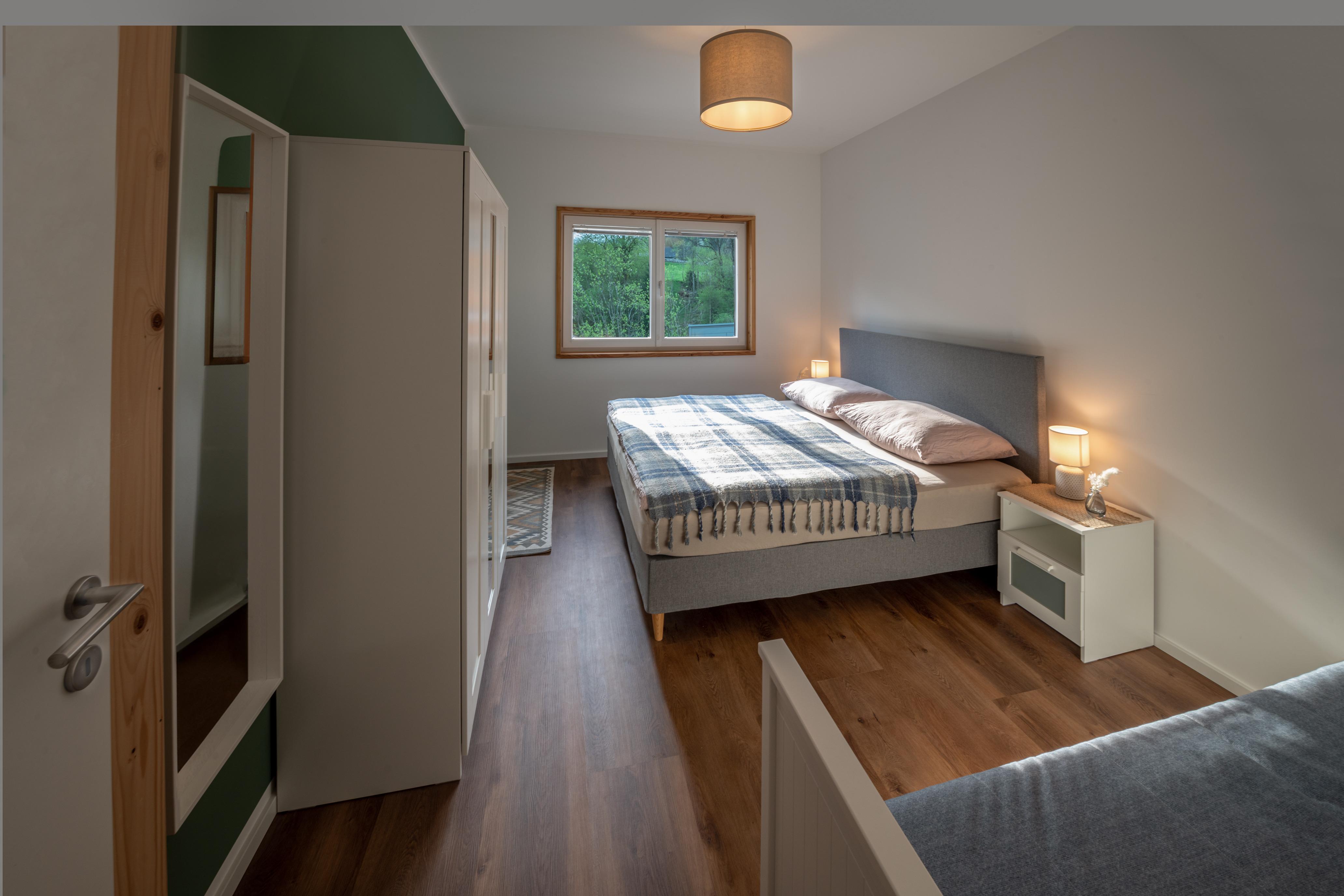 Zimmer 1: Doppelbett inkl. Nachtkästchen und Kleiderschrank + 1 Ausziehbett. Insgesamt können bis zu 4 Personen in diesem Zimmer schlafen.