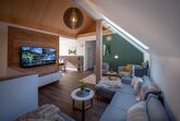 Der Wohnbereich ist mit einer großen Couch und einer Sitzgruppe ausgestattet. Ein großes Fernsehgerät mit Satelitenanschluss und Netflix gibt es ebenfalls. Es gibt eine Kinderecke mit Teppich und diversen Spielen für jeden Alters.