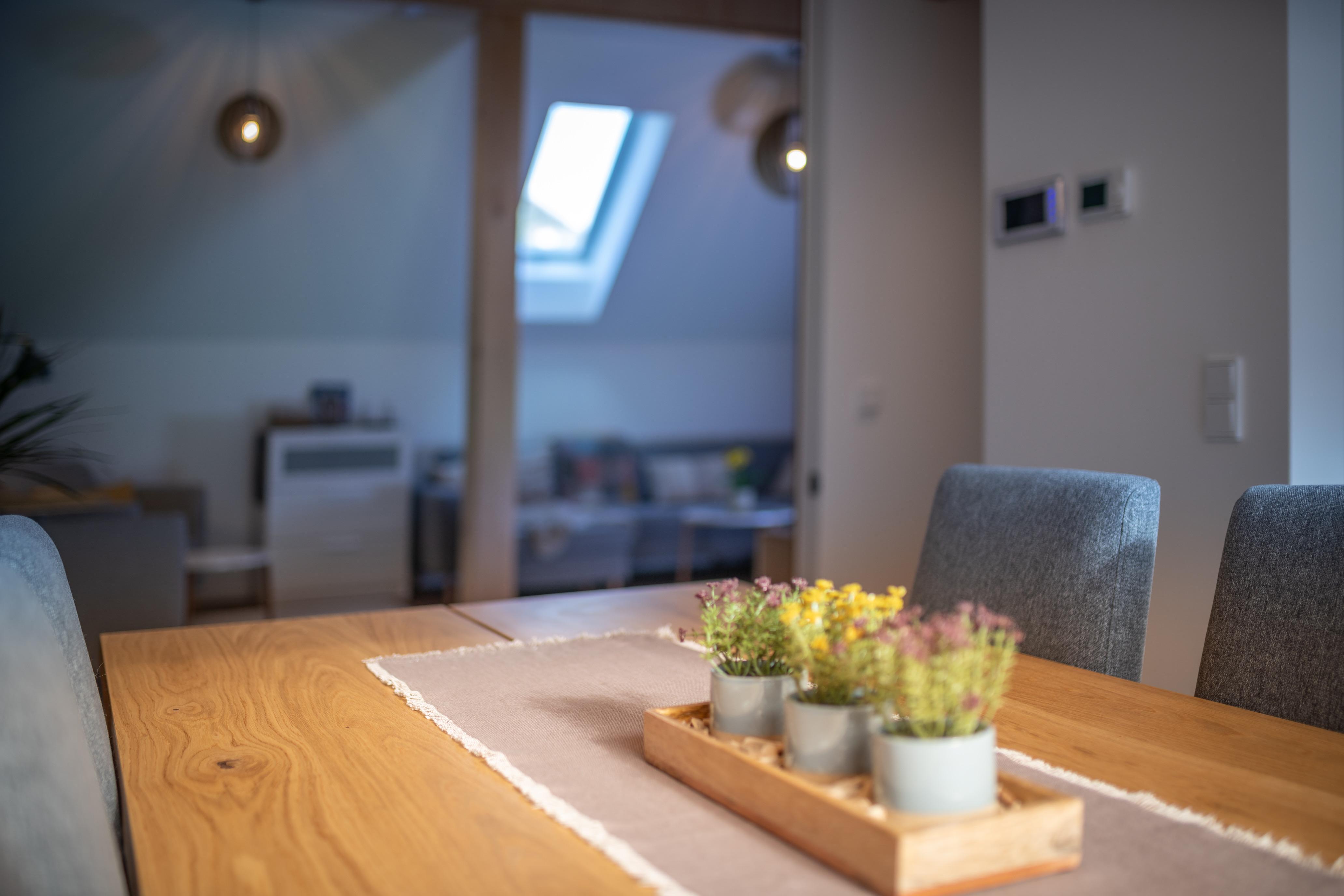 Helle und moderne 3 Zimmerwohnung mit großem Wohn- und Essbereich. Die Küche ist Ausgestattet mit einem Kühlschrank mit Gefrierfächern, einem E-Herd, Backofen und Geschirrspüler. Geschirr inkl. Kindergeschirr und viele weitere Küchenutensilien sind vorhanden. In der Küche gibt es auch eine Kaffeemaschine inkl. gratis Kapseln und einen Wasserkocher. Der Essbereich bietet Platz für bis zu 8 Personen.