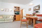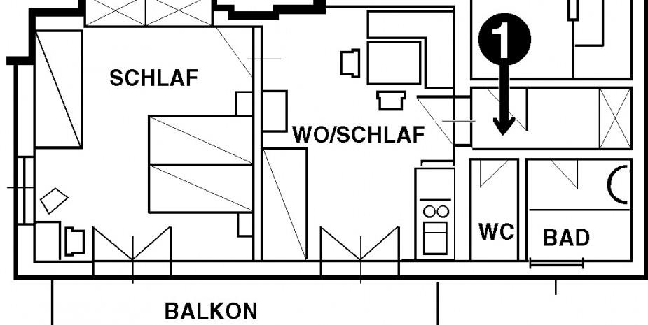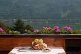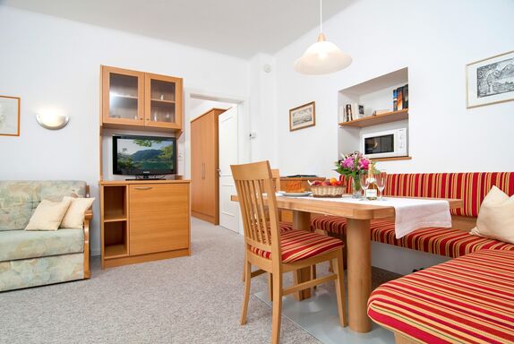 Gemütlicher Wohn- Schlafraum mit moderner Küchenzeile (Geschirrspüler, Mikrowelle etc) und Ausziehcouch, 1 Schlafraum mit 3 Betten, Blumenbalkon über beide Räume, Süd- Südwest, direkter Seeblick, komplett und liebevoll ausgestattet.