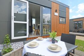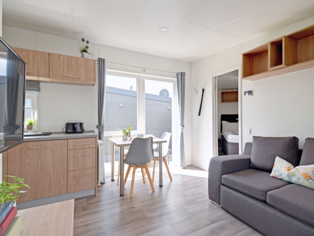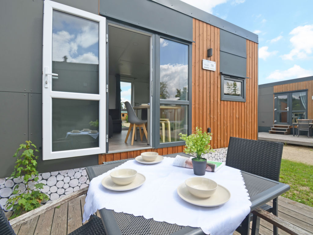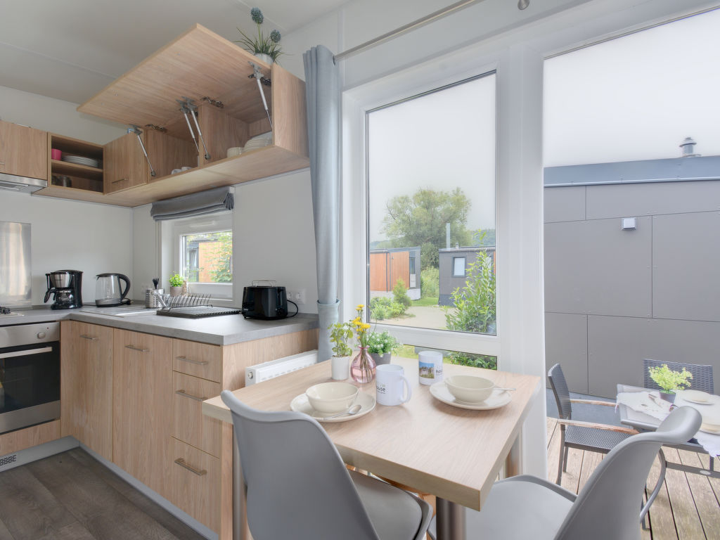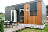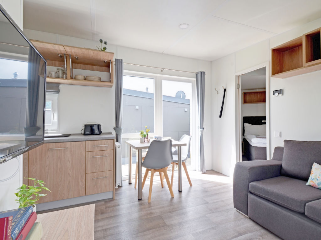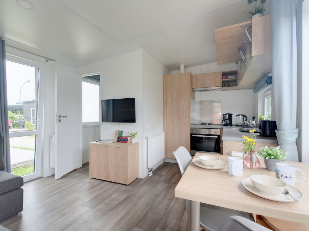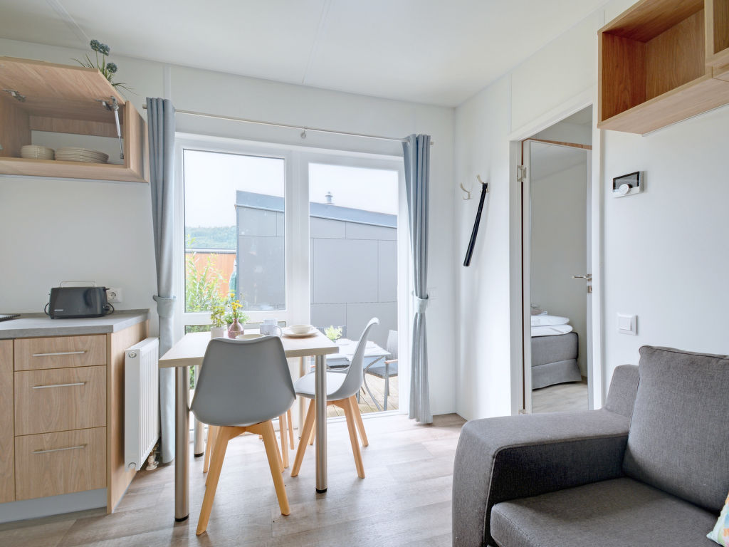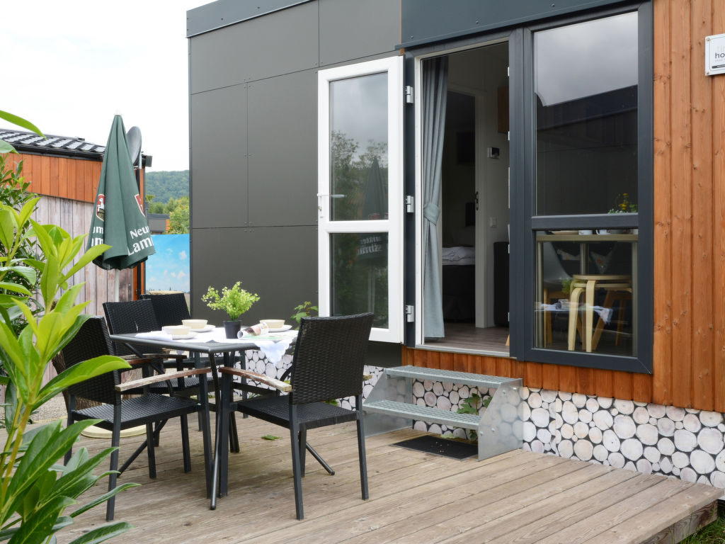 Tiny Haus Erwine, 2-Zimmer-Mobilheim 25 m2. Objekt geeignet für 2 Erwachsene + 2 Kinder. Gemütlich eingerichtet: Wohn-/Schlafzimmer mit 1 Diwanbett (120 cm, Länge 170 cm), Sat-TV. 1 Zimmer mit 1 franz. Bett (140 cm, Länge 200 cm). Offene Küche (Backofen, Gasherd, 2 Flammen, Wasserkocher, elektrische Kaffeemaschine). Dusche/WC. G-Heizung. Kleine Terrasse. Terrassenmöbel. Parkplatz in 50 m. Bitte beachten: Nichtraucher-Haus.