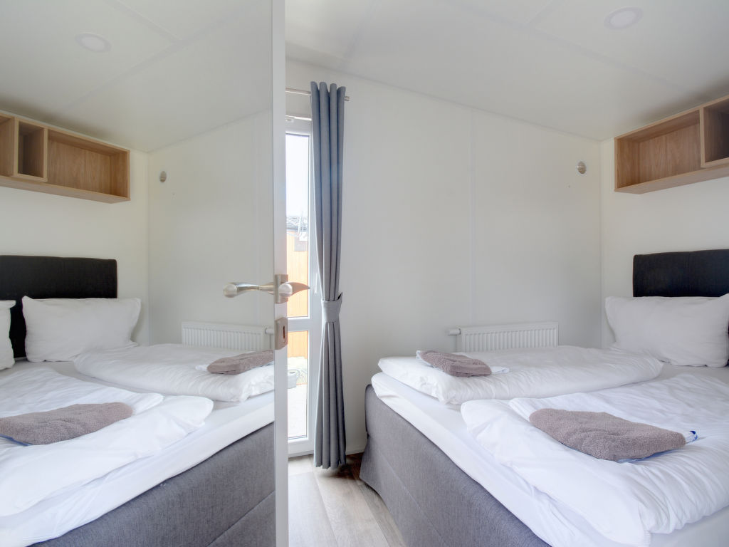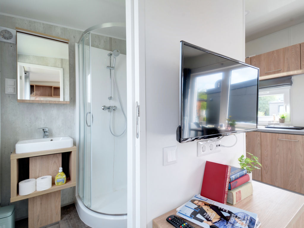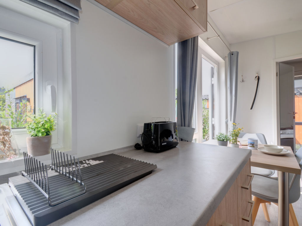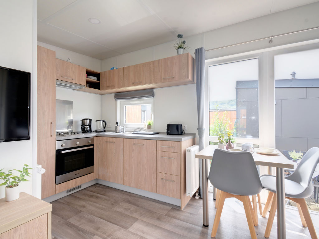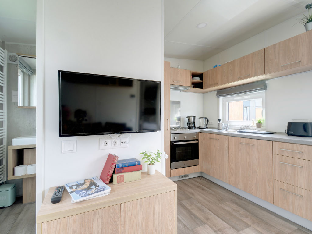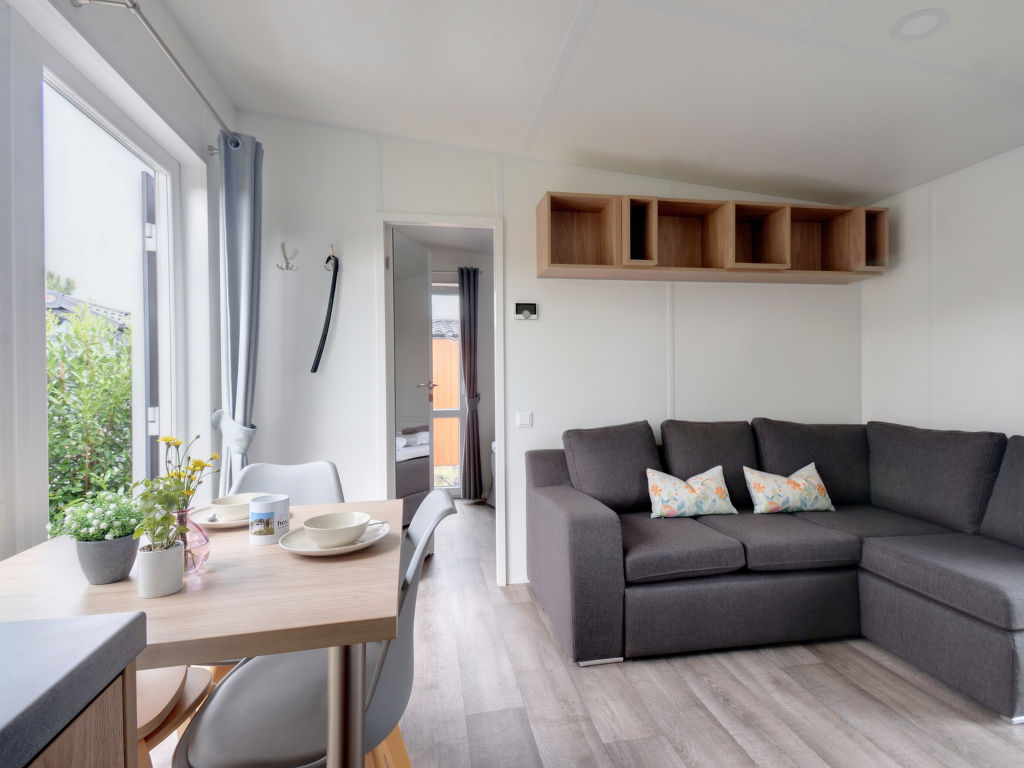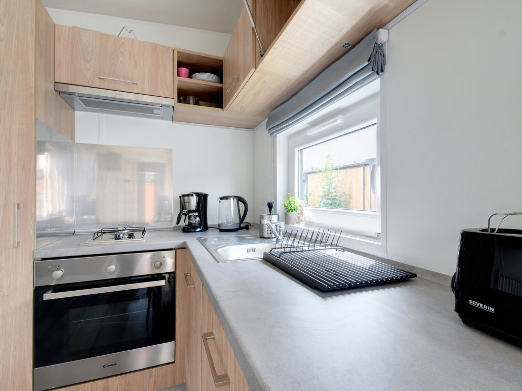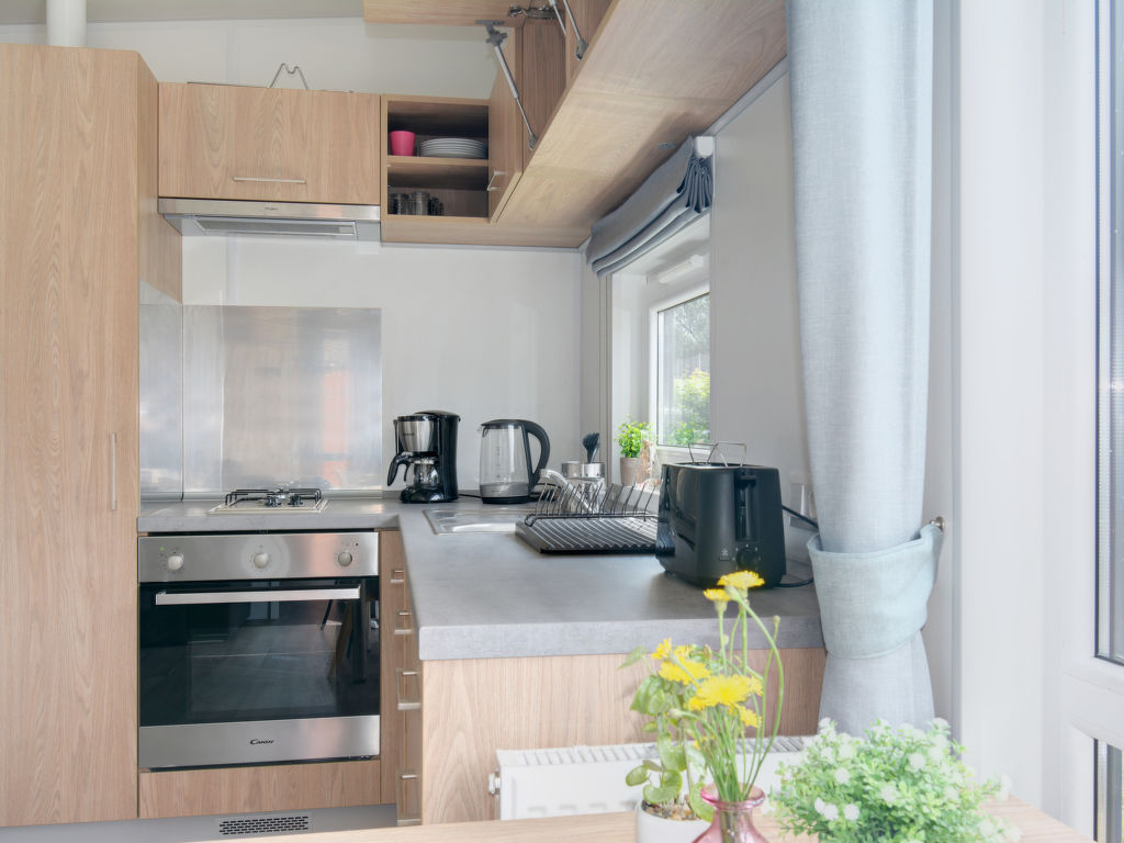Tiny Haus Erwine, 2-Zimmer-Mobilheim 25 m2. Objekt geeignet für 2 Erwachsene + 2 Kinder. Gemütlich eingerichtet: Wohn-/Schlafzimmer mit 1 Diwanbett (120 cm, Länge 170 cm), Sat-TV. 1 Zimmer mit 1 franz. Bett (140 cm, Länge 200 cm). Offene Küche (Backofen, Gasherd, 2 Flammen, Wasserkocher, elektrische Kaffeemaschine). Dusche/WC. G-Heizung. Kleine Terrasse. Terrassenmöbel. Parkplatz in 50 m. Bitte beachten: Nichtraucher-Haus.