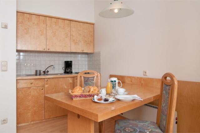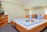 Appartement für 3-6 Personen mit 2 Schlafräumen (1 x mit Doppelbettzimmer, 1 mit Stockbetten, )2. TV-Gerät im Elternschlafzimmer, Wohn/Schlafraum mit Sitzgruppe und Couch, Essecke mit Kochnische und Kaffemaschine, Kühlschrank, Du/WC und Balkon, SAT-TV- und Telefon, ost-west-seitige Gartenlage, WLAN