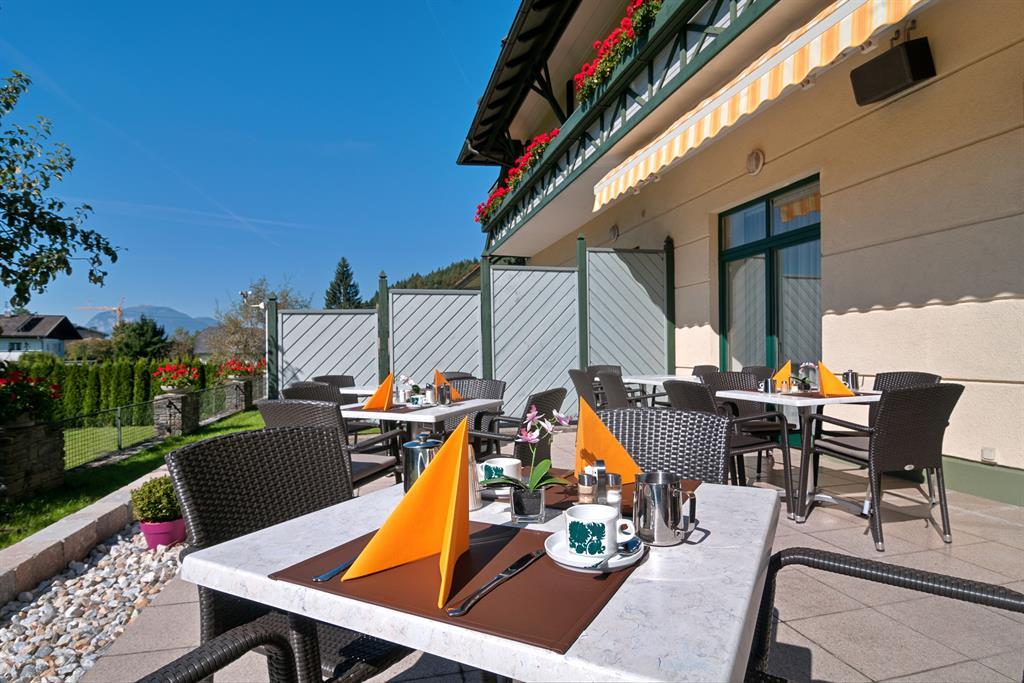 Lassen Sie sich verwöhnen! Unser Frühstücksbuffet lässt keine Wünsche offen. Sie genießen Ihr leckeres Frühstück im Speisesaal oder auf der Sonnenterrasse und sehen dabei zu, wie die Sonne langsam ihren Weg über den Mittagskogel findet. Am Nachmittag und Abend, nach einem aktiven und erlebnisreichen Tag, laden wir auf unserer Terrasse zu Kaffee, Kuchen oder schmackhaften Eiskreationen.