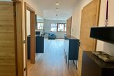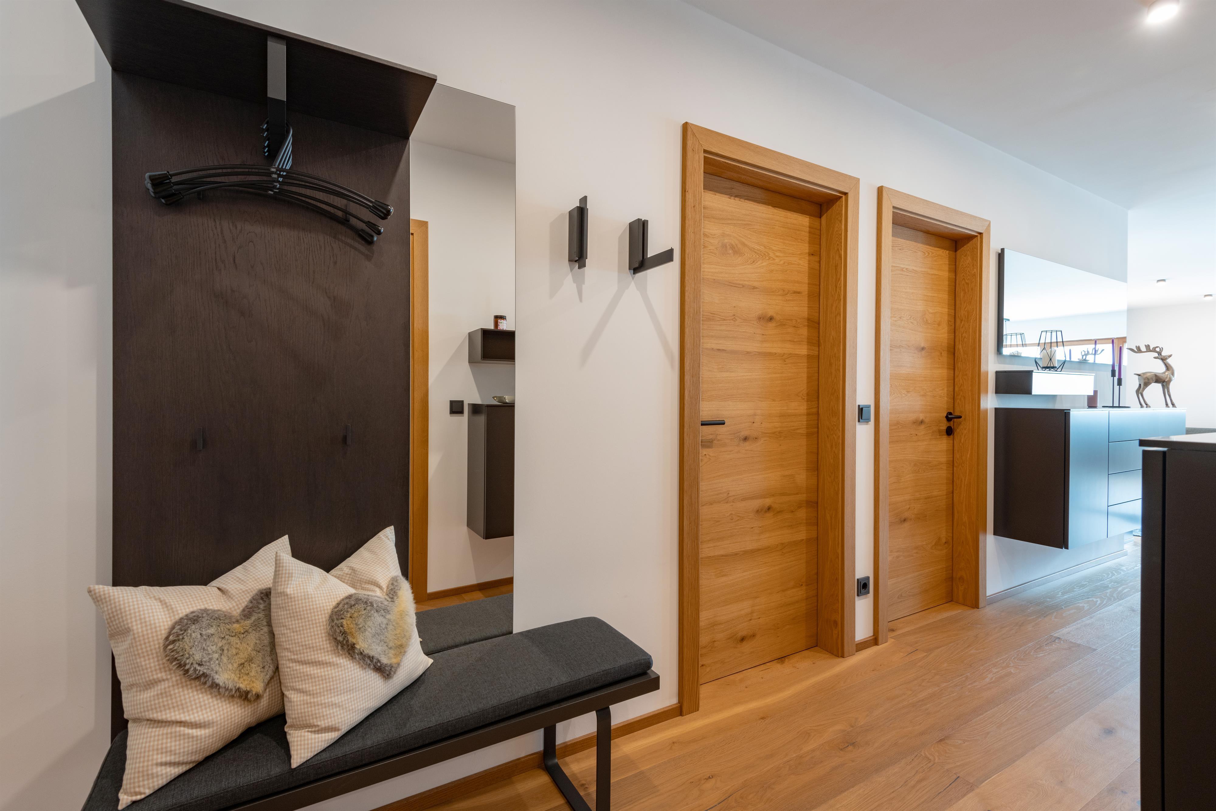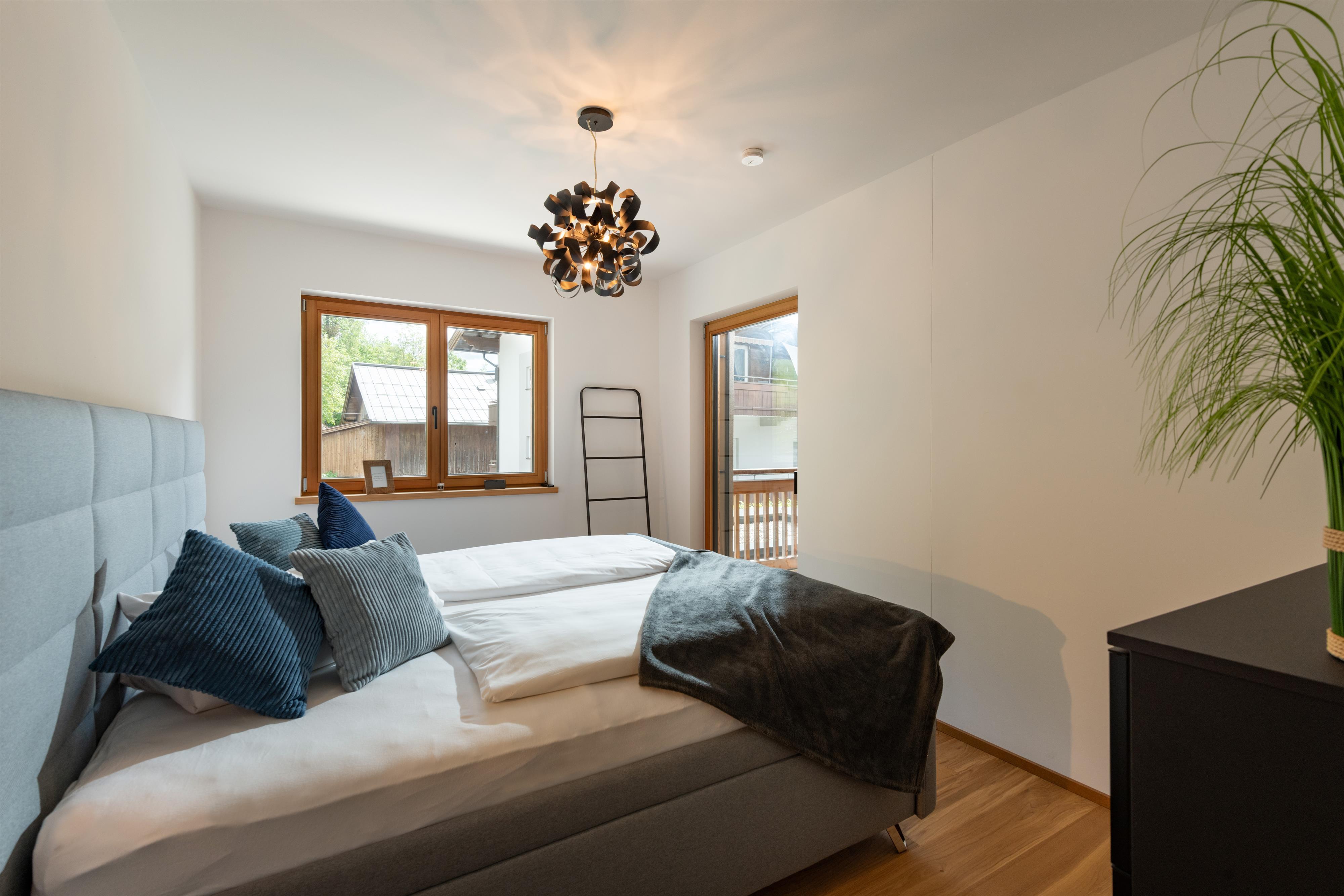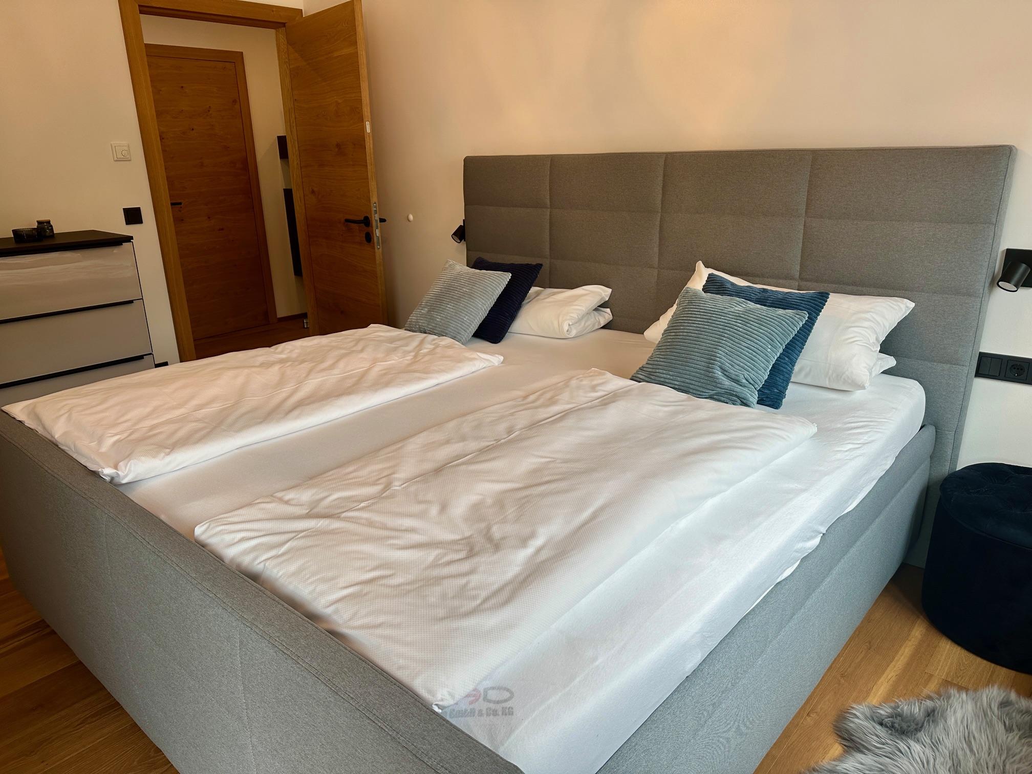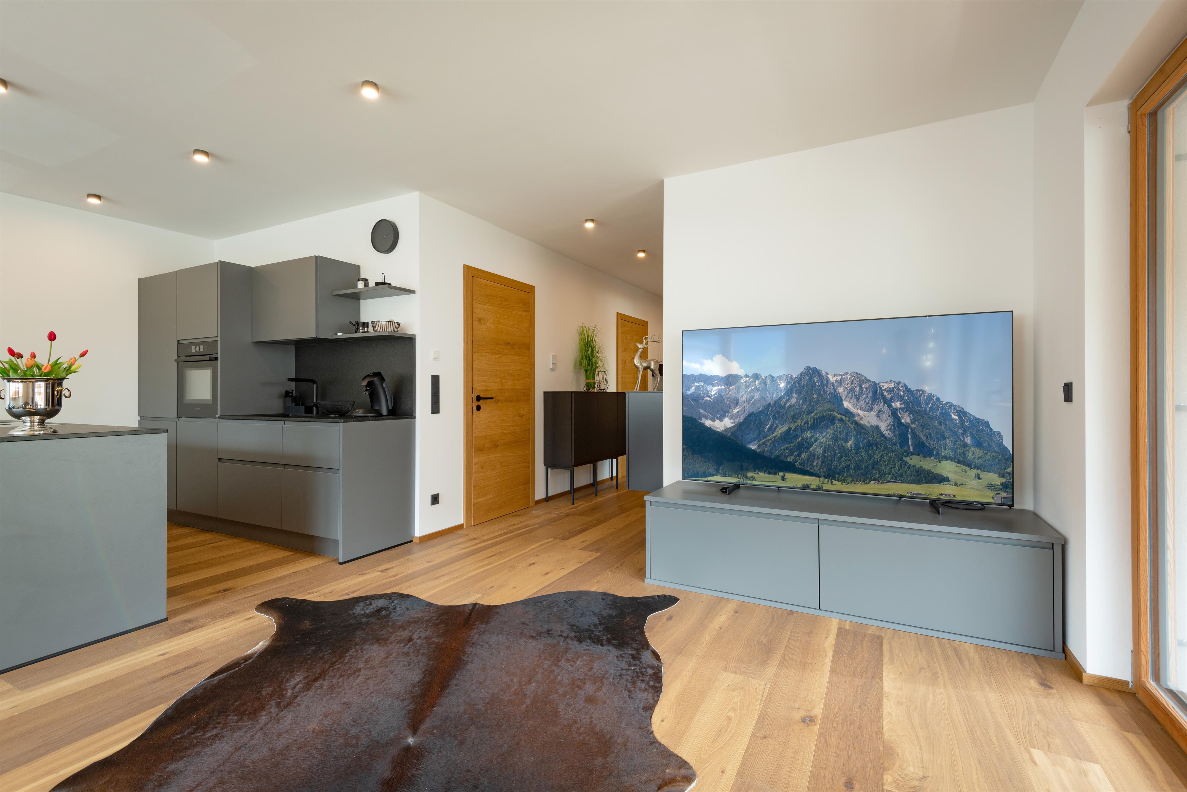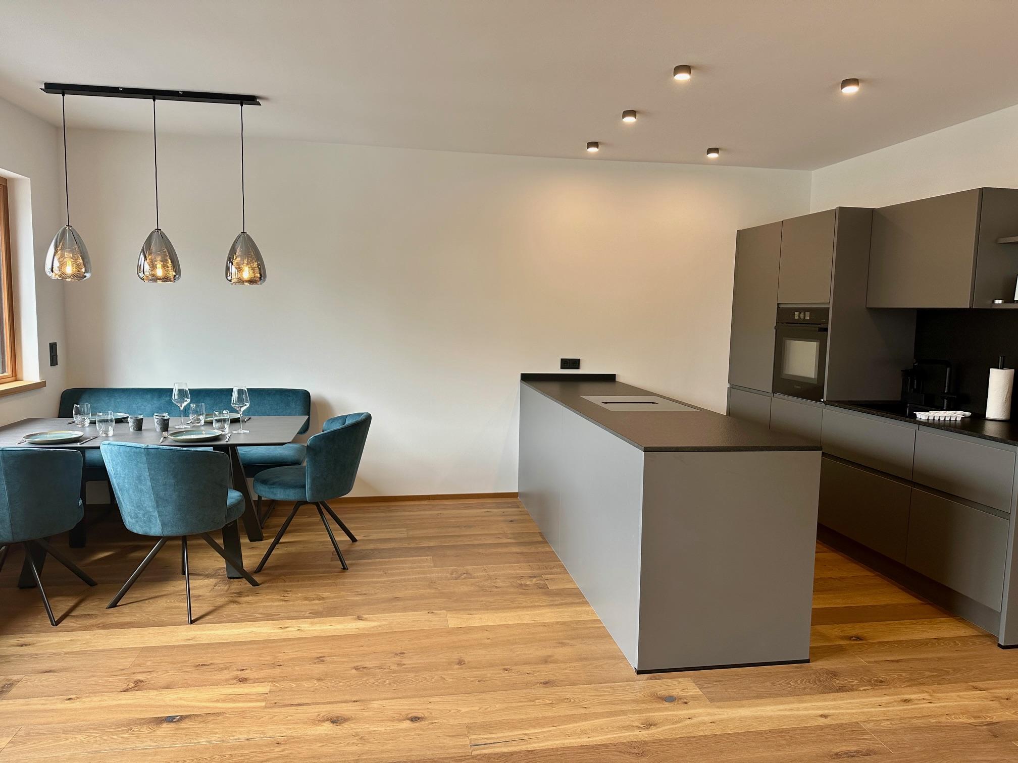 Zur Ausstattung gehören ein offener Wohnraum mit Küche und Kochinsel, Badezimmer mit bodenebener Regendusche, 2 Schlafzimmer mit Boxspringbetten, Holzböden und elektrische Jalousien.