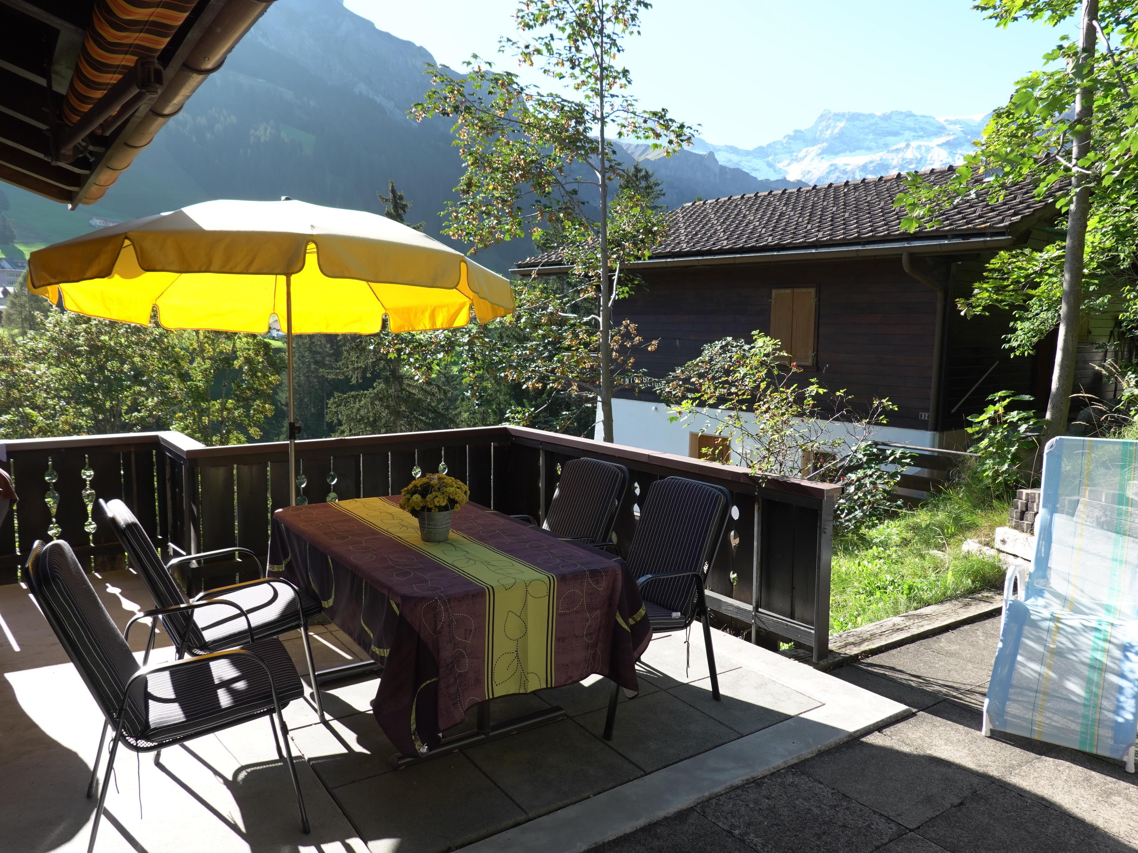 Ein Badezimmer mit Dusche. Balkon und grosse Terrasse mit schöner Bergsicht. Tisch und Stühle Sonnenschirm und Store vorhanden.