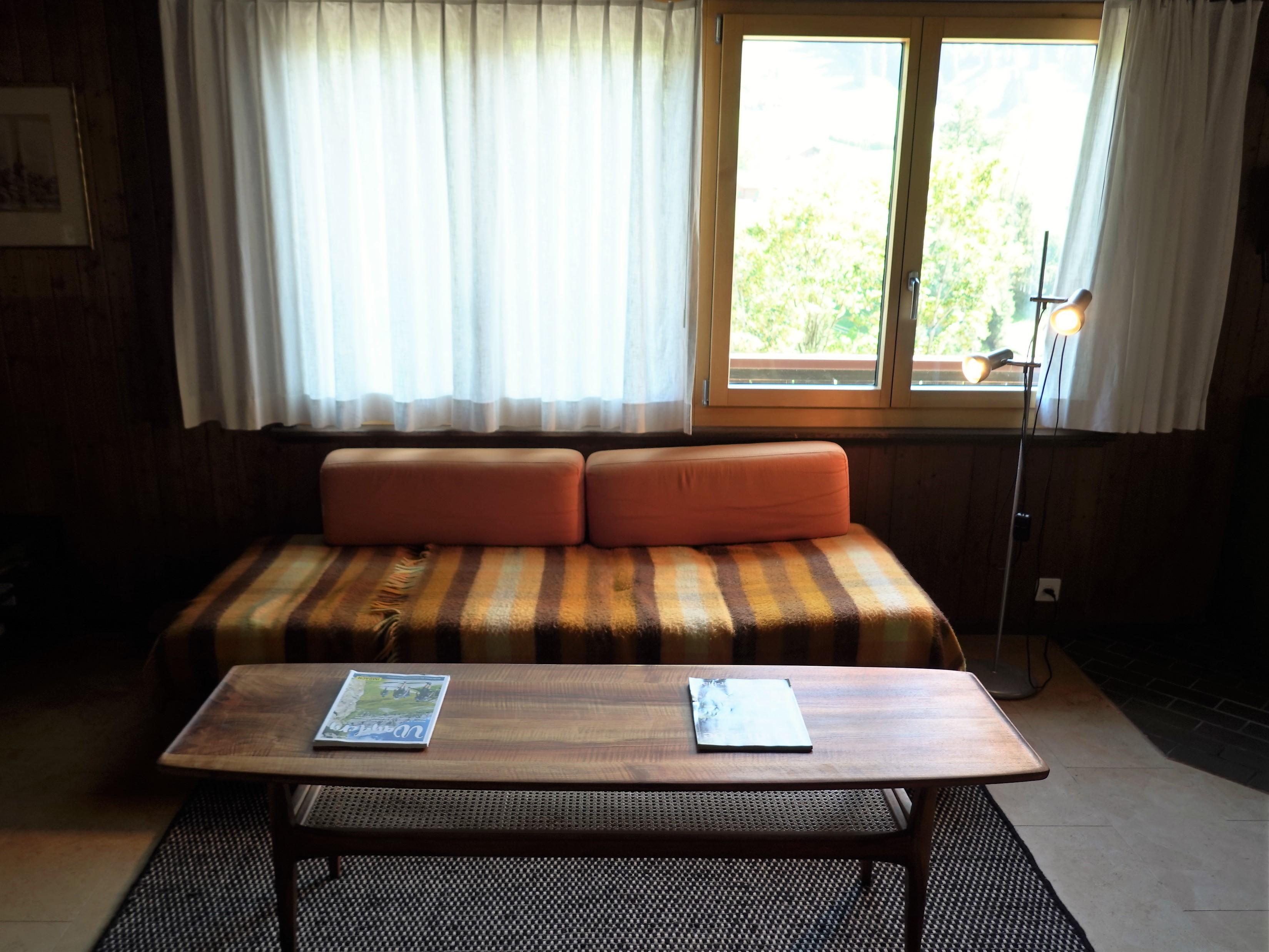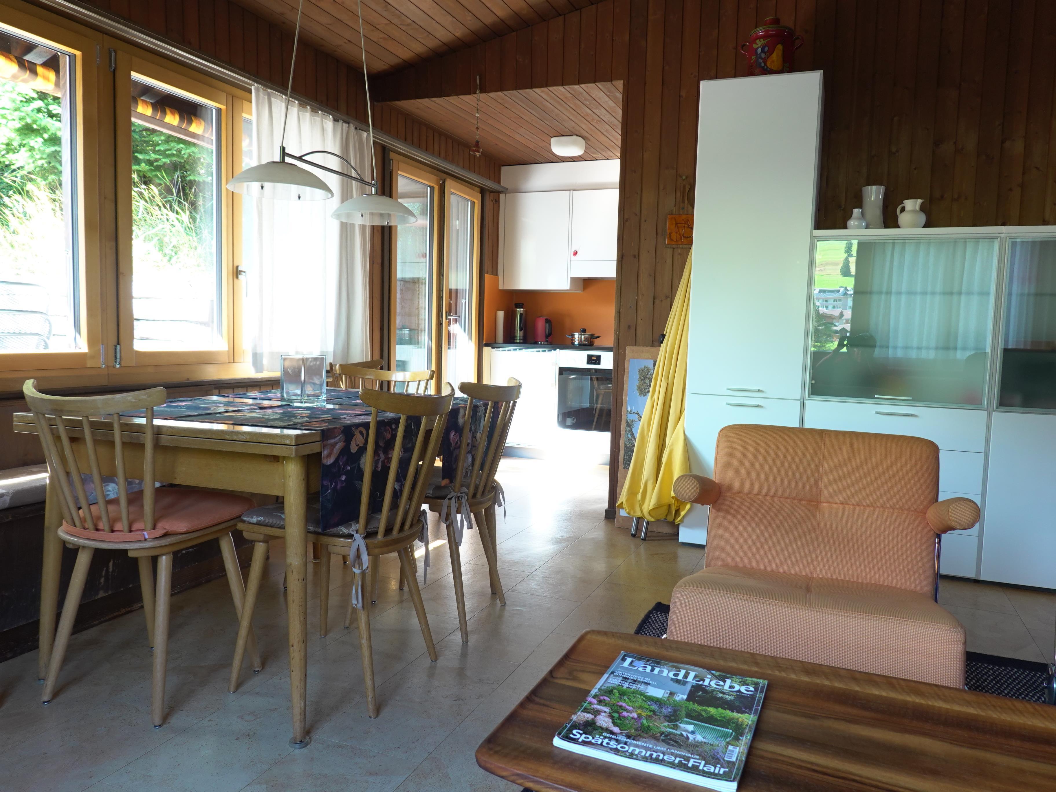 Schöne, sonnige, 3-Zimmer-Wohnung (70 m2), mit Blick auf den Wildstrubel und den Lohner in einem Chalet mit 2 Wohnungen. Parkplatz vorhanden. Wohnzimmer mit Sofa, 4 Fauteuils, Esstisch mit Sitzbank und vier Stühlen und einem Schweden-Holzofen. Offene Küche mit Backofen, kleiner Nespresso Katfeemaschine (Kapseln).