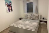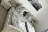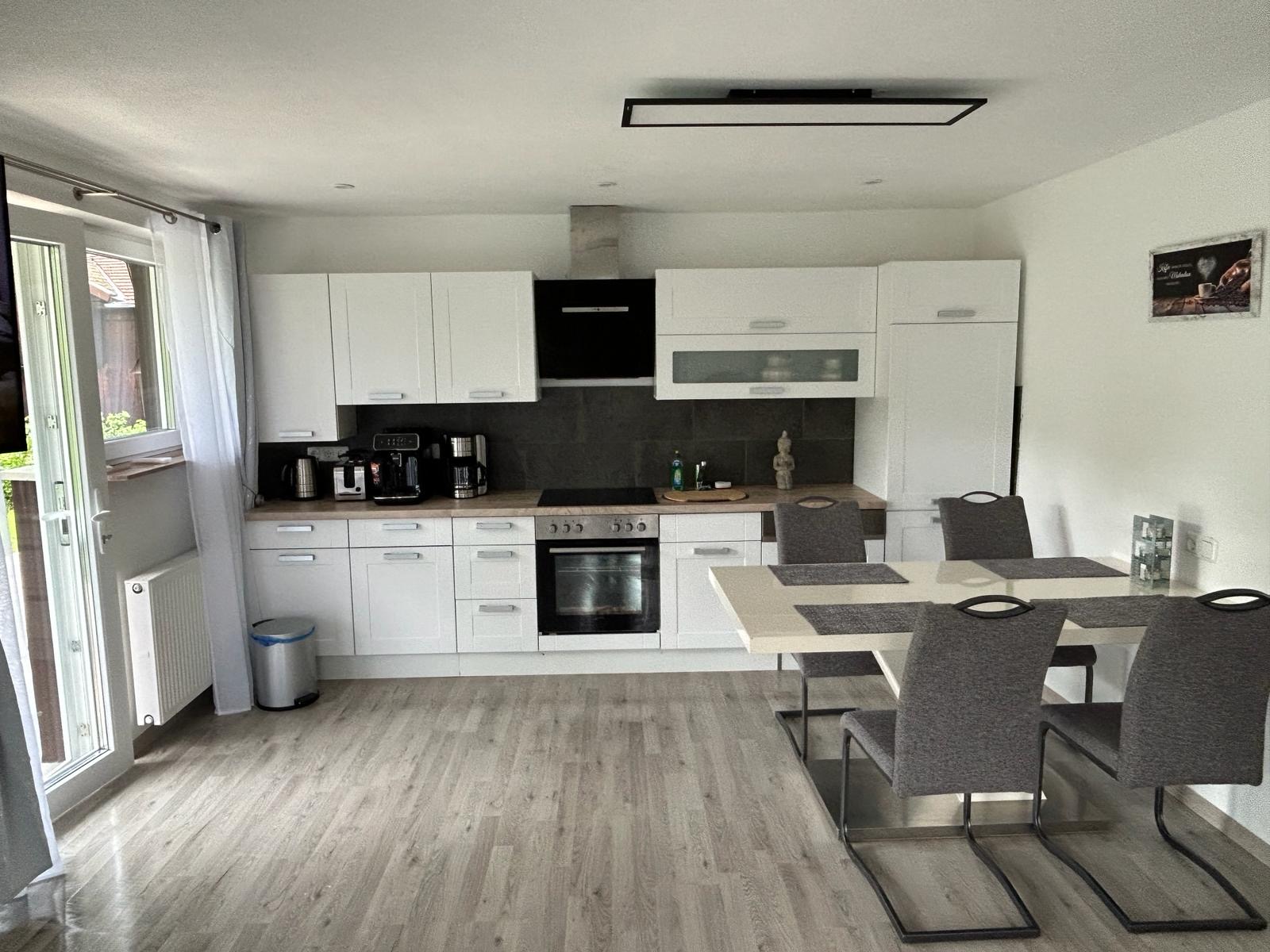 Essecke, Wohnzimmer mit großem Flat-TV und Sofa und einer Küche mit Spülmaschine, Kaffeevollautomat, Backofen, Kühlschrank mit kleinem Gefrierfach und weiteren Elektrogeräten wie Toaster, Wasserkocher, Kaffeemaschine; ein kleineres Zimmer mit einem Doppelbett; ein großes Schlafzimmer mit einem Doppelbett in L-Ausführung; ein Badezimmer mit