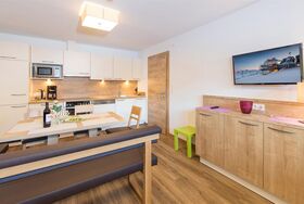 Das Appartement verfügt über ein Doppelzimmer und ein Einzelzimmer, beide ausgestattet mit Safe, Radio und Flat-TV. Zwei Badezimmer bieten jeweils ein Bad/Dusche/WC sowie einen Haarföhn. In der voll ausgestatteten Wohnküche findet sich ein gemütlicher Essbereich und Flat-TV. Ein Südbalkon bietet einen herrlichen Ausblick auf die schönsten Gipfel in Sölden.