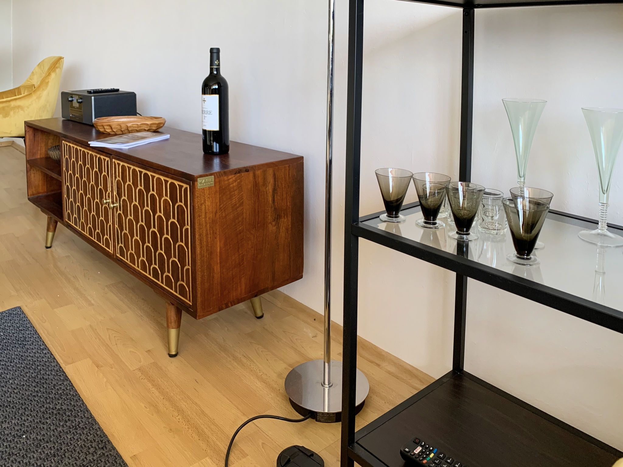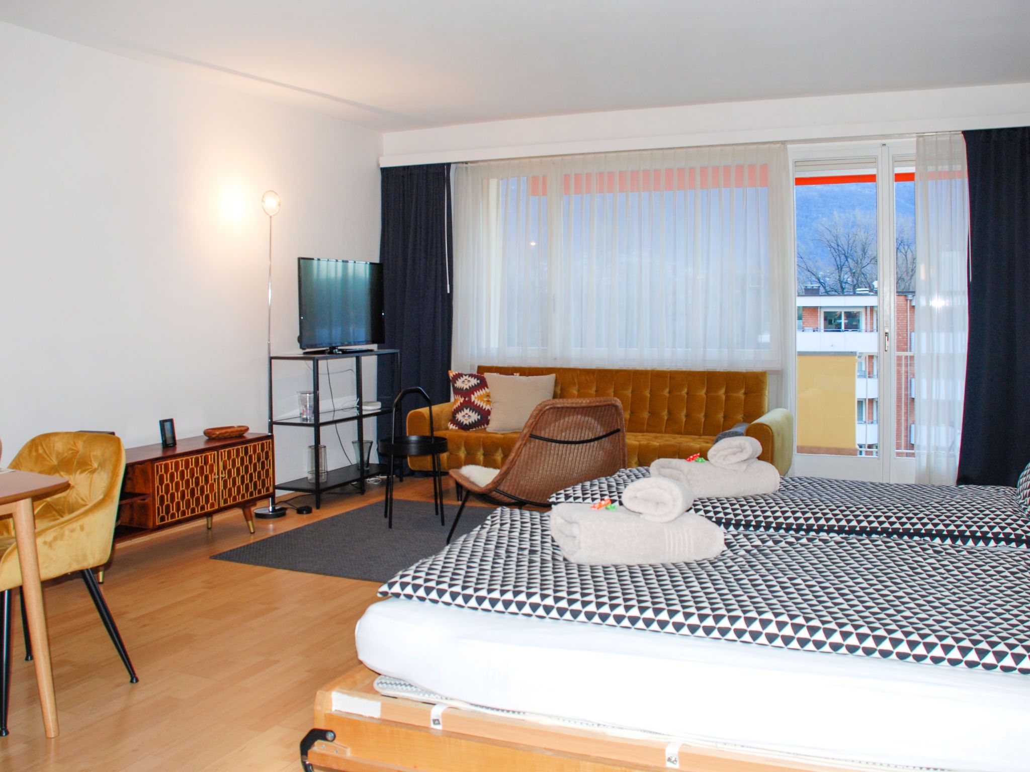 Residenza Lido Appartment 601, 1-Zimmer-Wohnung 50 m2 im 6. Stock, Südwestlage. Geräumig und hell, teilweise renoviert im Jahre 2021, komfortabel und modern eingerichtet: offenes grosses Wohn-/Schlafzimmer mit 2 Wandschrankbetten (90 cm, Länge 190 cm), Esstisch, Kabel-TV, Internationale TV-Sender, Flachbildschirm, Radio, CD und Stereoanlage. Ausgang zum Balkon. Küche (Backofen, Geschirrspüler, 4 Glaskeramikplatten, Toaster, Wasserkocher, elektrische Kaffeemaschine, Kapseln für die Kaffeemaschine (Nespresso) extra). Bad/WC. Heizung. Balkon. Balkonmöbel, Liegestühle (2). Seitliche Sicht auf den See, die Berge, den Garten, die Landschaft, die Ortschaft und Lido di Locarno. Zur Verfügung: Bügeleisen, Haartrockner. Internet (WLAN, gratis). Bitte beachten: Nichtraucher-Unterkunft. NL-