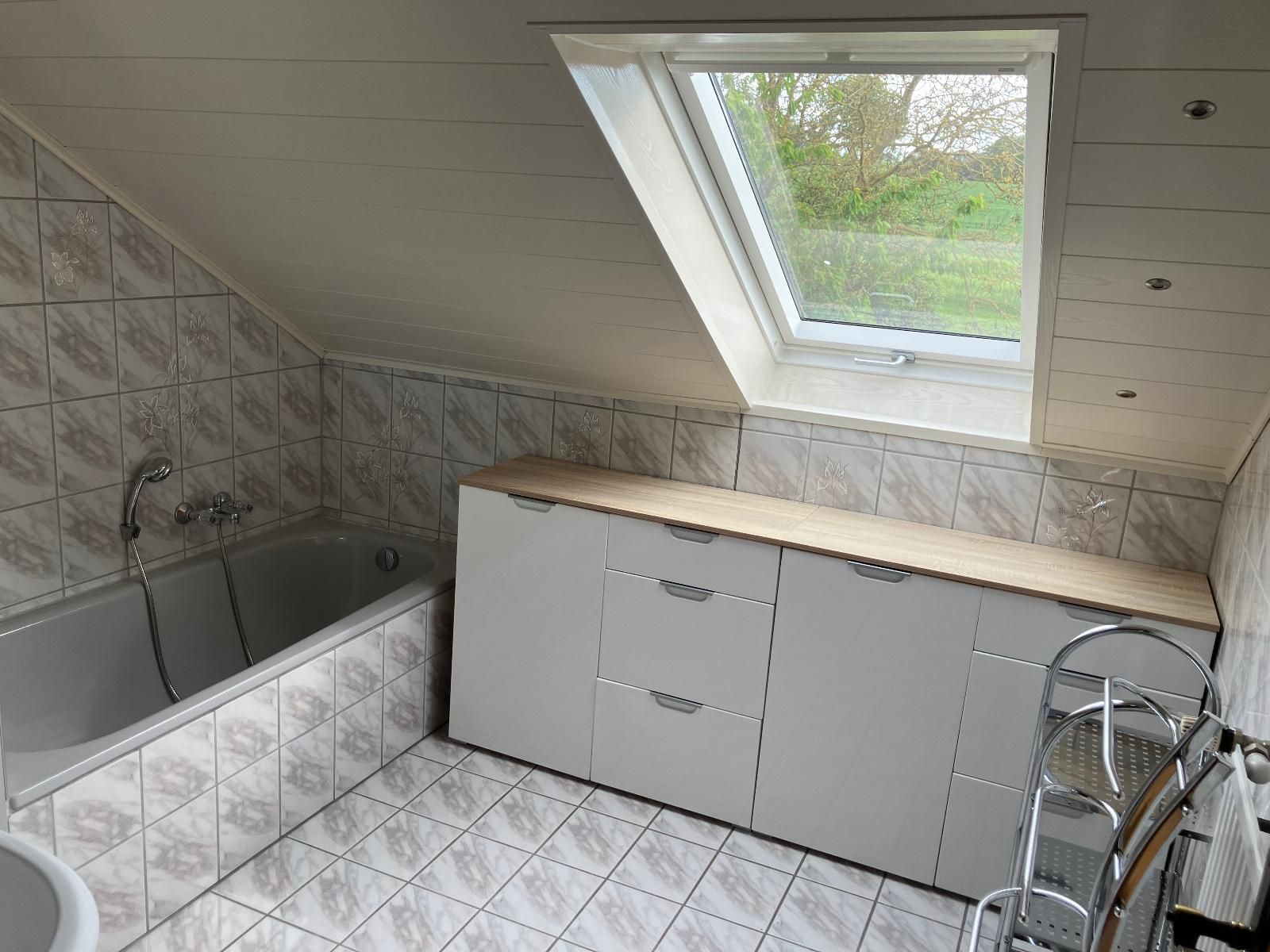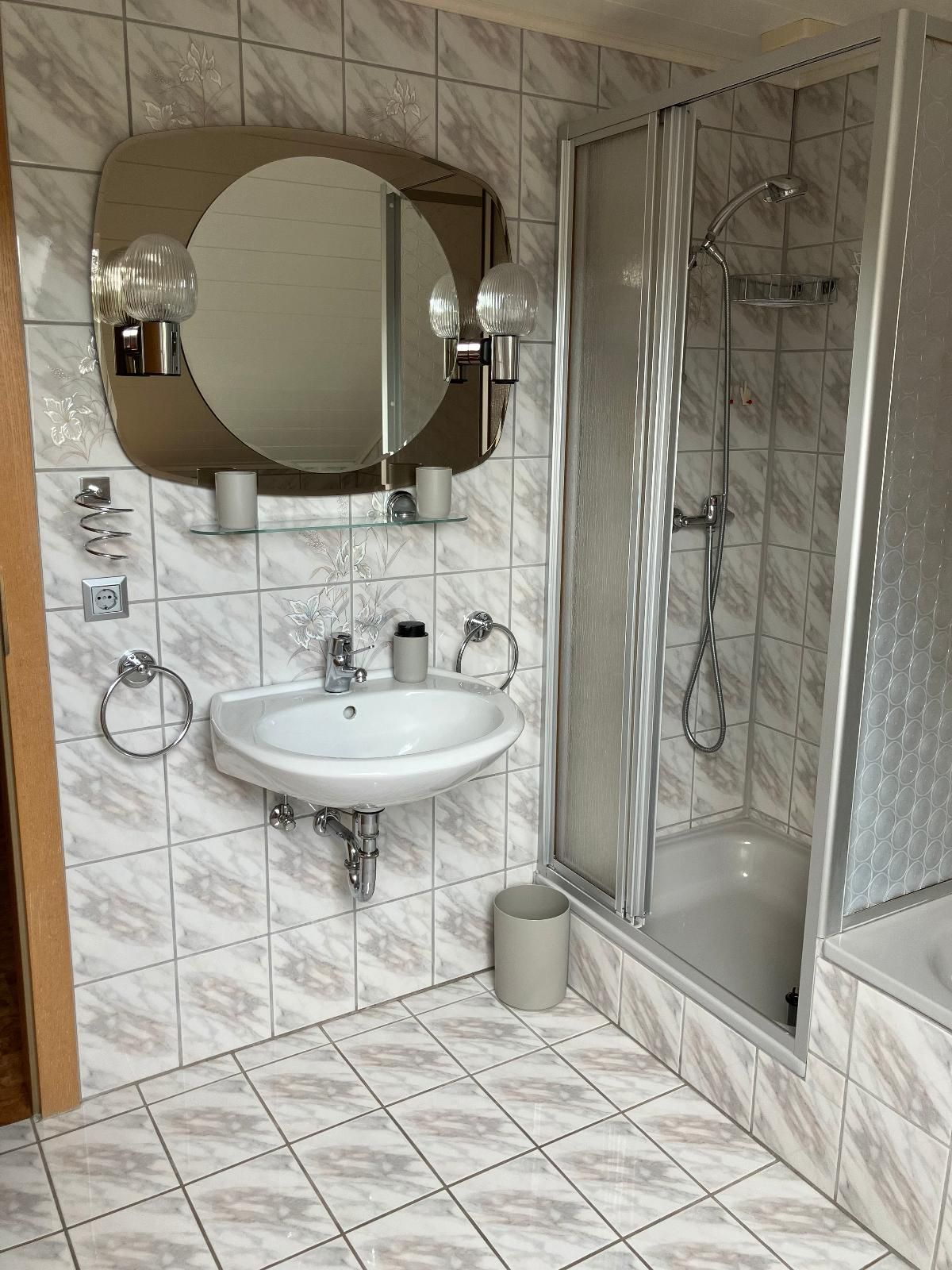 Das Badezimmer besteht aus einer Dusche, einer Badewanne, Waschbecken mit Spiegel, Badmöbel und einem separatem Handtuchhalter.