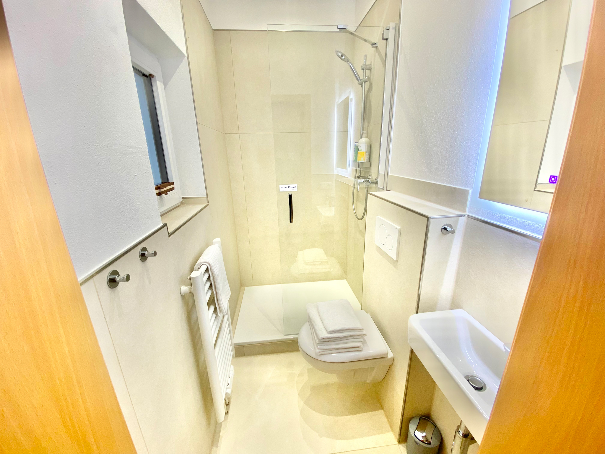 Das Bad verfügt über eine geräumige Dusche, WC, Waschbecken und Handtuchtrockner.