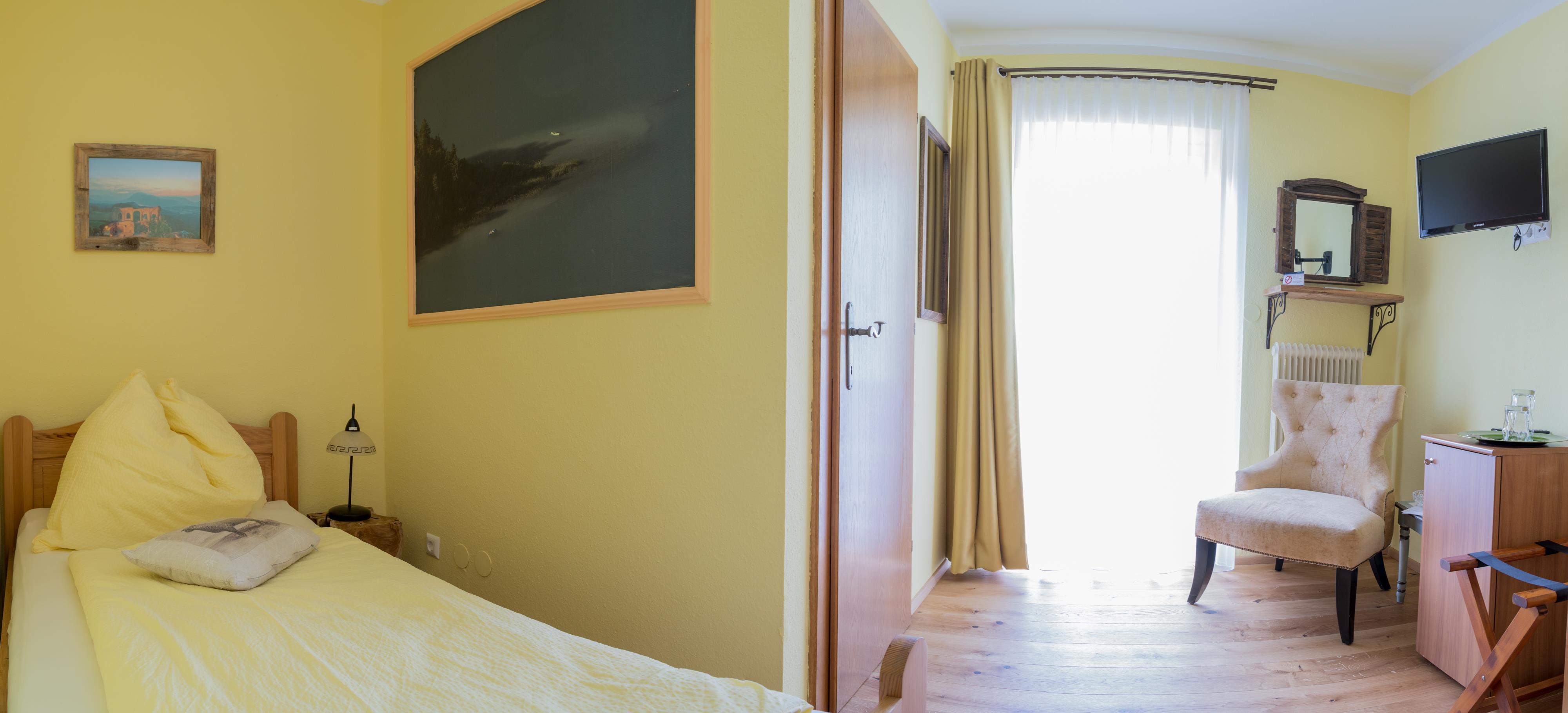 Wir verfügen über 1 Einzelzimmer mit Balkon. Dieses ist mit Dusche, WC, Minibar, Haartrockner, TV-Flachbildschirm, Safe und WLAN ausgestattet. Es liegt auf der ersten Etage. Der Balkon bietet einen herrlichen Blick in die Kärntner Nockberge.