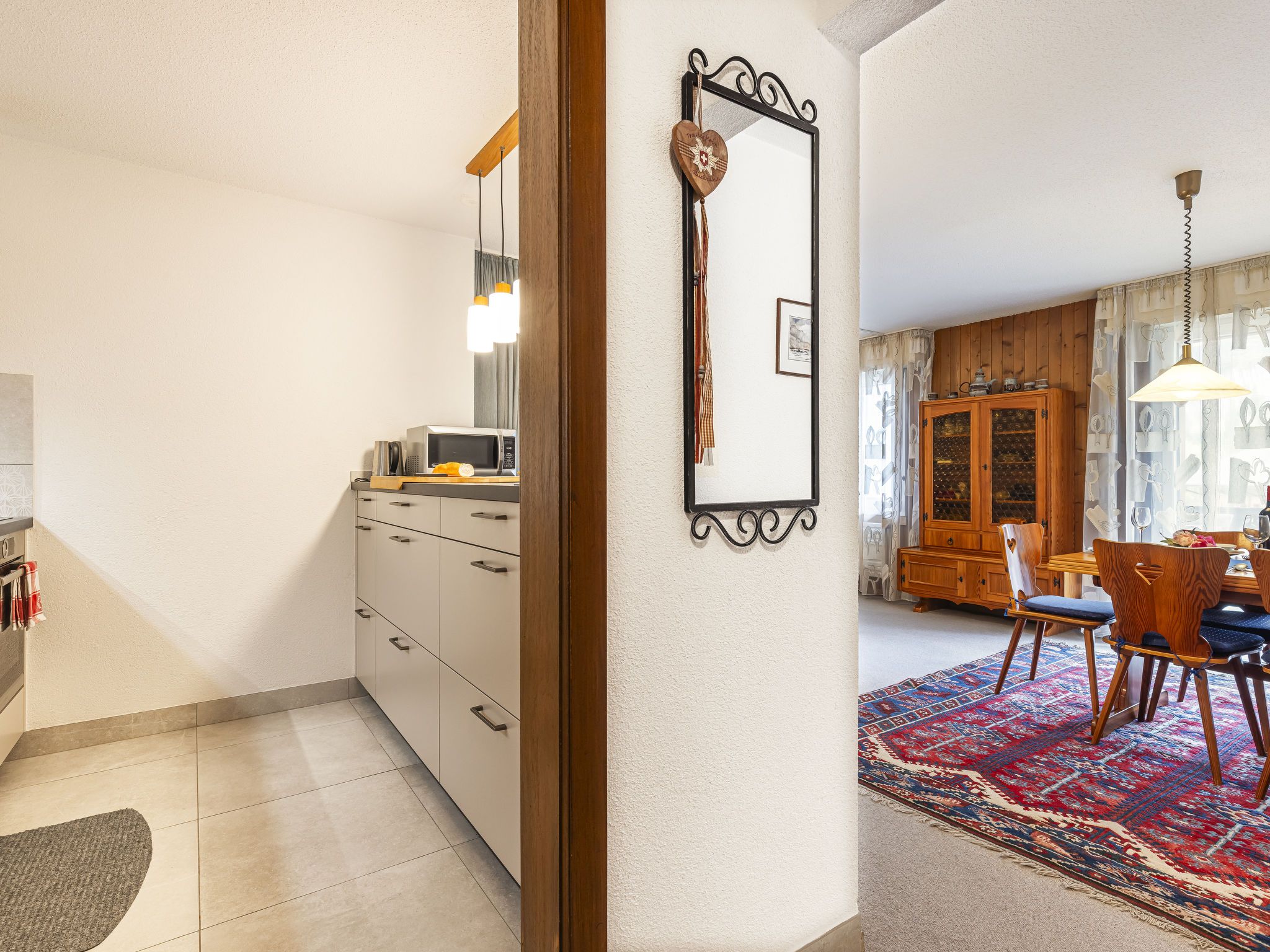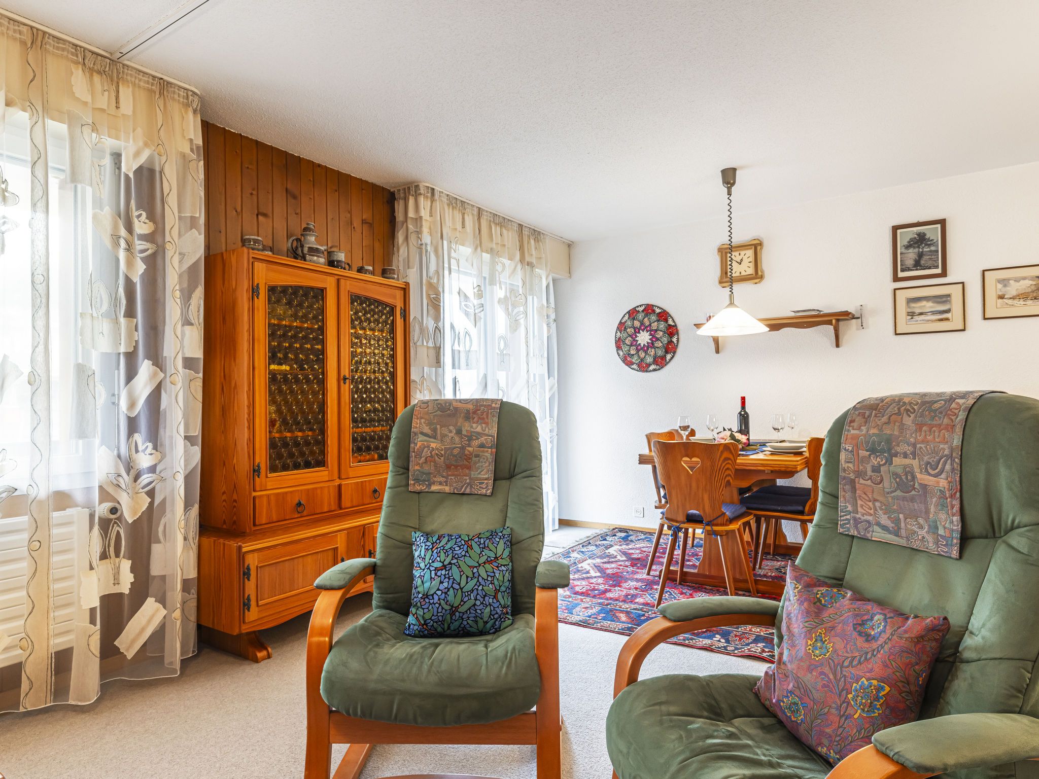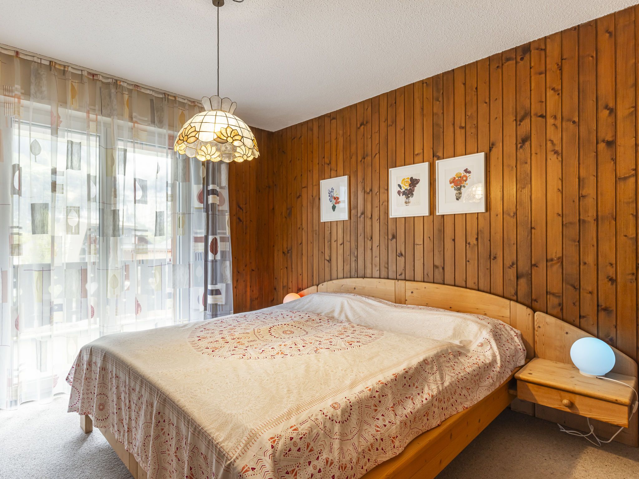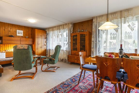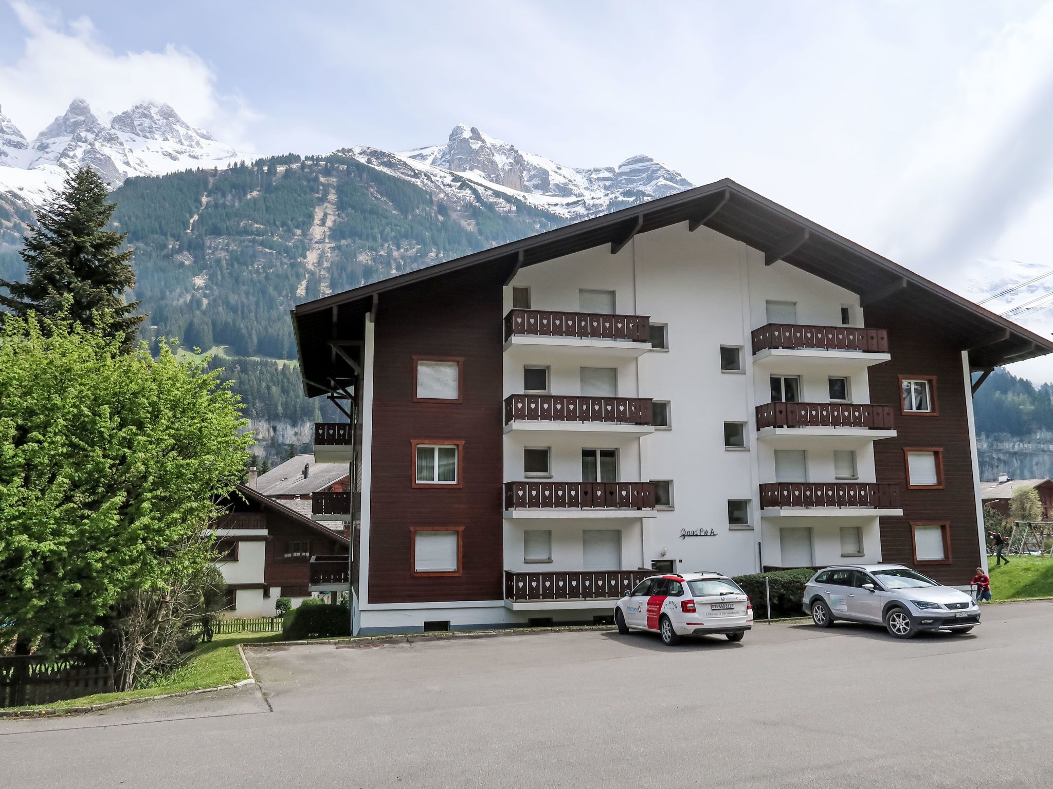Grand-Pré A, 2-Zimmer-Wohnung im 2. Stock. Komfortabel und gemütlich eingerichtet: Wohn-/Schlafzimmer mit 2 Betten (90 cm, Länge 190 cm), TV. Ausgang zum Balkon. 1 Zimmer mit 1 Doppelbett (2 x 90 cm, Länge 200 cm). Ausgang zum Balkon. Offene Küche (Backofen, Geschirrspüler, 4 Glaskeramikplatten, Wasserkocher, Mikrowelle, elektrische Kaffeemaschine, Racletteofen, Fondue Set (Chinoise, Käse)) mit Durchreiche. Bad/WC. Grosser Balkon. Balkonmöbel. Herrliche Sicht auf die Berge, die Landschaft und die Ortschaft. Zur Verfügung: Waschmaschine, Wäschetrockner, Haartrockner. Internet (Wireless LAN). Parkplatz beim Haus. Bitte beachten: Nichtraucher-Unterkunft.