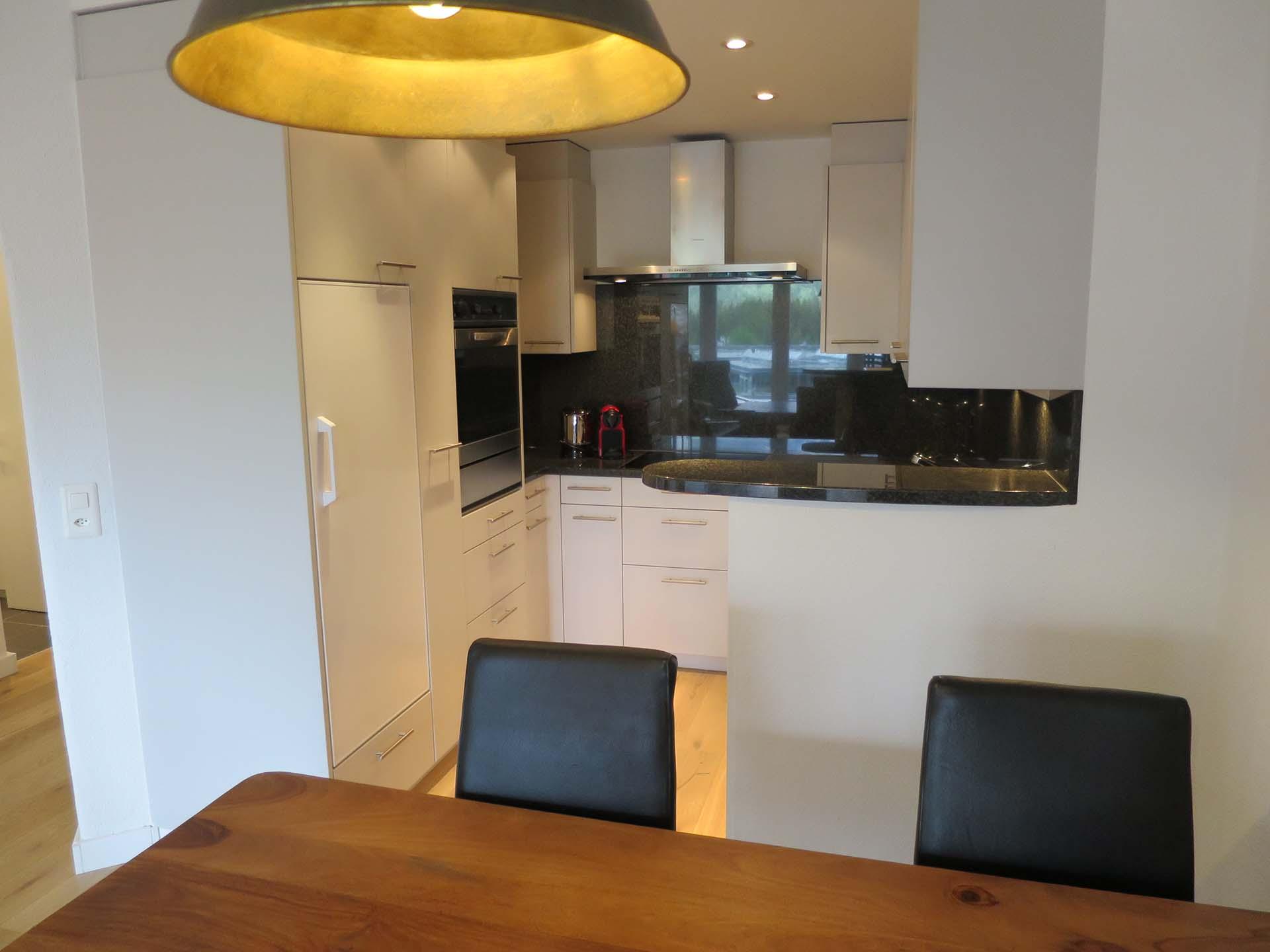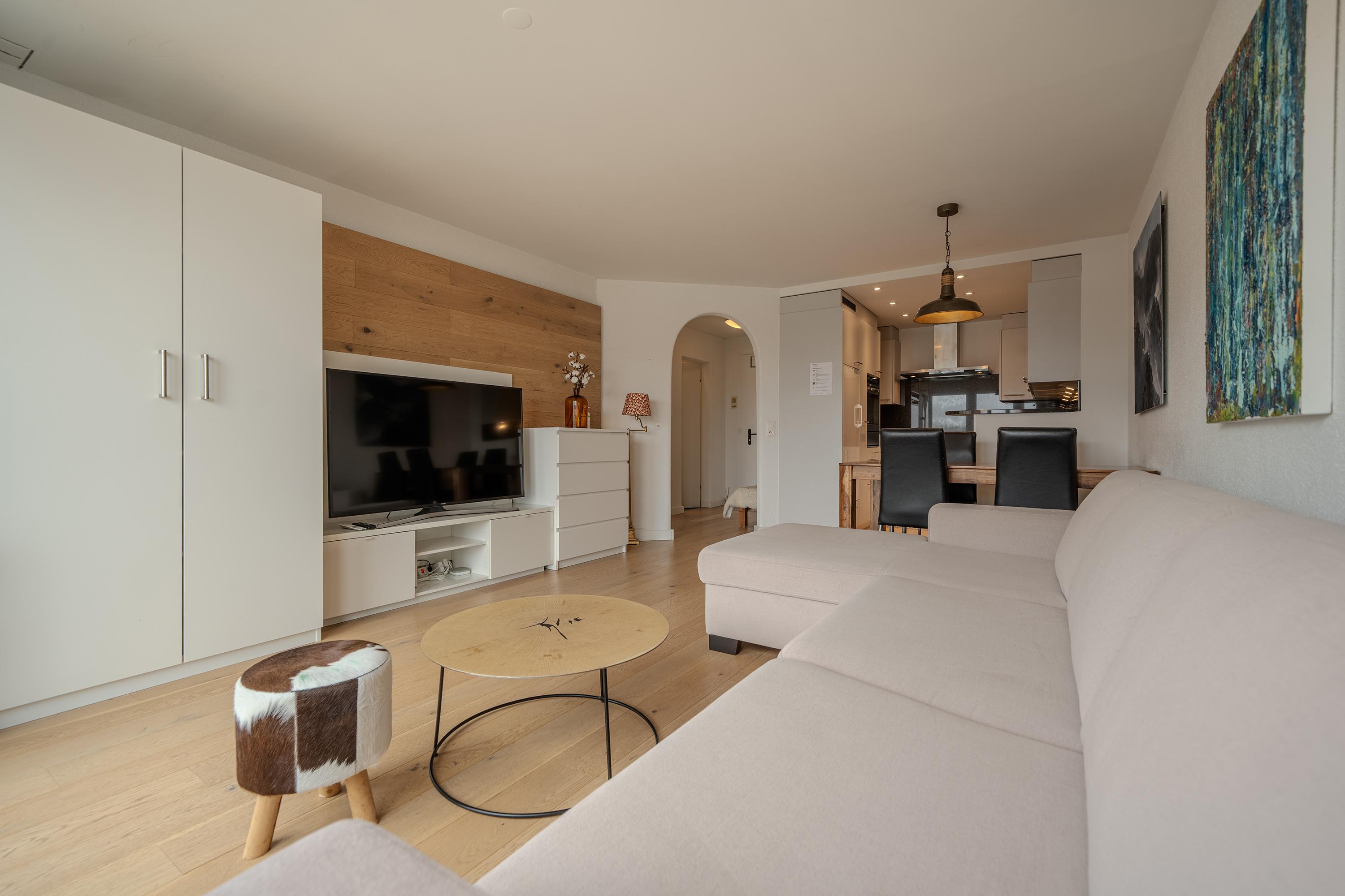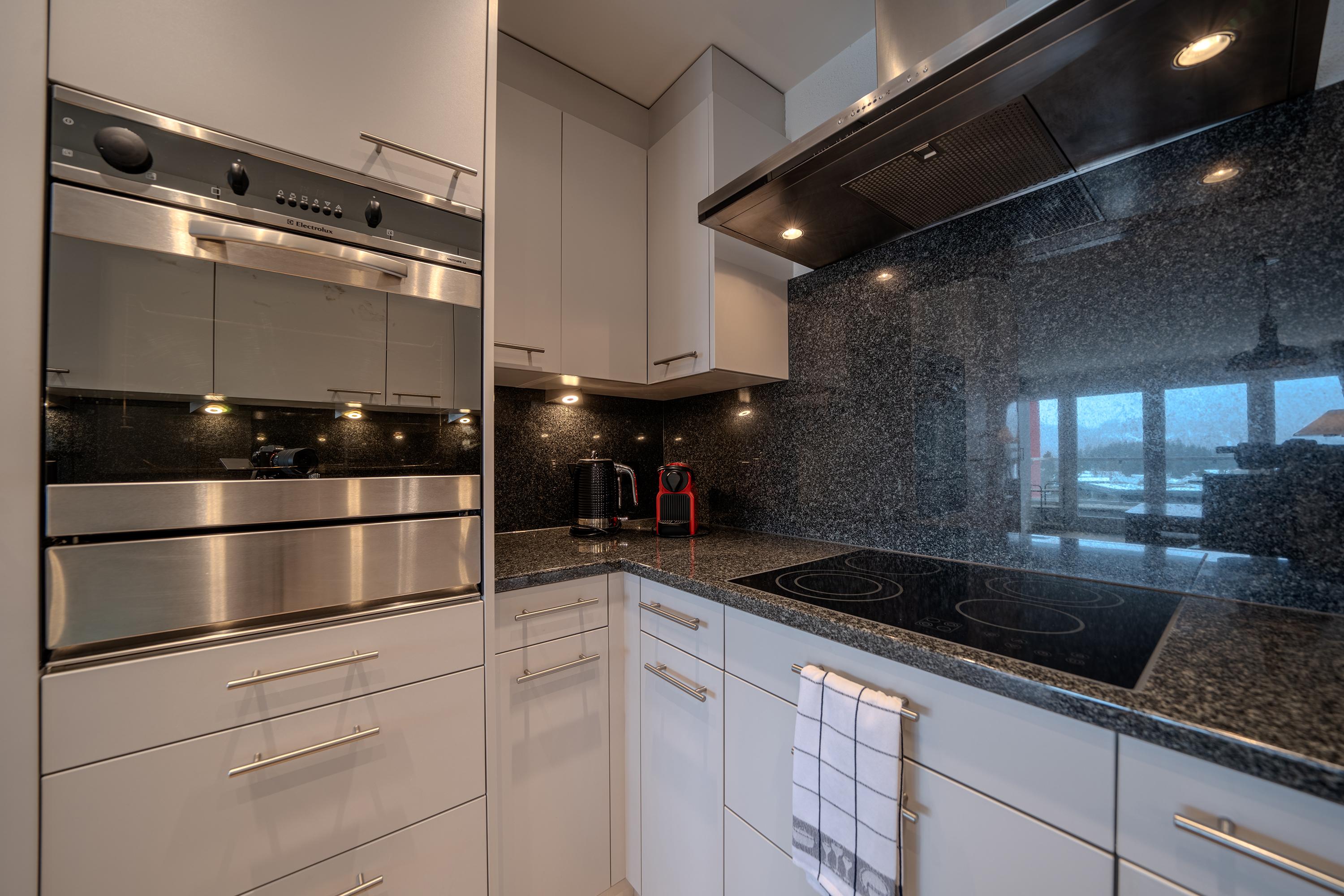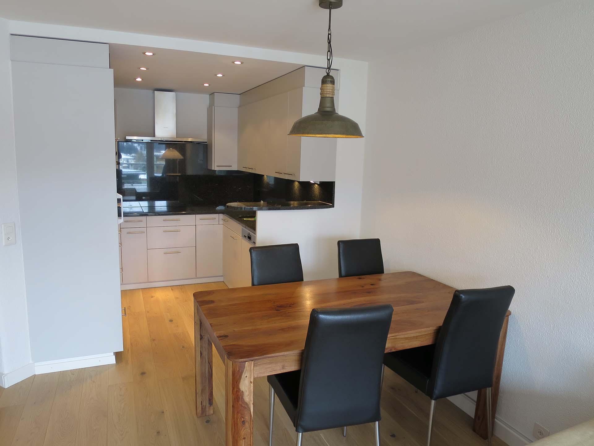 Das Apartment ist geschmackvoll eingerichtet und verfügt über eine voll ausgestattete Küche mit Geschirrspüler, Fondue- und Raclette-Set und einer Nespresso-Kaffeemaschine.