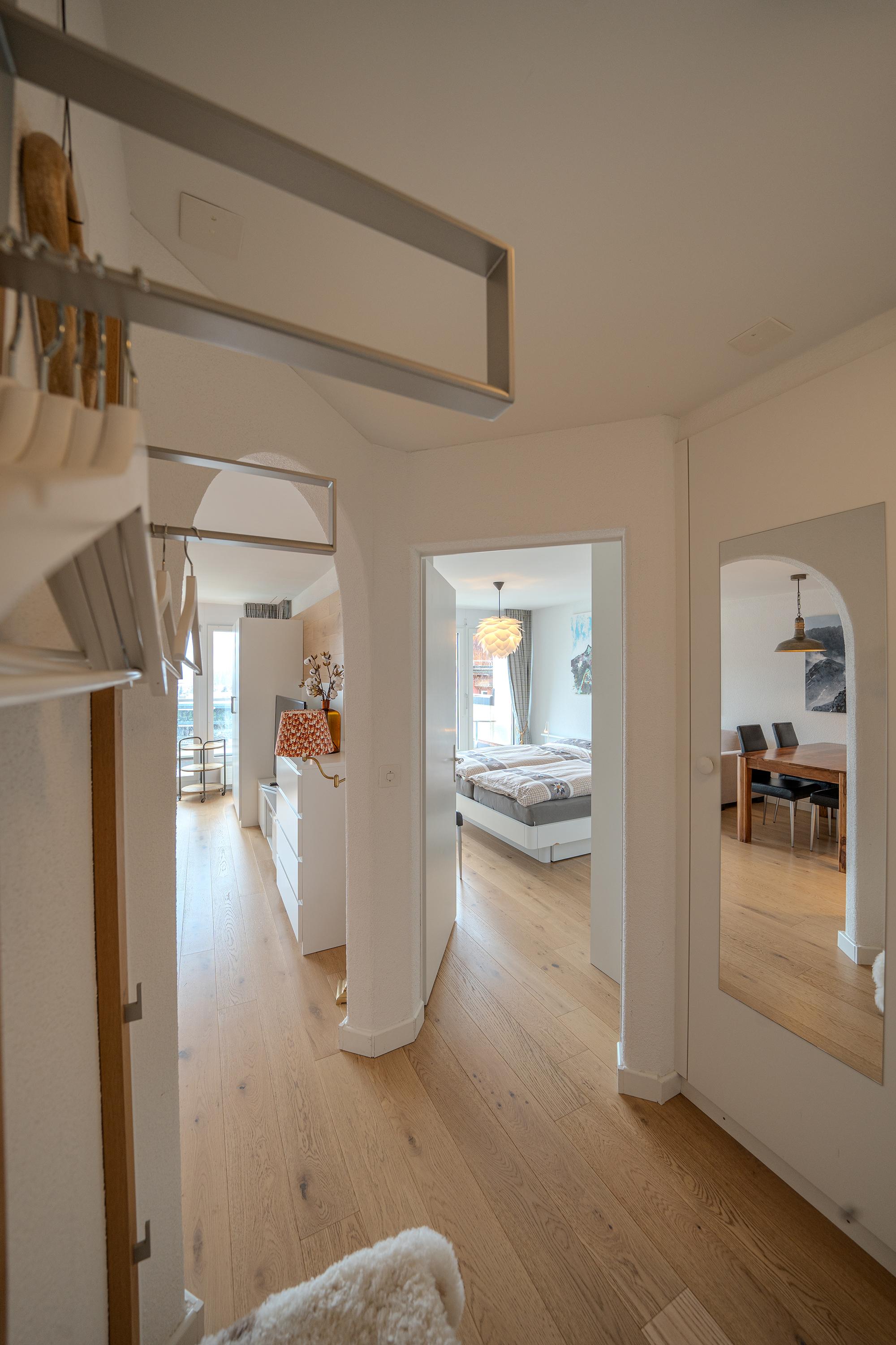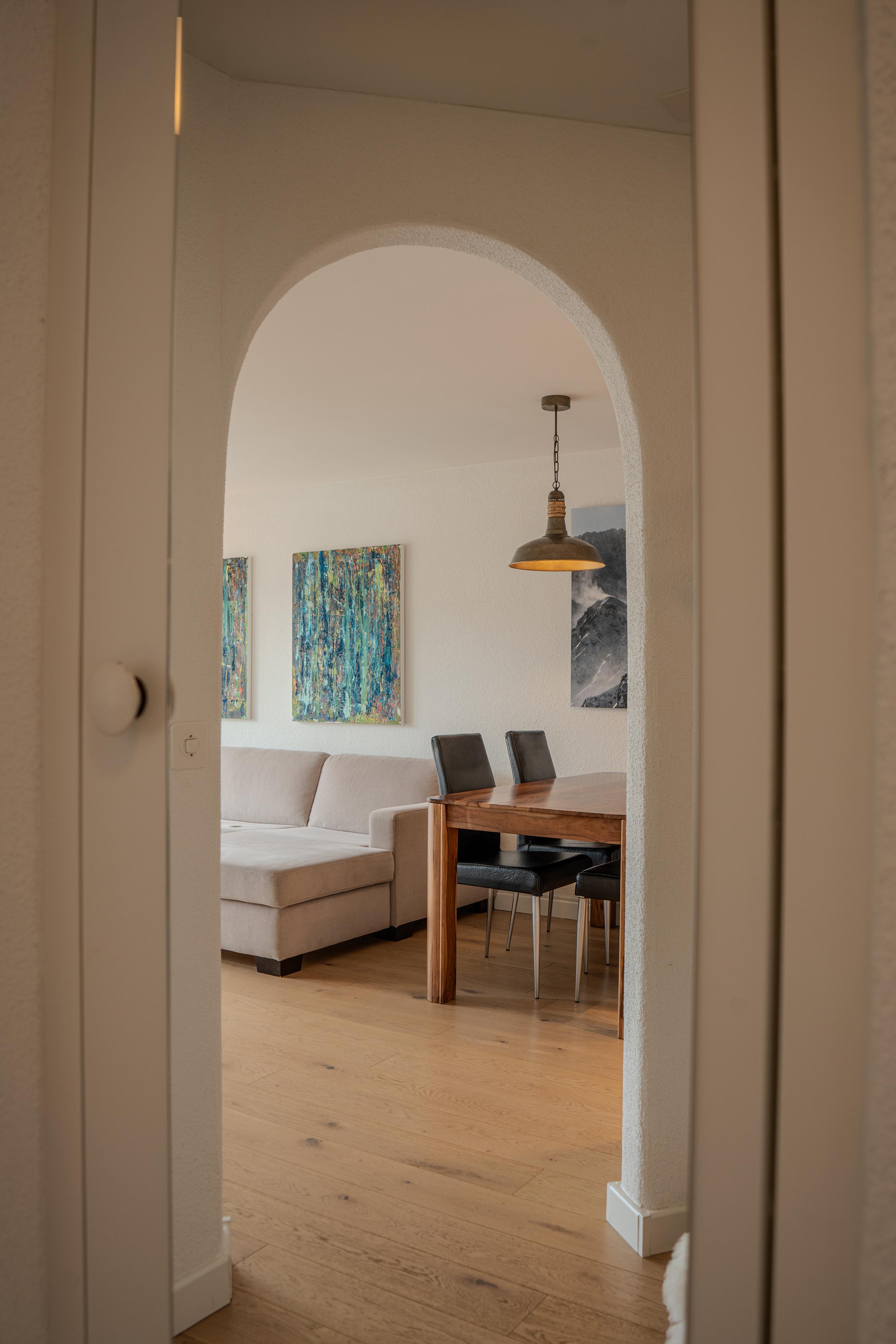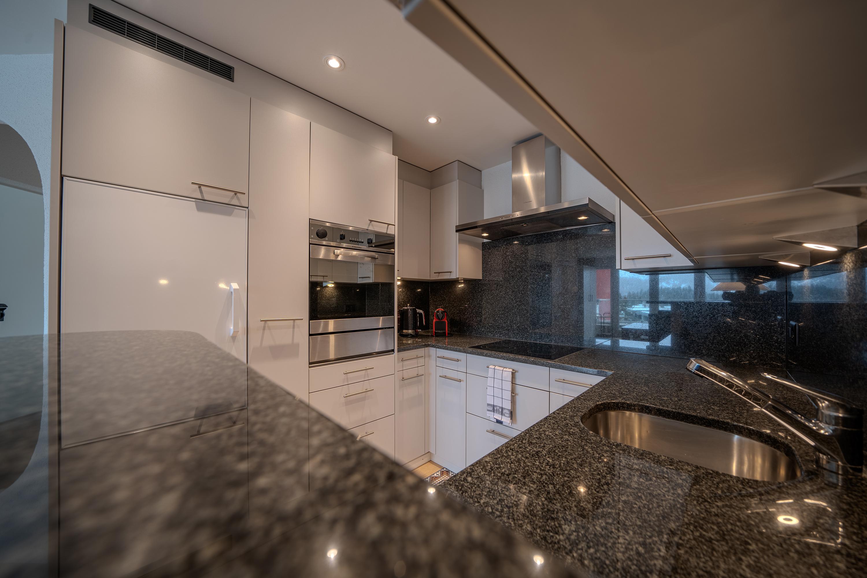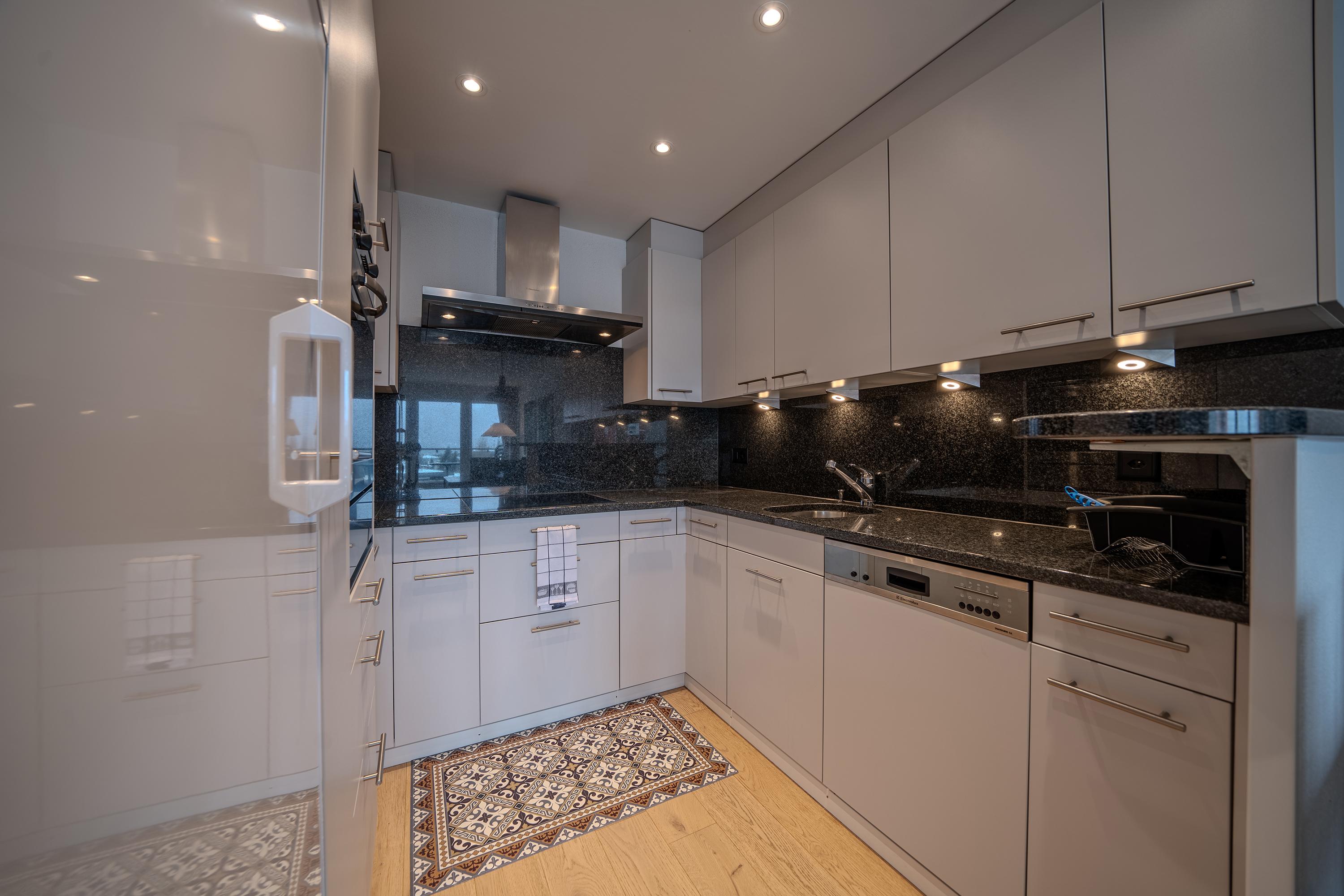 Das Apartment ist geschmackvoll eingerichtet und verfügt über eine voll ausgestattete Küche mit Geschirrspüler, Fondue- und Raclette-Set und einer Nespresso-Kaffeemaschine.