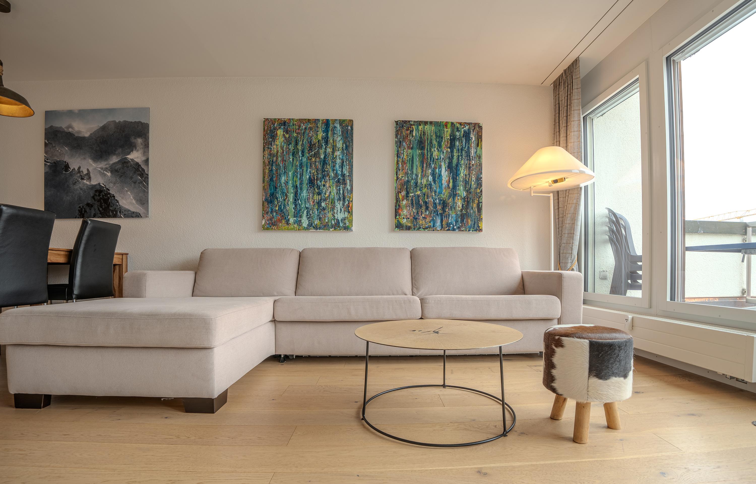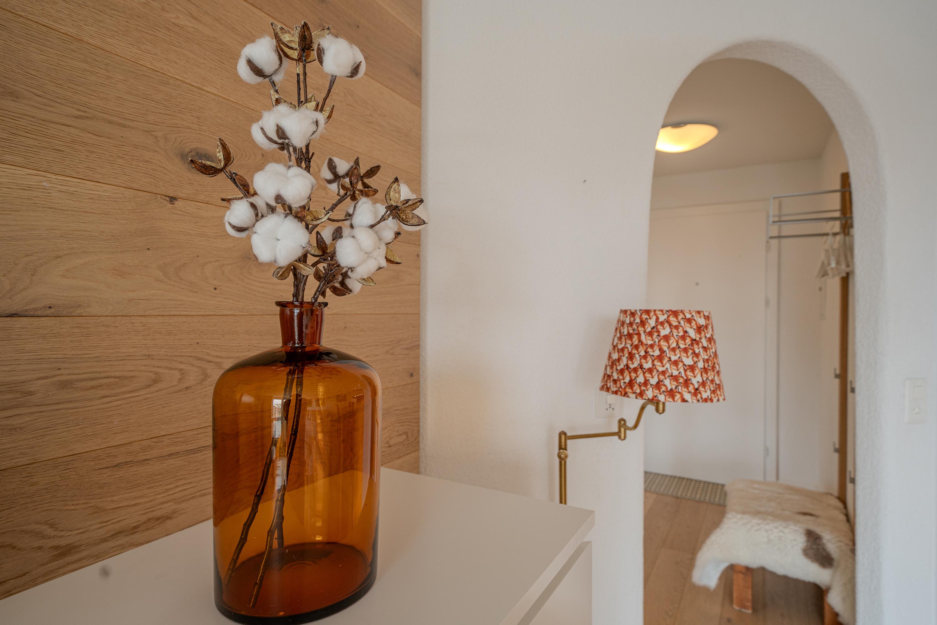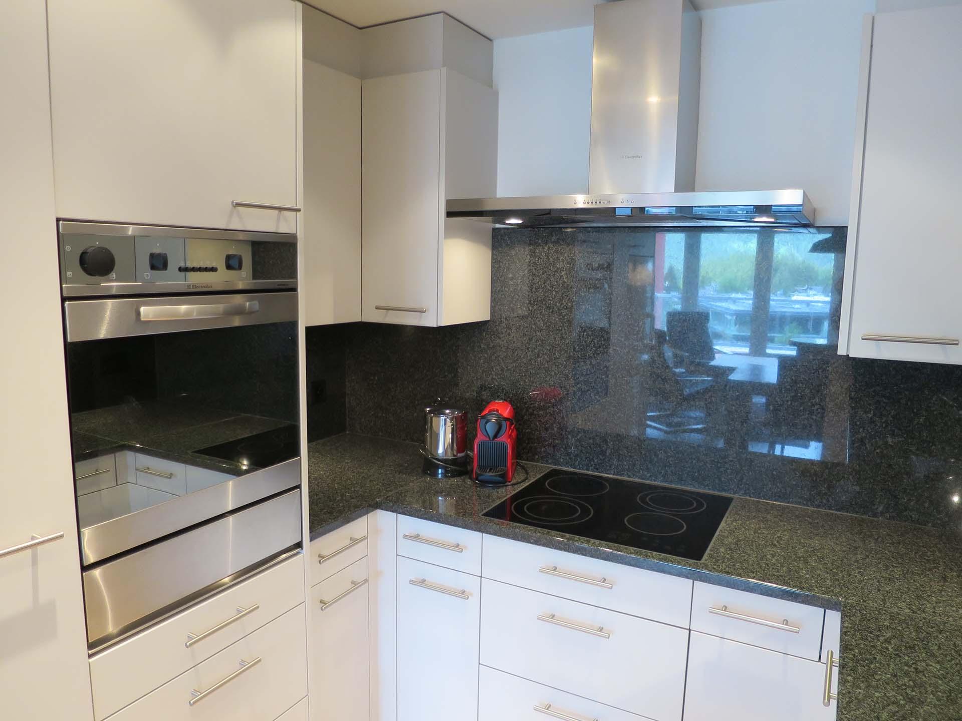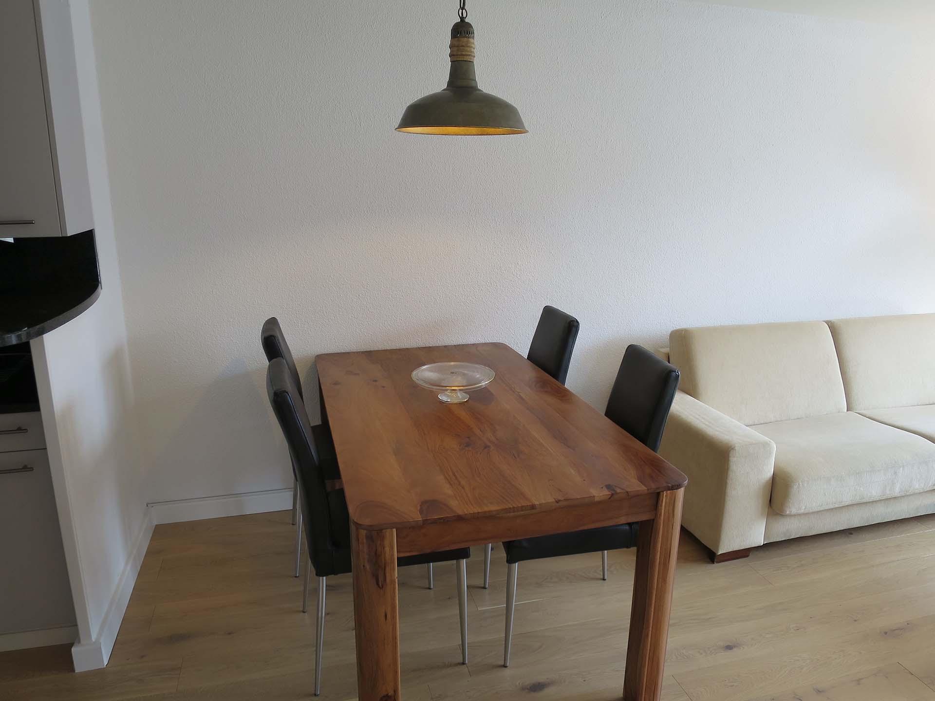 Das Apartment ist geschmackvoll eingerichtet und verfügt über eine voll ausgestattete Küche mit Geschirrspüler, Fondue- und Raclette-Set und einer Nespresso-Kaffeemaschine.