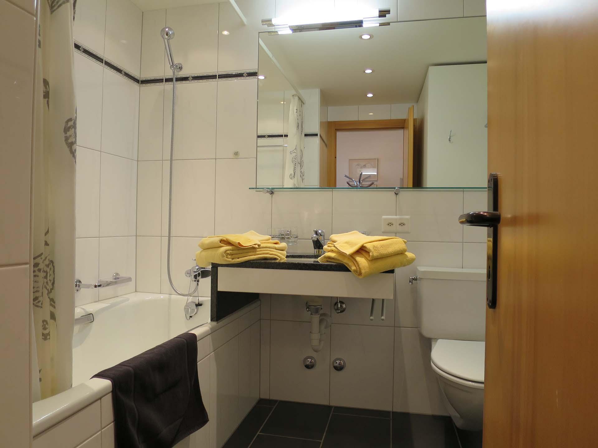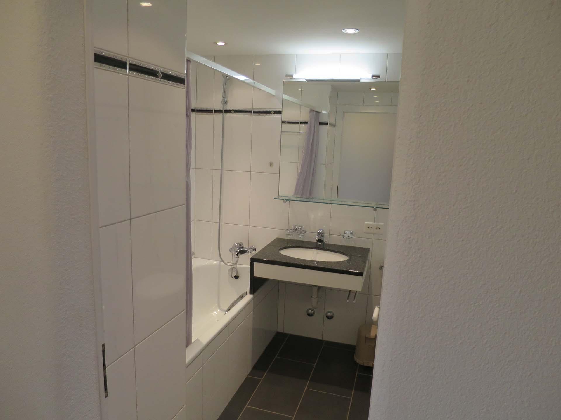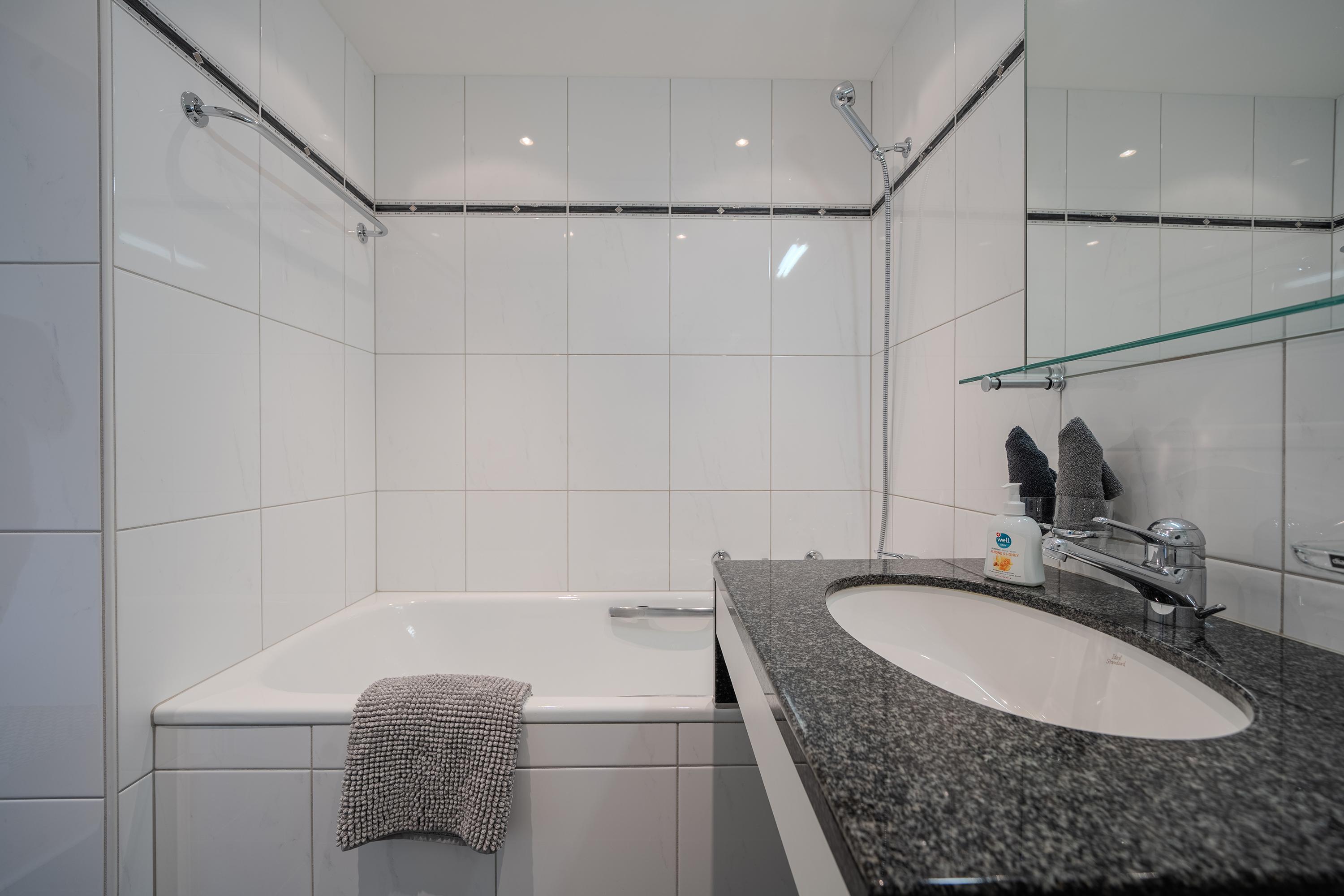 Das Badezimmer verfügt über eine Badewanne und Lavabo.