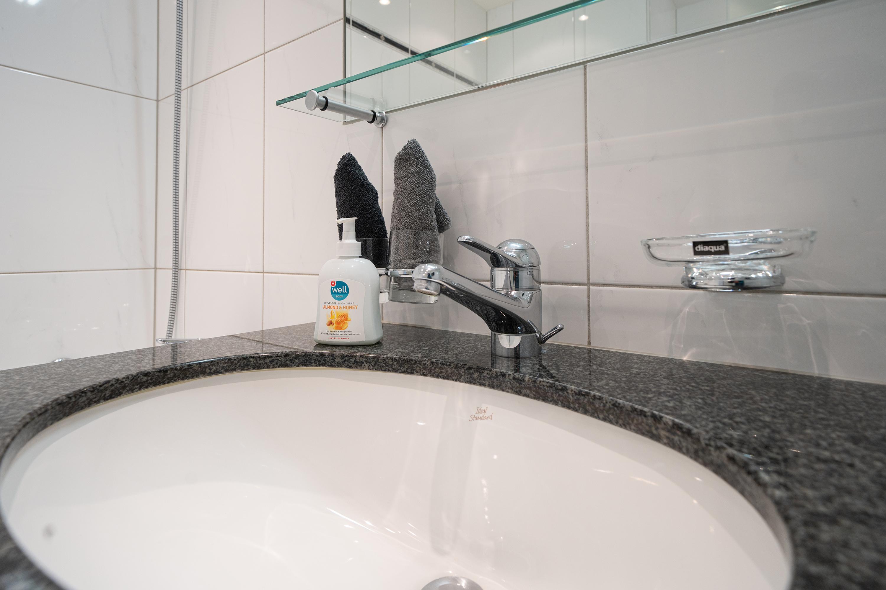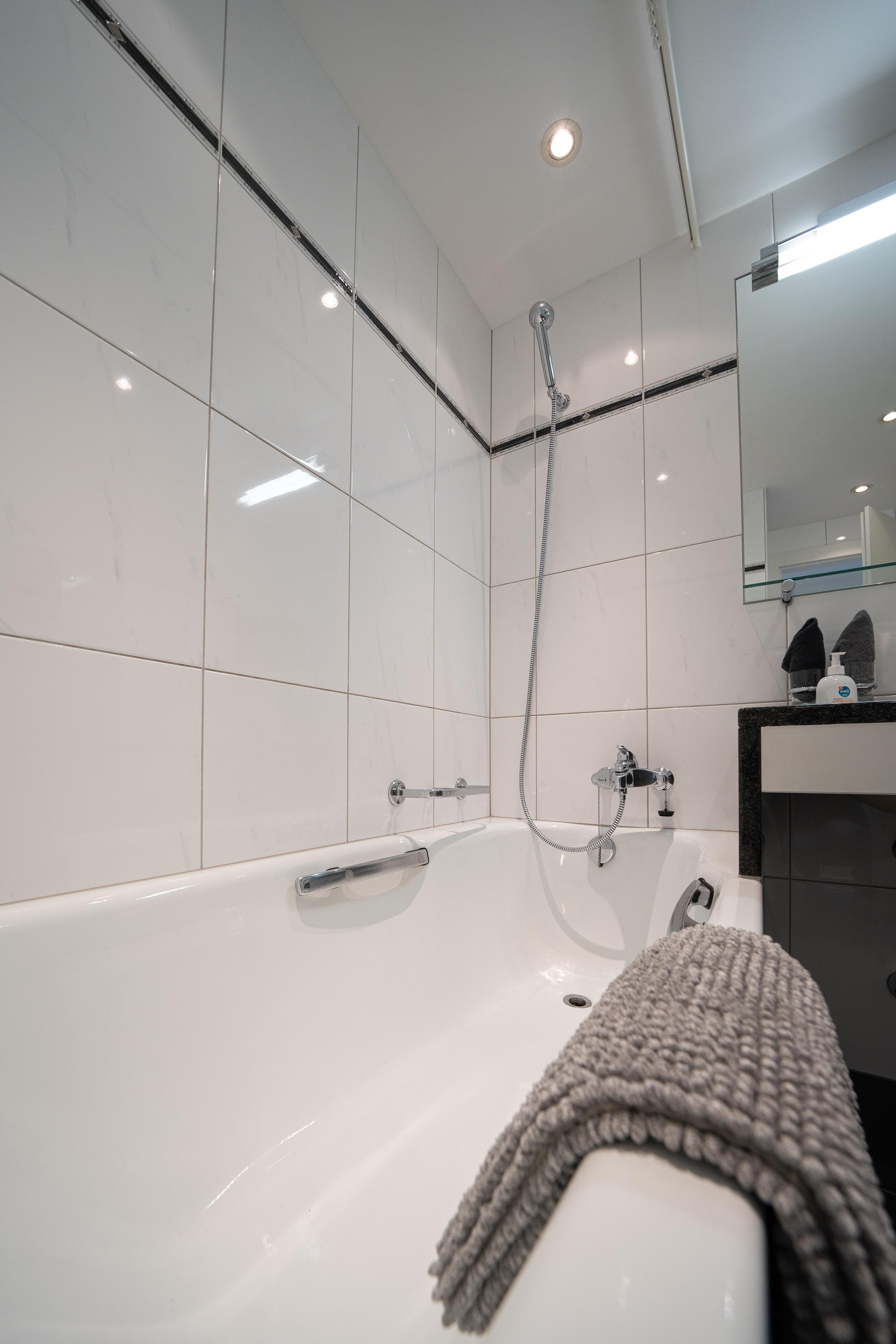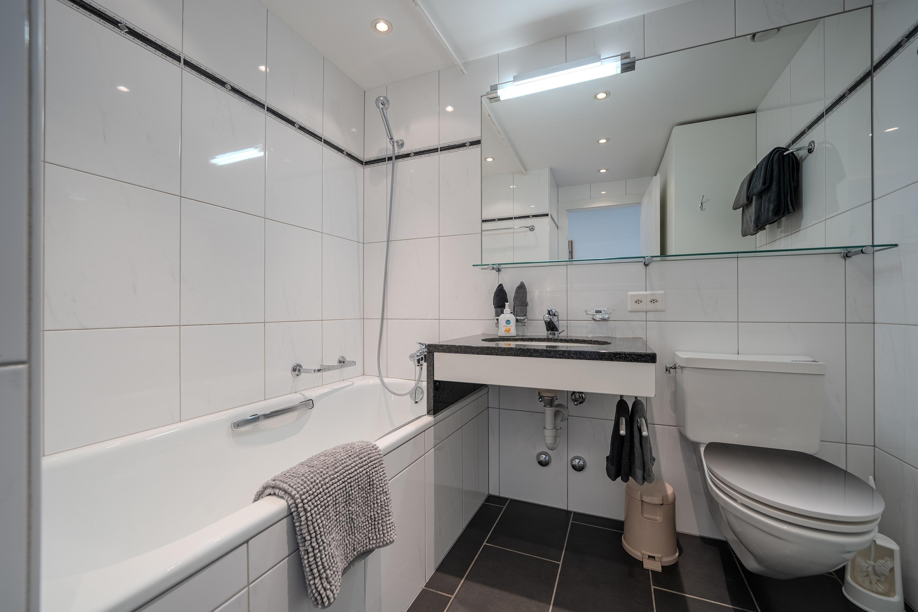 Das Badezimmer verfügt über eine Badewanne und Lavabo.