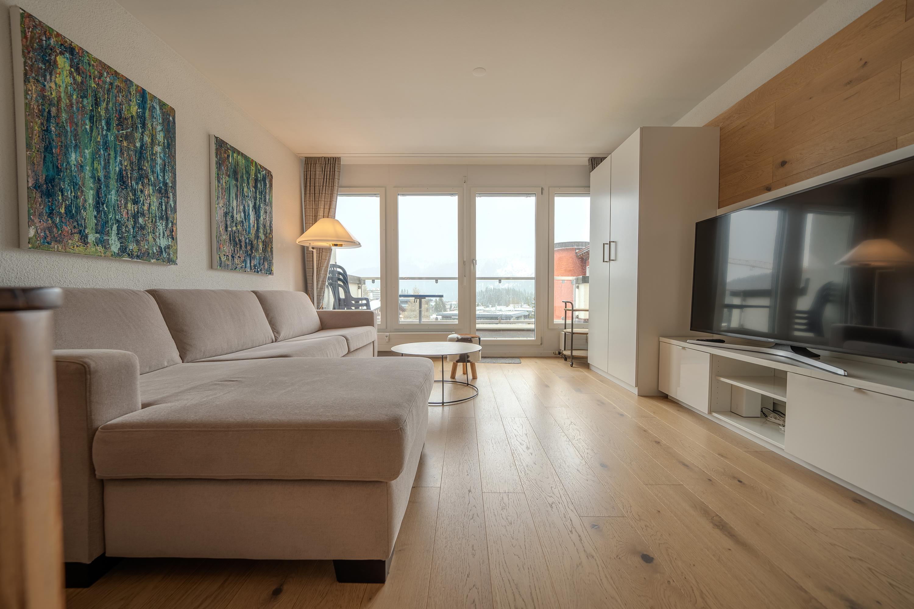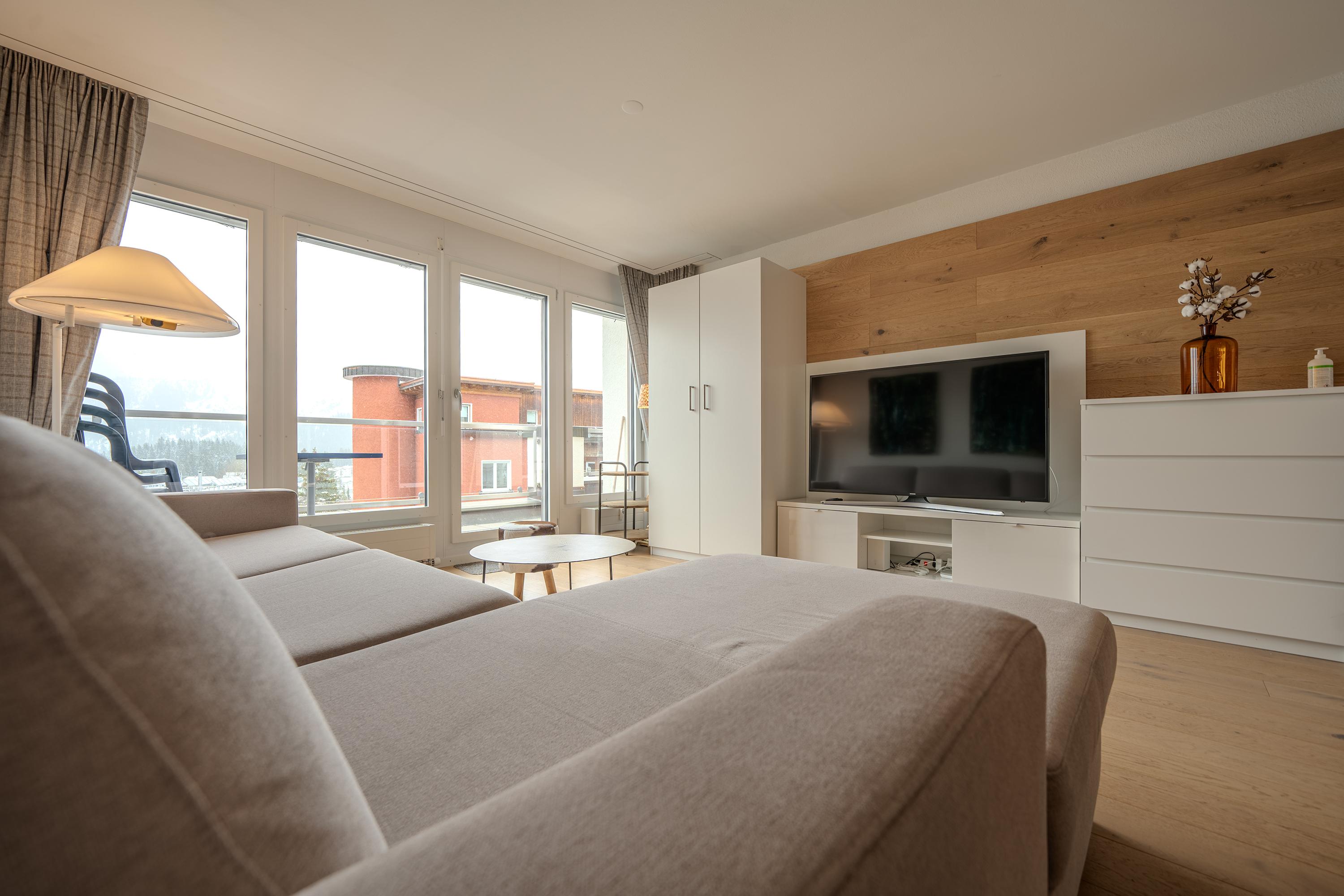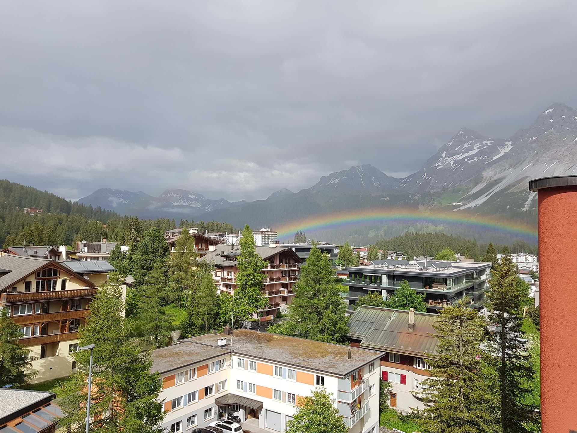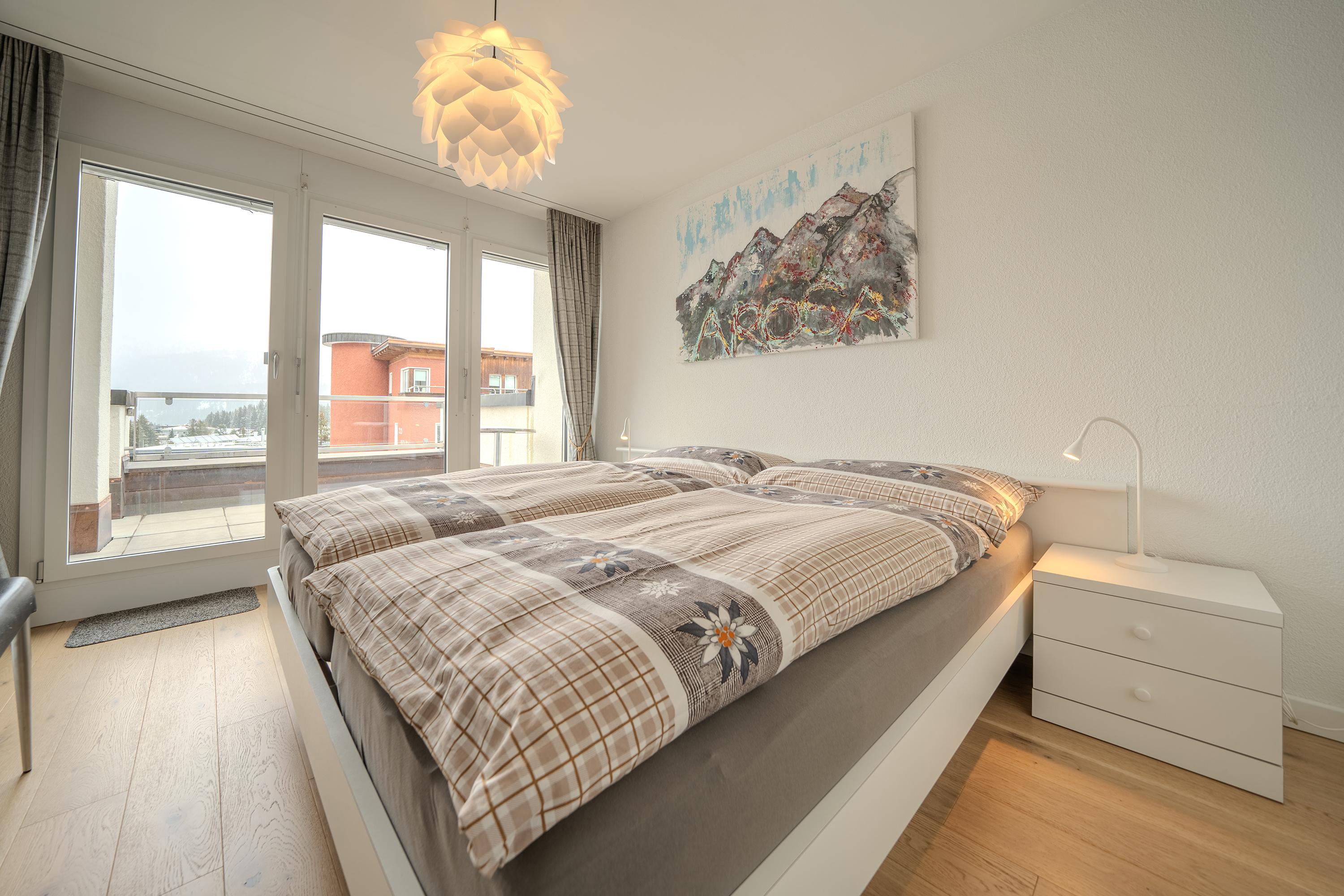 Die Terrasse lädt ein für einen atemberaubenden Ausblick in die Aroser Bergwelt.
