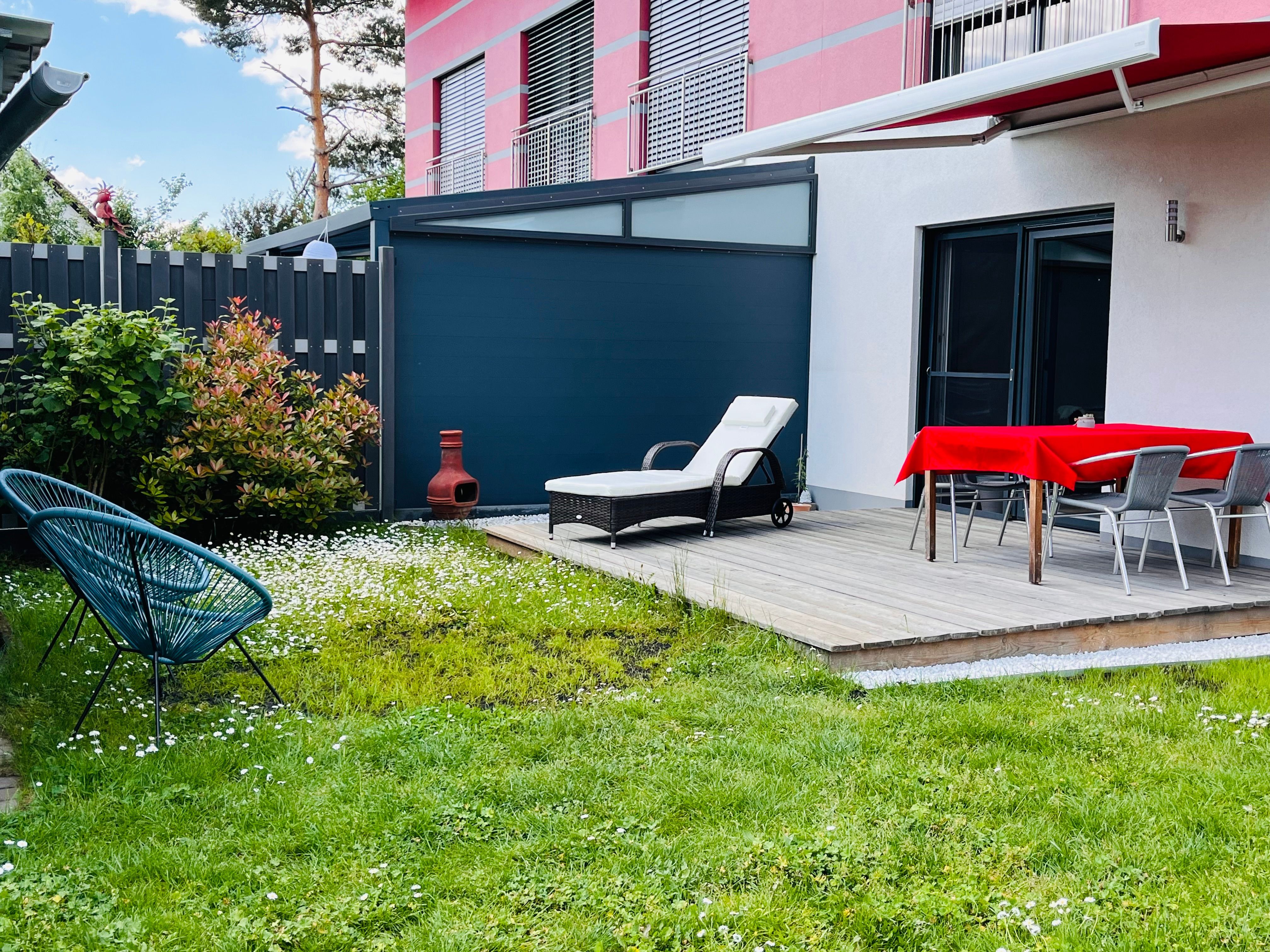Im Erdgeschoss des Doppelhauses liegt die moderne, gut ausgestattete Küche (mit Geschirrspülmaschine etc.) sowie der Wohn-/Essbereich, von dem aus Sie auf die möblierte Terrasse und in den eigenen kleinen Garten gelangen.Im Eingangsbereich ist zudem eine Gästetoilette vorhanden.