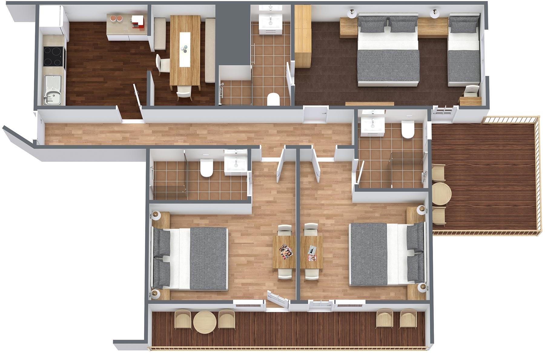 Rustikal ausgestattete Dachgeschoßwohnung mit Wohnküche, 2 separate Doppelzimmer mit Dusche/WC, Haarföhn, Safe und SAT-TV. Bei einer Belegung mit 7 Personen steht noch ein Dreibettzimmer zur Verfügung. Größe ca. 60 m²