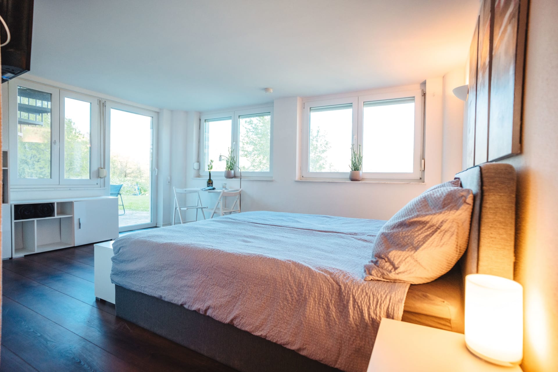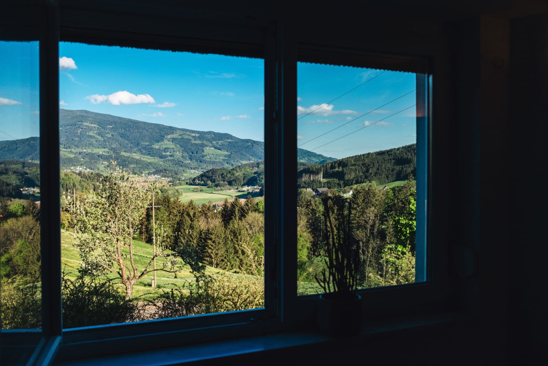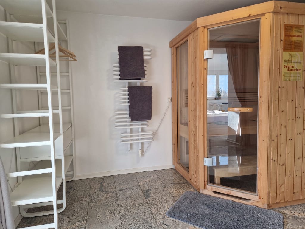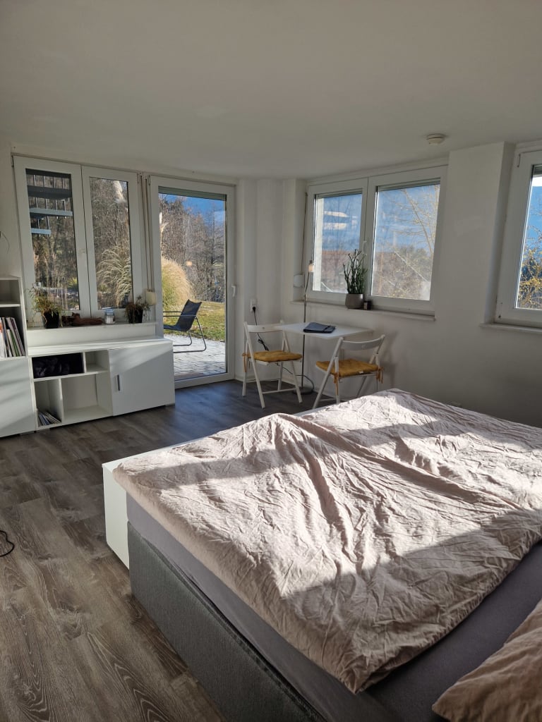 Liebevoll eingerichtete Apartment mit eigener Sauna, wunderbarem Blick über das Tal, Aussicht auf den Schwimmteich, neuer, voll ausgestatteter Küche und eigenem Eingang.