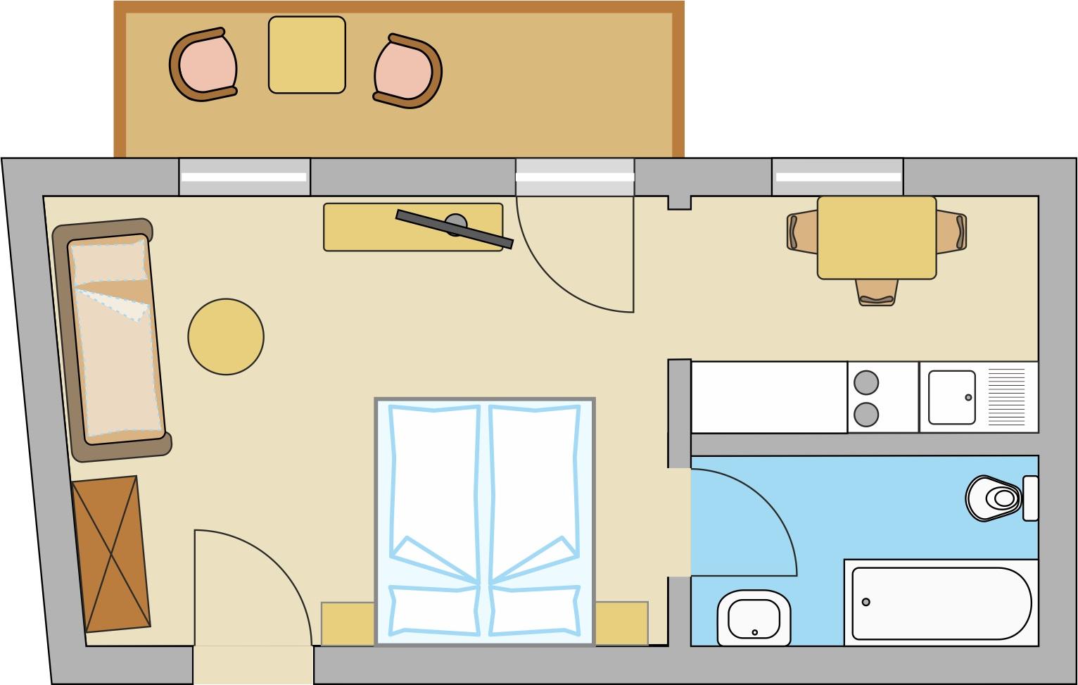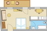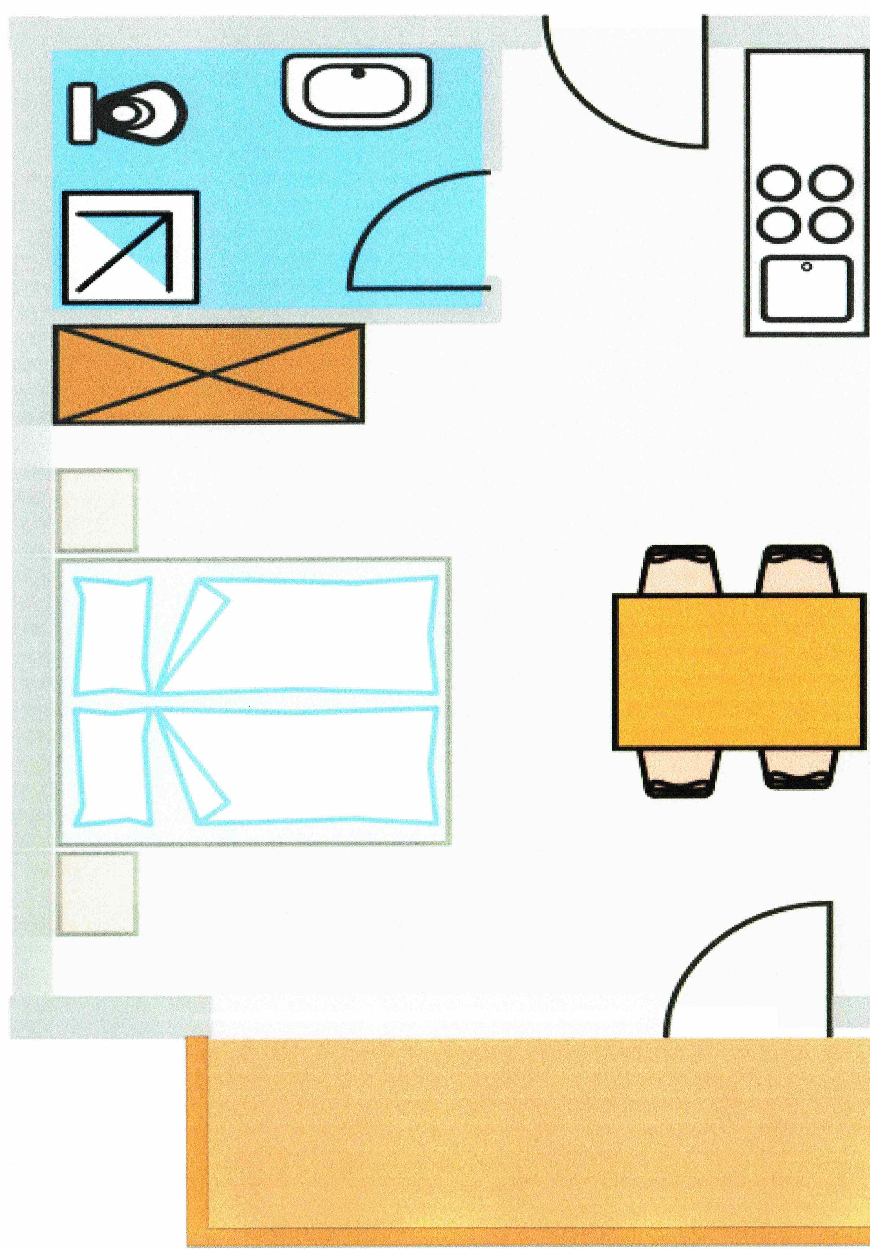 • 1 Zimmer mit Küchenzeile und Sitzecke oder 1 Schlafzimmer mit Schlafsofa, extra Küche mit Sitzecke