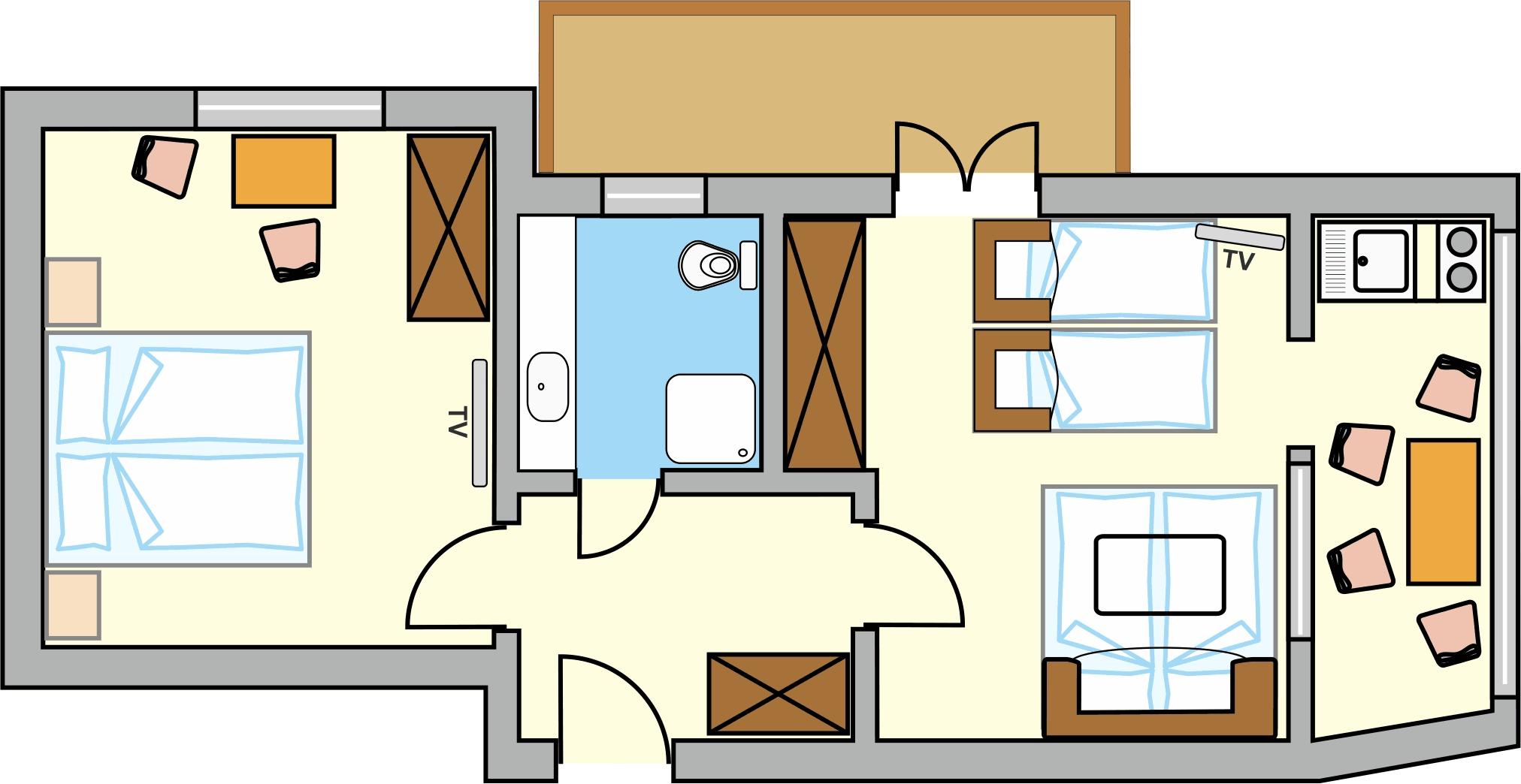 2 Zimmer entweder mit 2 x Doppelbett, Doppelbett und Etagenbett oder Doppelbett und Schlafsofas
