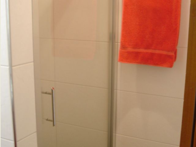 Ein Badezimmer mit Dusche und Lavabo, Spiegelschrank.