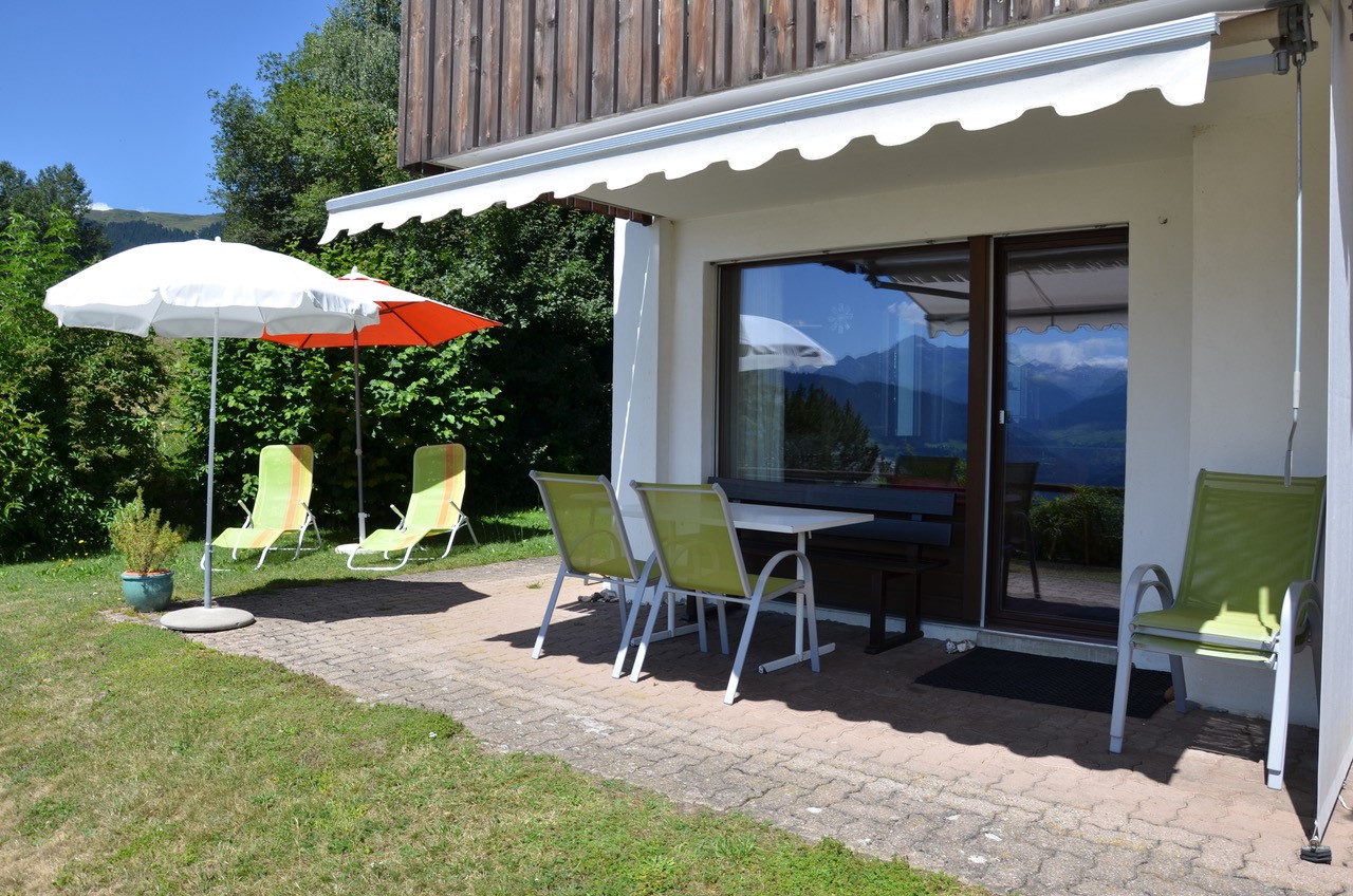 Ein offener Wohnraum zur Küche. Fenster nach Süden (Ausgang zum Gartensitzplatz) und Fenster zur Westseite. Warmluft-Cheminée (Holz steht in der Garage gegen Entgelt zur Verfügung), Esstisch mit Eckbank und 2 Stühlen (2 weitere befinden sich in den Schlafzimmern), Polstergruppe, Klubtische, Flatscreen TV (Kabelfernsehen) und Blue-ray DVD Player, Radio mit CD Player. W-LAN vorhanden.