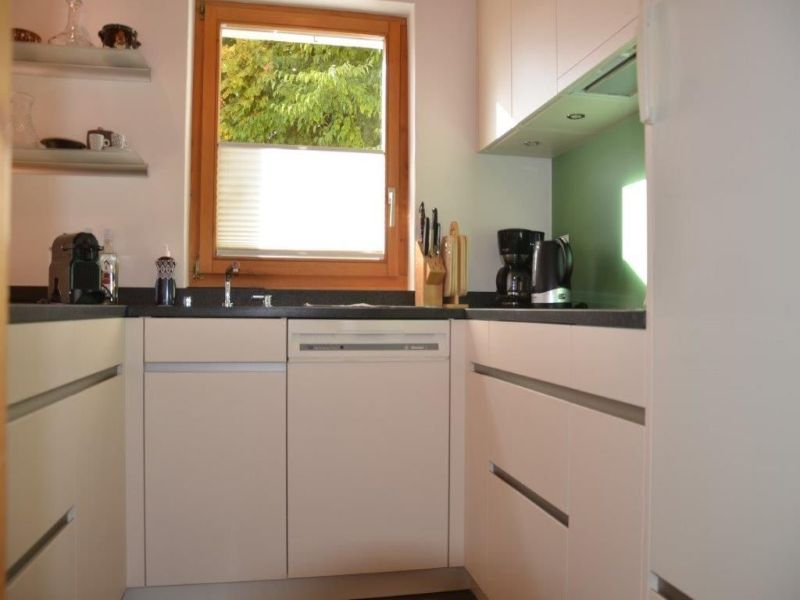 Die moderne Küche (mit Fenster zur Westseite) ist komplett ausgestattet: Kochherd (Induktion), Backofen auf Sichthöhe, grosser Kühlschrank mit Tiefkühlfach, Geschirrspülmaschine, Filterkaffeemaschine, Nespresso-Kaffeemaschine (Kapseln werden nicht gestellt), Raclette- und Fondueset, Toaster, Handmixer, Wasserkocher etc.