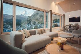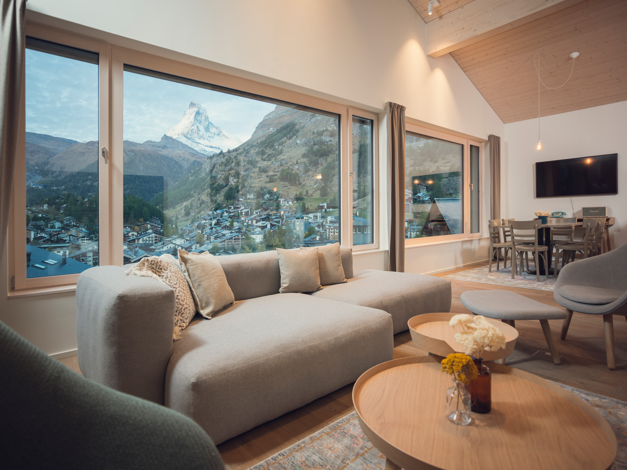 Ob schneebedeckt oder in frischem Grün, verweilen und auf sich wirken lassen. Zum Beispiel beim Kochen mit Blick auf das Matterhorn oder beim gemütlichen Buch auf dem Sofa vor dem Kamin. Das Penthouse bietet viel Raum, um zu entspannen und für geselliges Beisammensein.