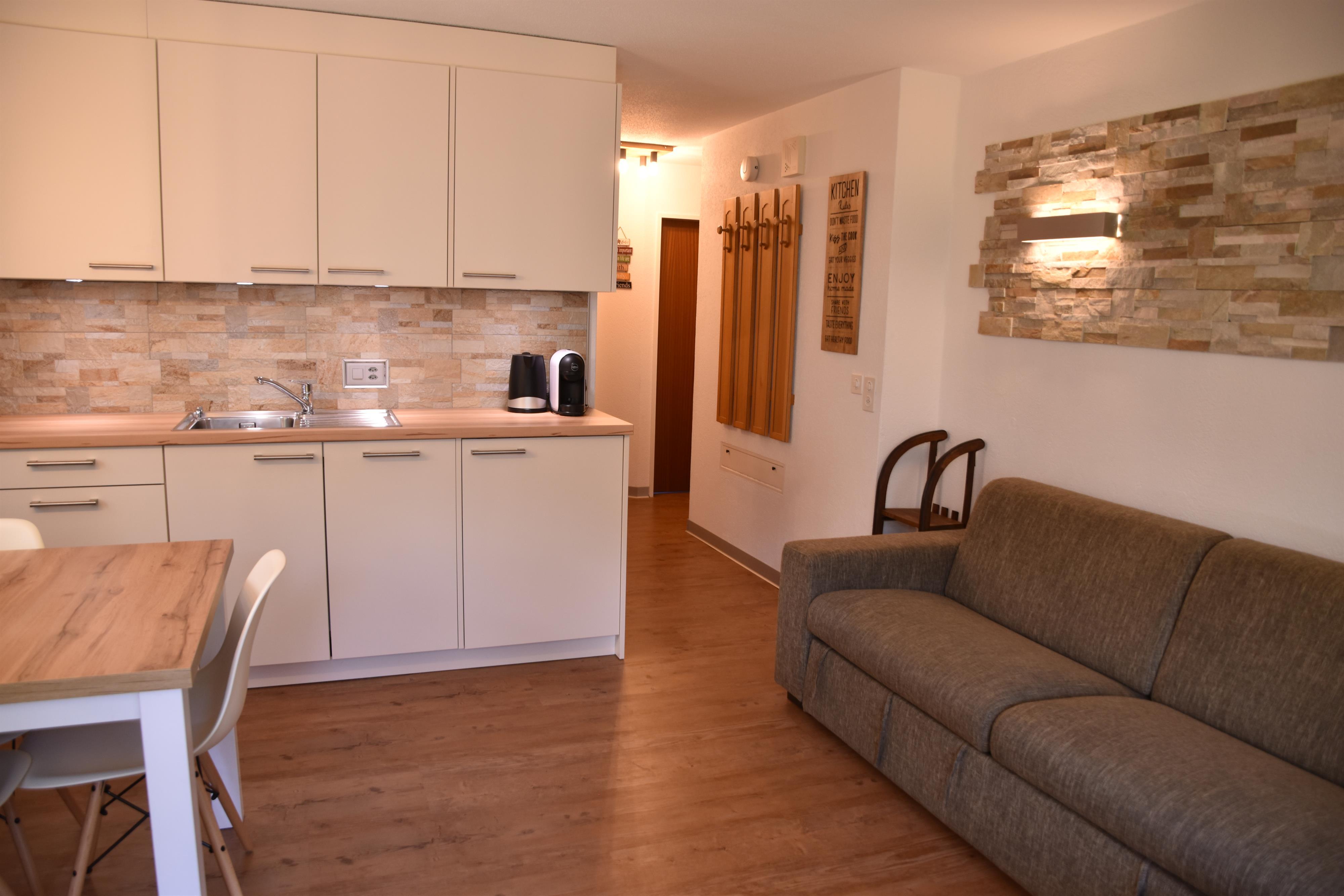Offener Wohn- / Essbereich mit Küche. Flat TV und WLAN kostenlos. Ausgang zu Südbalkon.