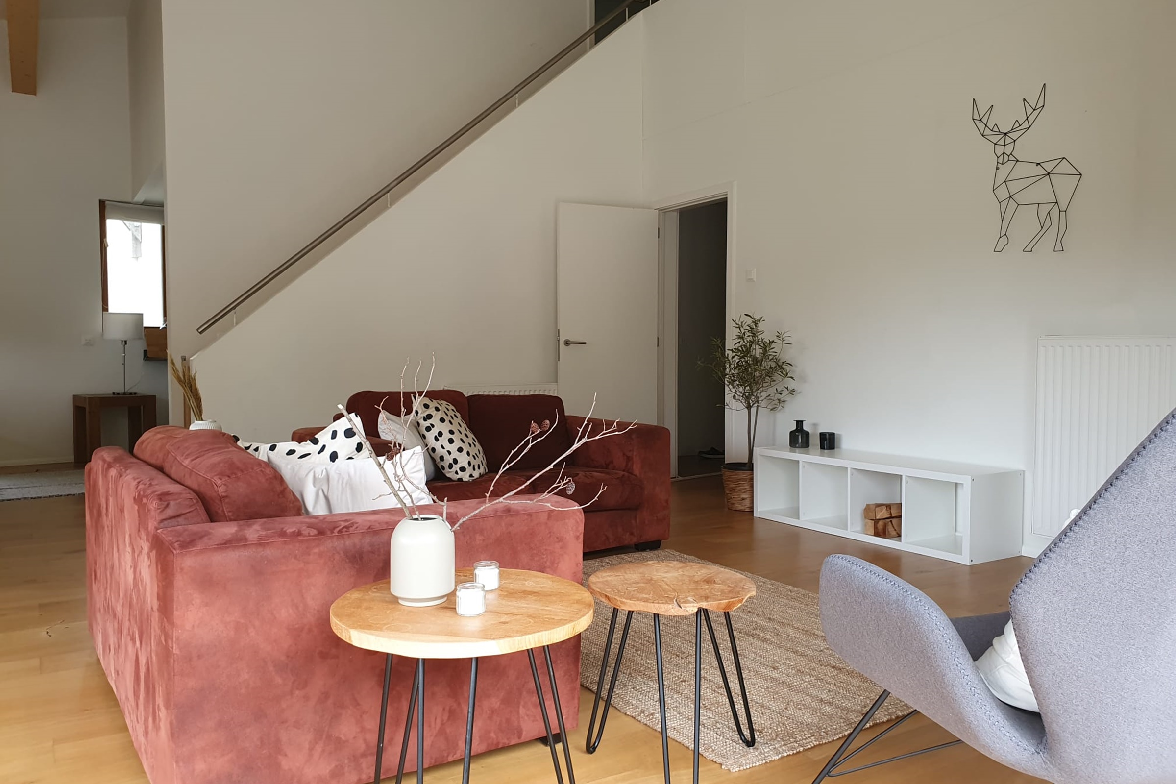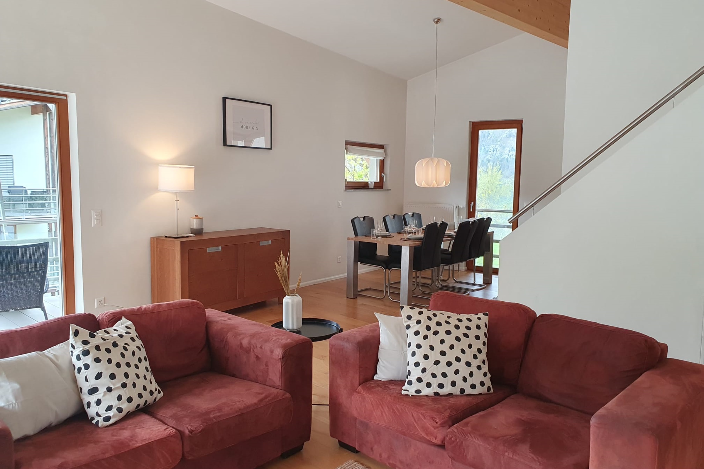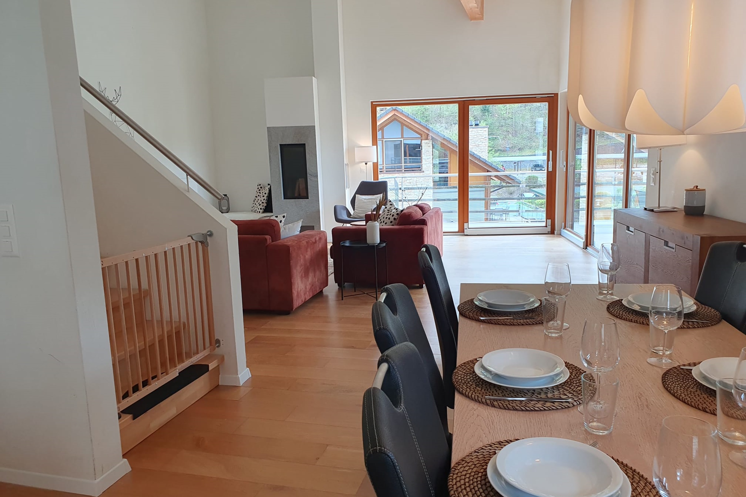 Gemütliches Wohnzimmer mit zwei Sofas, einem Essbereich und ein Cheminée.Küche
